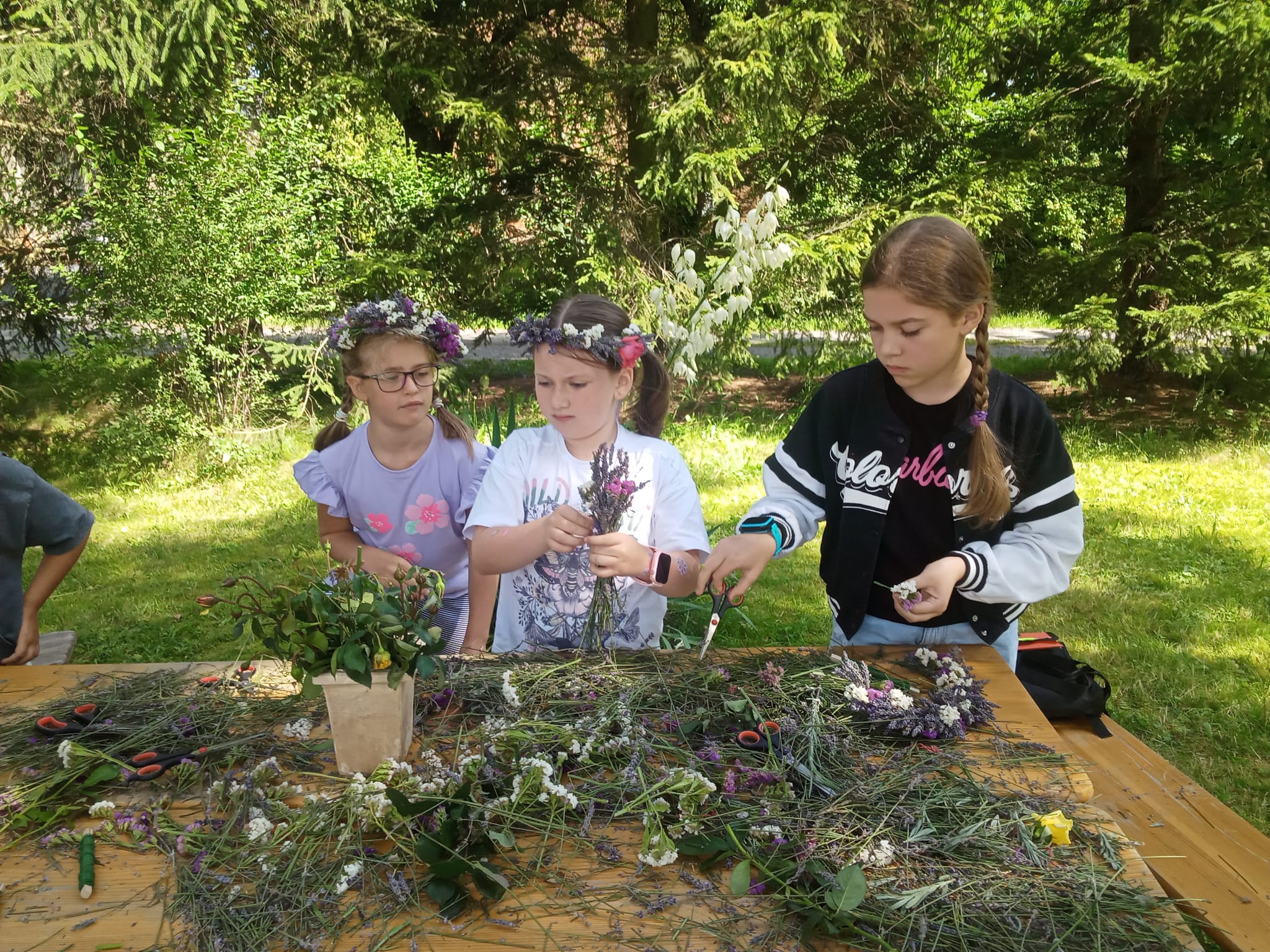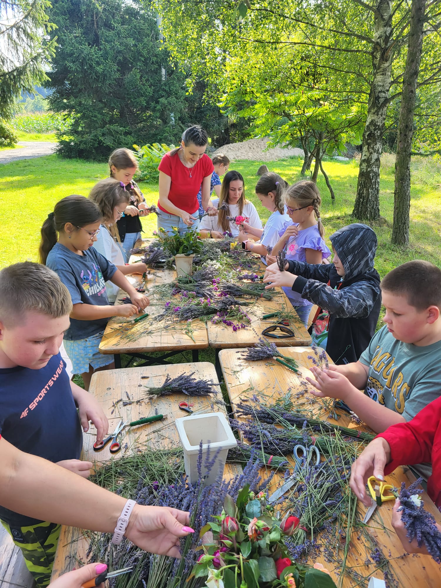 Najwięcej radości przyniosła część praktyczna. Pod czujnym okiem pani instruktorki każdy uczestnik mógł własnoręcznie wypleść wianek z suszonej lawendy wzbogacony innymi kwiatami i trawami. Tworzeniu towarzyszył śmiech, rozmowy i… jeszcze więcej zapachu lawendy unoszącego się w powietrzu.