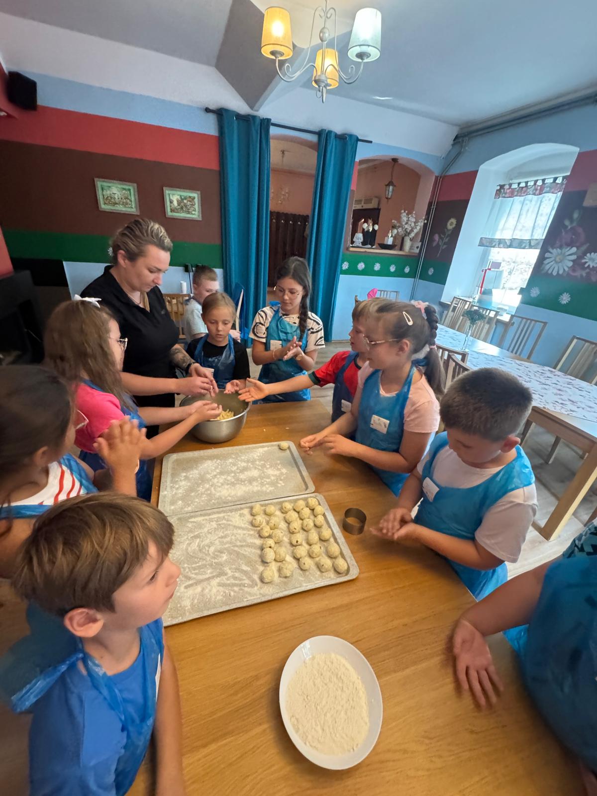W ramach poszerzania wiedzy o tradycjach kulinarnych dzieci uczestniczące w wakacyjnych zajęciach w bibliotece 13 sierpnia 2025 r. wybrały się na warsztaty przygotowywania pierogów.