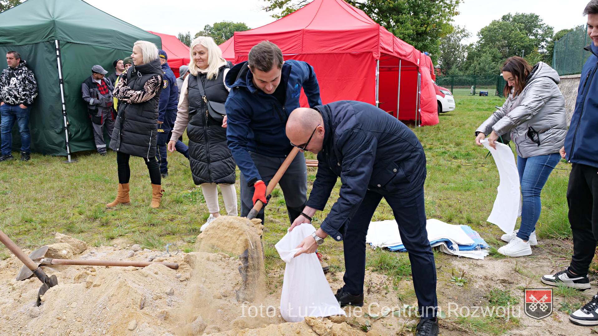 W trakcie szkolenia napełniano worki piaskiem, budując z nich wały przeciwpowodziowe. Układano również rękawy przeciwpowodziowe.