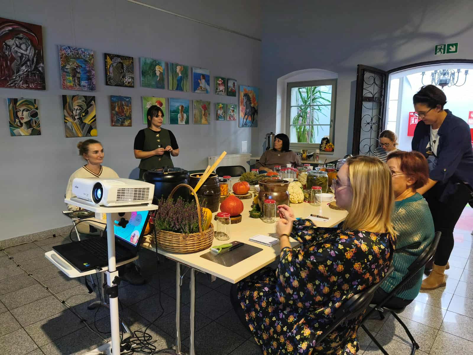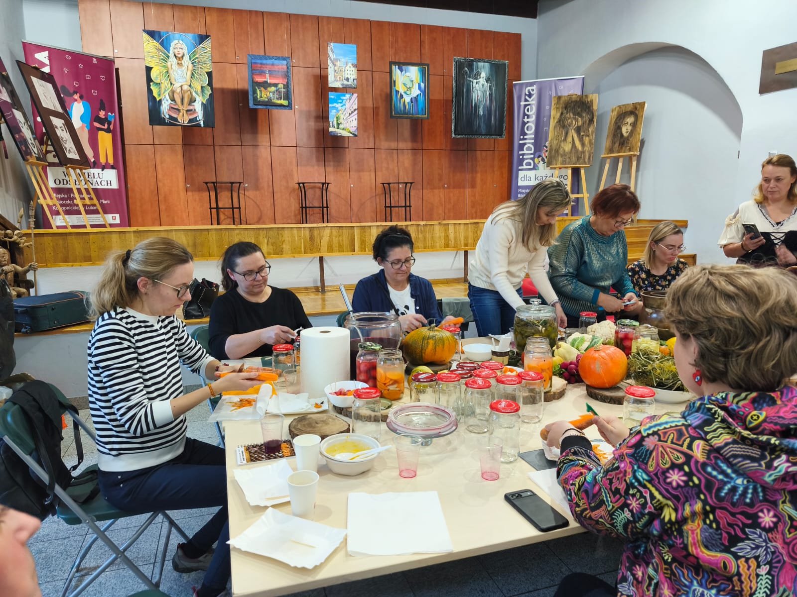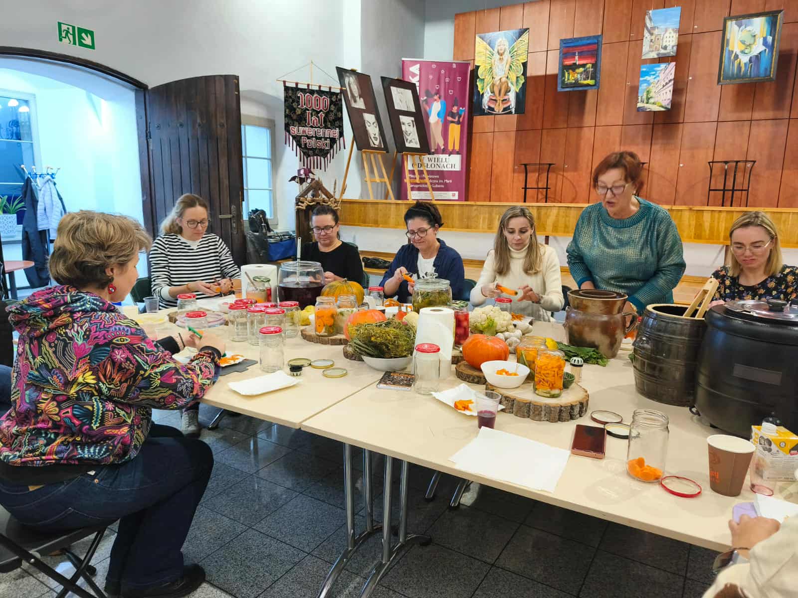 Nie zabrakło również części praktycznej – każdy z uczestników przygotował własny słoik z warzywami, eksperymentując z przyprawami i smakami. Wspólne kiszenie stało się okazją do rozmów, wymiany doświadczeń i rodzinnych przepisów przekazywanych z pokolenia na pokolenie.