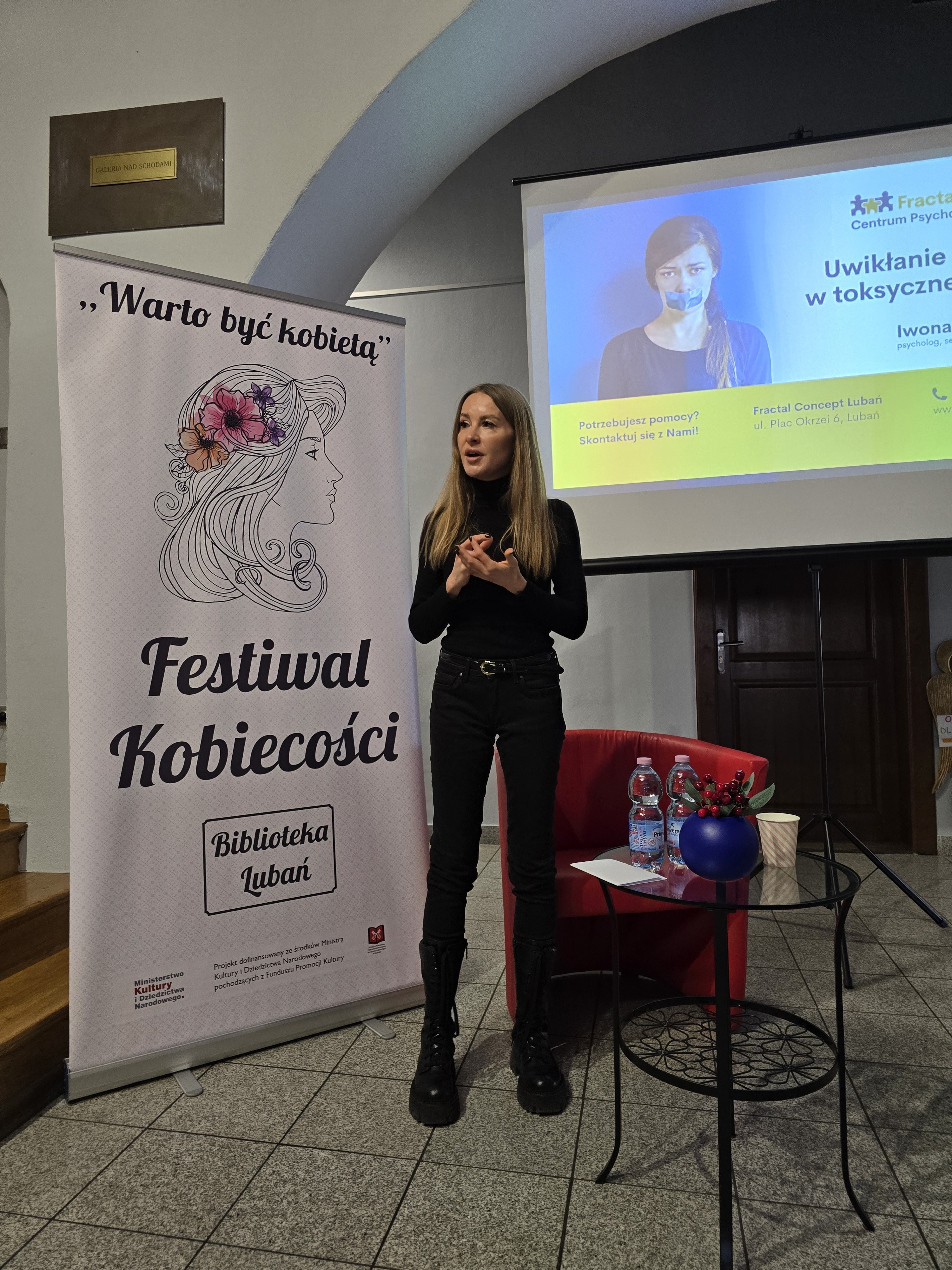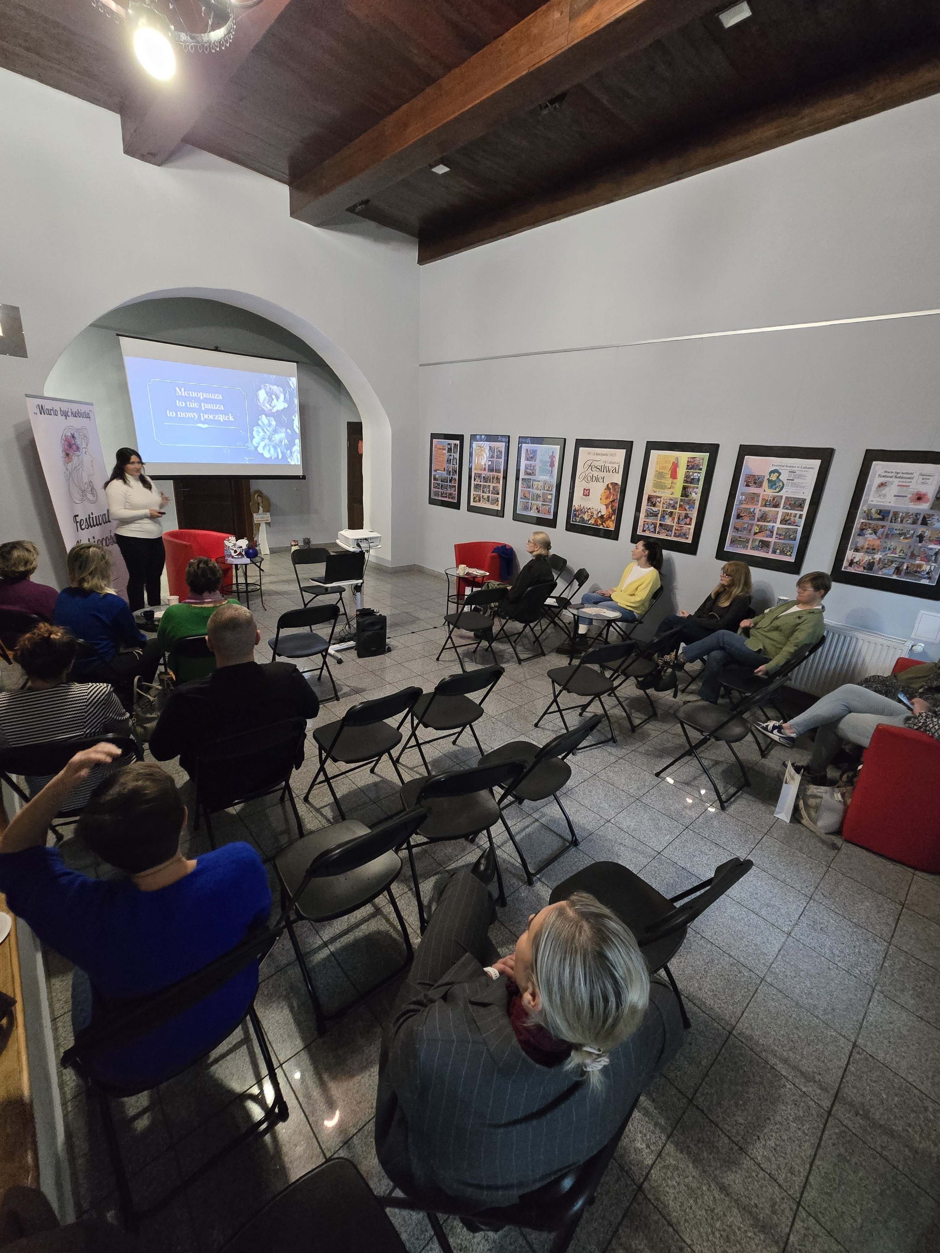Łużyckie Centrum Medyczne – Panie Izabelę Słowińską (uroginekologia), Monikę Grabczyk (dietetyk) oraz Paulinę Jańskę – oddziałowa Centrum Narodzin w Lubaniu. Po zdrowiu nadszedł czas na ekonomię społeczną, o której opowiadały Panie z Ośrodka Wsparcia Ekonomii Społecznej. Pomogły w zmianie myślenia dotyczącej „przywództwa” i angażowaniu się w projekty oraz zmiany, jakie wprowadzają w świecie kobiety. Pani Liwia Wesoły pokazała nam także podstawy makijażu oraz pielęgnacji dłoni. Na sam koniec – wisienka na torcie – czytanie performatywne „Kawiarnia Kankan” w wykonaniu Teatru „Babeczki i dwa ciacha”, które było zabawne, ale też trochę wzruszające i poruszające.