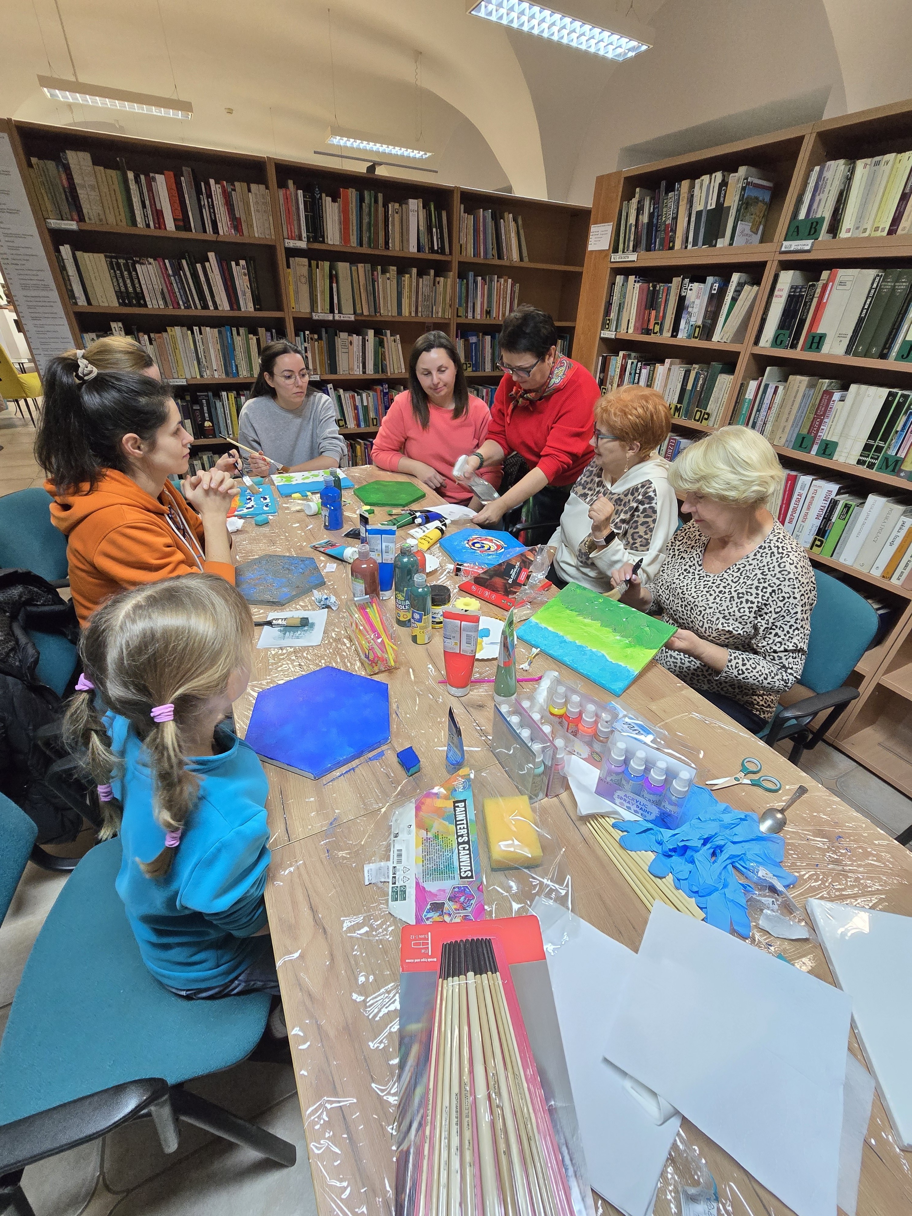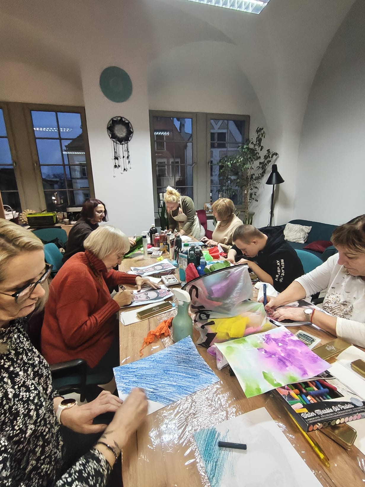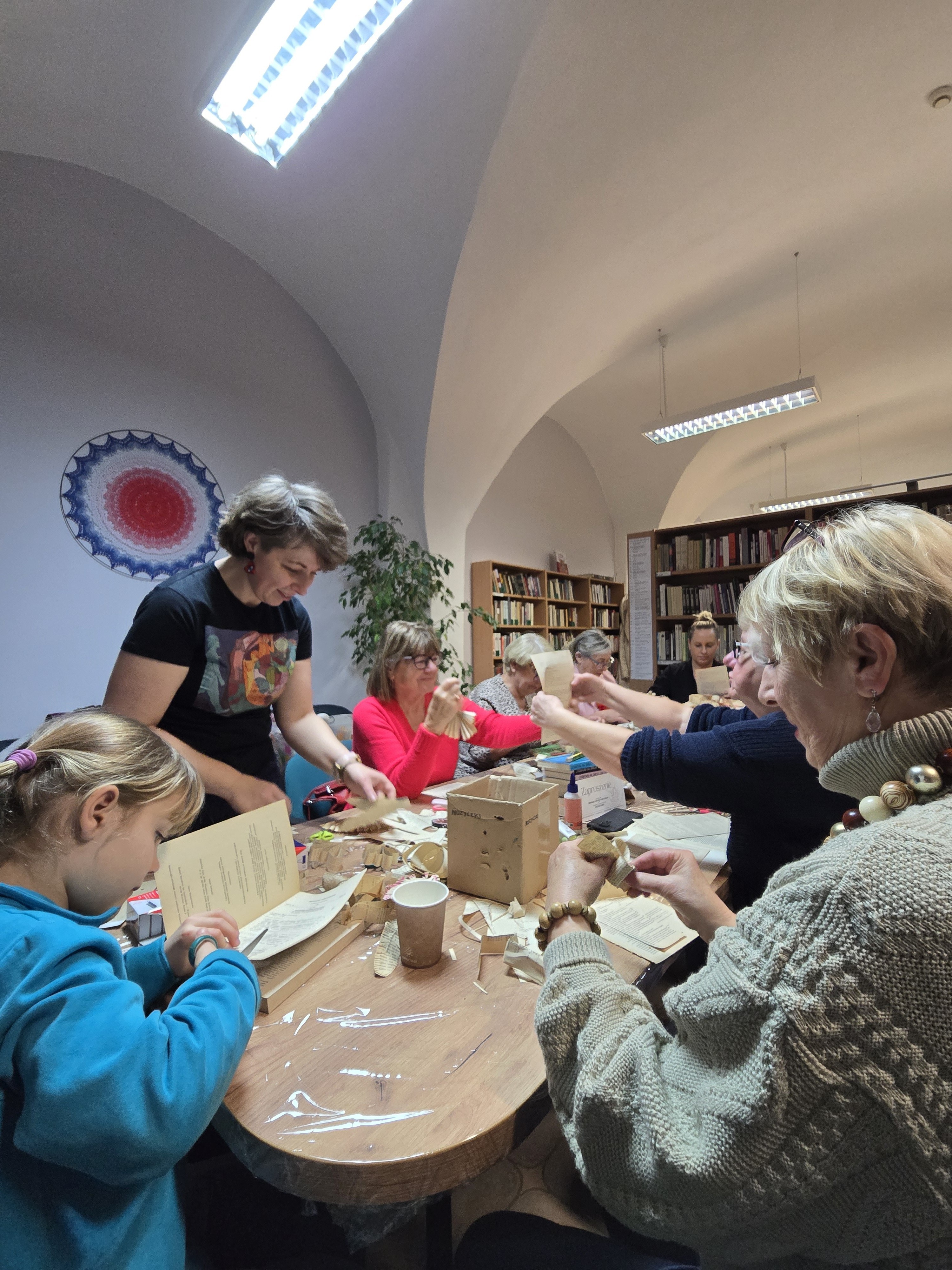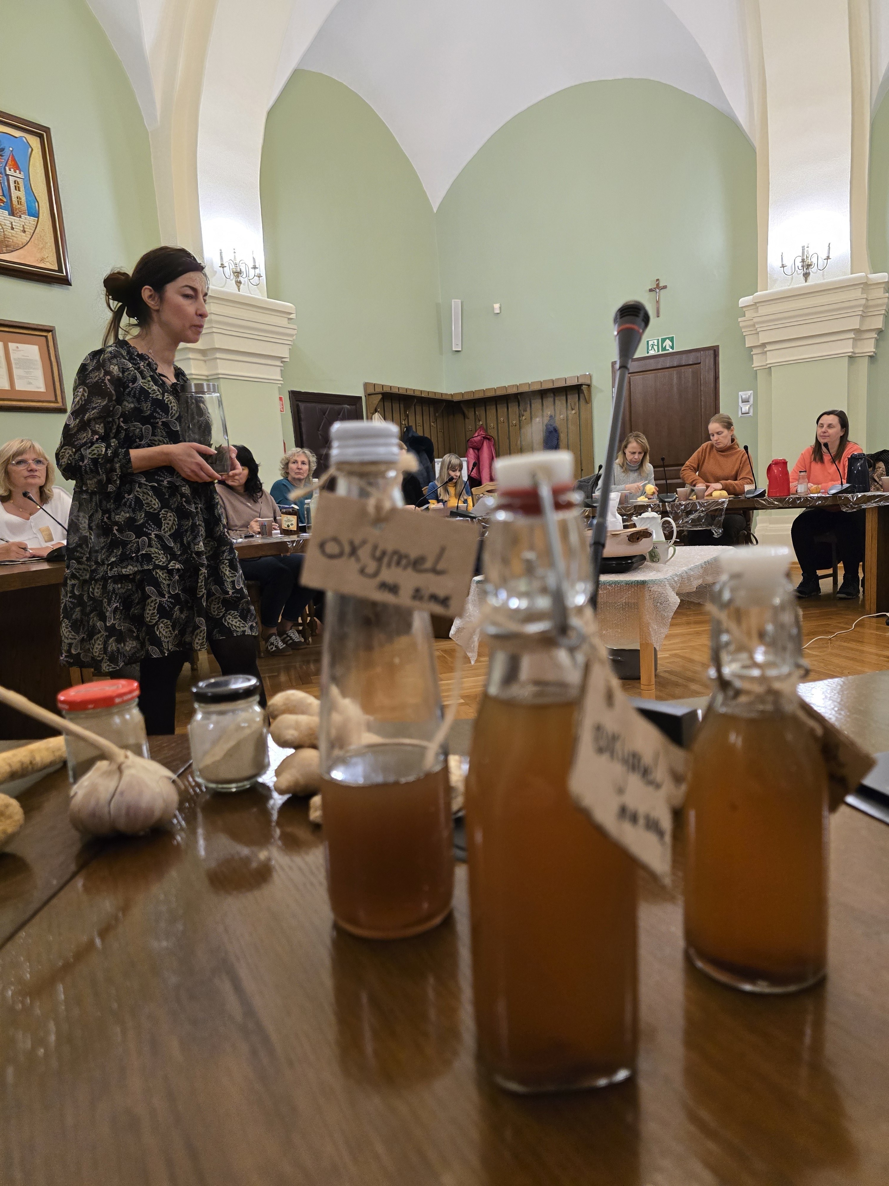 W międzyczasie trwały oczywiście warsztaty. Zapisane wcześniej osoby miały szansę poznać sekrety św. Hildegardy i pod czujnym okiem Pani Jadwigi Skierskiej poznali sekrety tworzenia oxymela i wina z galgantu. Dzięki Pani Destinie Kuliś Panie mogły poznać sekrety WenDo – mające na celu wzmocnienie pewności siebie, poczucia własnej wartości oraz wyrobienie postaw asertywnych, co w efekcie ma zmniejszyć ryzyko doznania przez kobiety i dziewczęta przemocy, także seksualnej. Dla ciała była także joga prowadzona przez Panią Jolantę Ciaciek. Można było się także wyżyć artystycznie tworząc z Barbarą Krupą-Kapuśniak przepiękne ozdoby świąteczne ze starych stronic oraz malować akrylami niesamowite obrazu wraz z Panią Urszulą Wójtowicz.