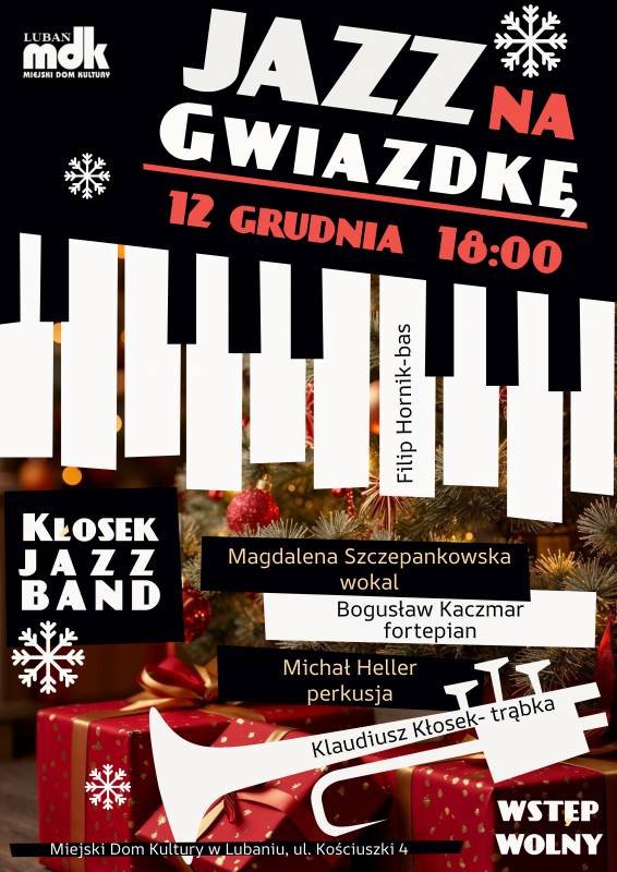 Zapraszamy na wyjątkowy, świąteczny koncert, podczas którego na scenie MDK w Lubaniu zagości Kłosek Jazz Band.