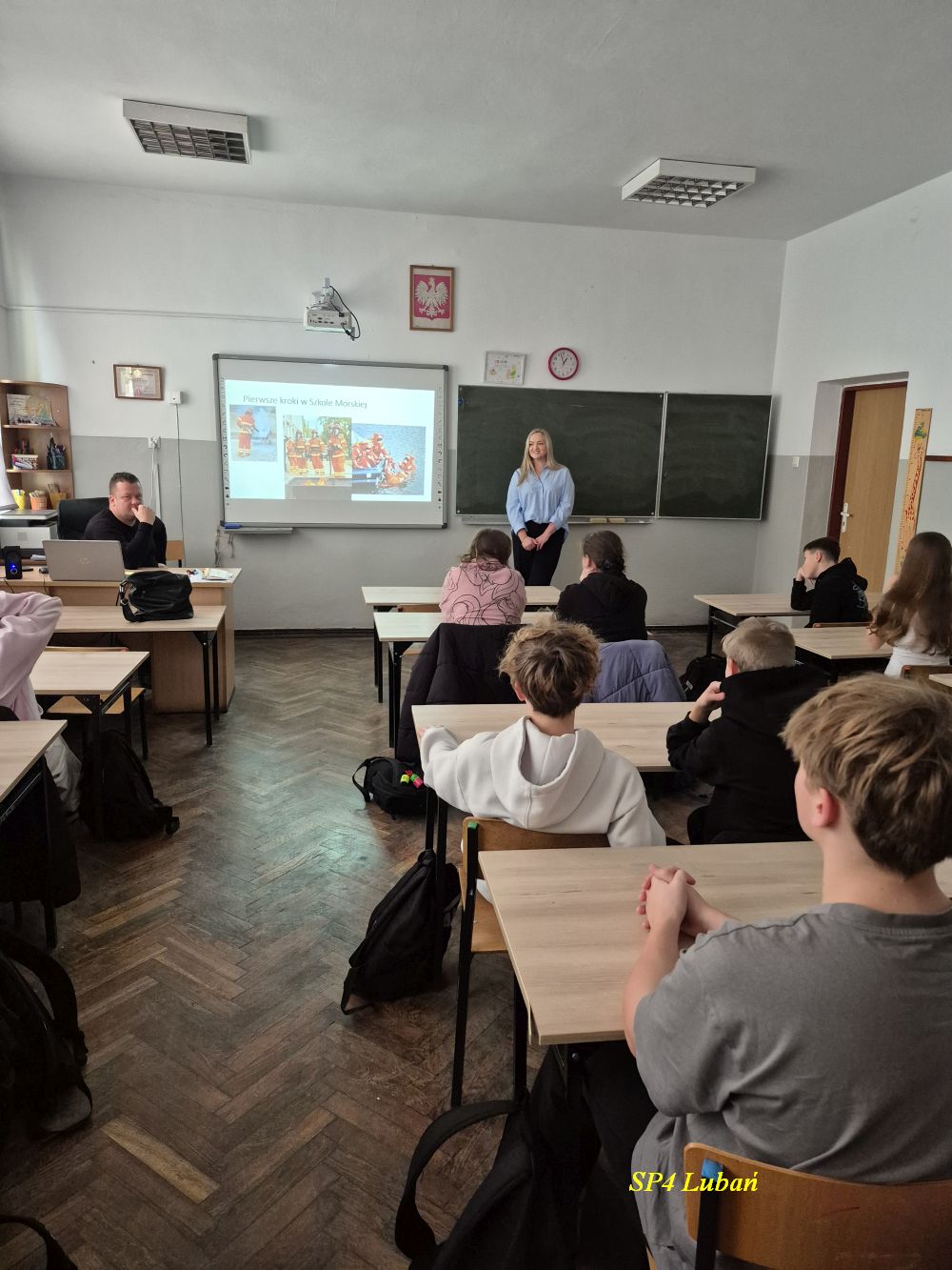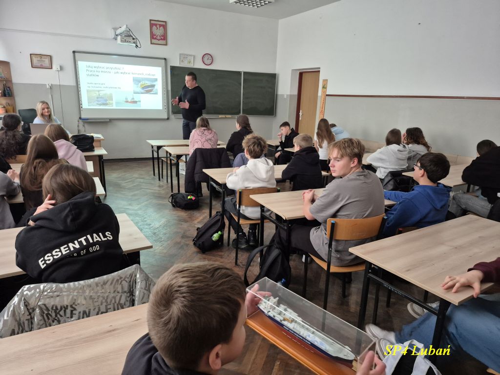 Opowiadali oni młodym ludziom o pracy na morzu. Pani Anita przygotowała informacje o wyższych szkołach morskich w Szczecinie i Gdyni, opowiedziała o specyfice studiów w tego typu placówce edukacyjnej, bowiem razem z mężem są absolwentami Politechniki Morskiej w Szczecinie. Państwo Kędzierscy w ciekawy sposób opowiadając o własnych doświadczeniach, zaznajamiali uczniów ze specyfiką pracy na statkach. Pan Artur, który nadal pracuje jako kapitan prowadzący statki, opowiadał o swoich doświadczeniach związanych z tym zawodem. Jak dowiedzieli się uczniowie praca na statku może być także okazją do zwiedzania różnych zakątków świata, poznawania ludzi oraz doskonalenia się w wielu umiejętnościach. Była to idealna lekcja doradztwa zawodowego, przeprowadzona z pasją i profesjonalizmem. Dziękujemy!