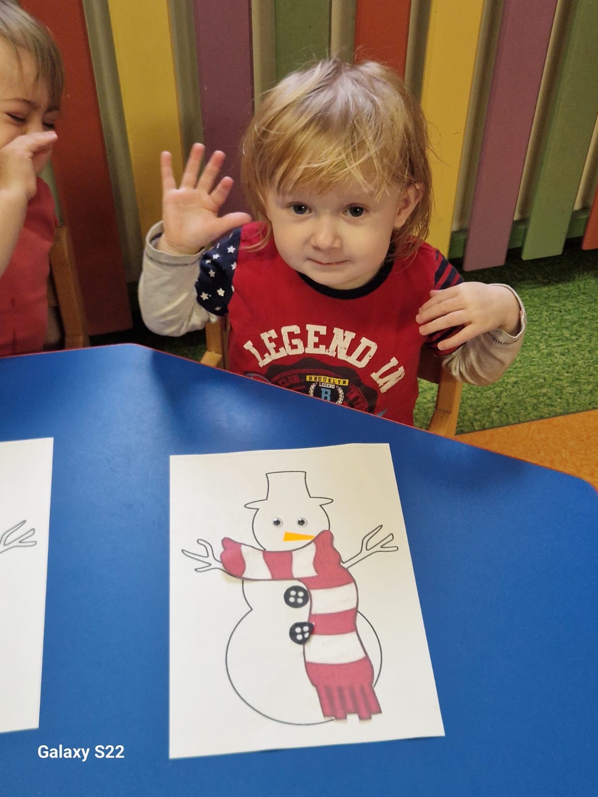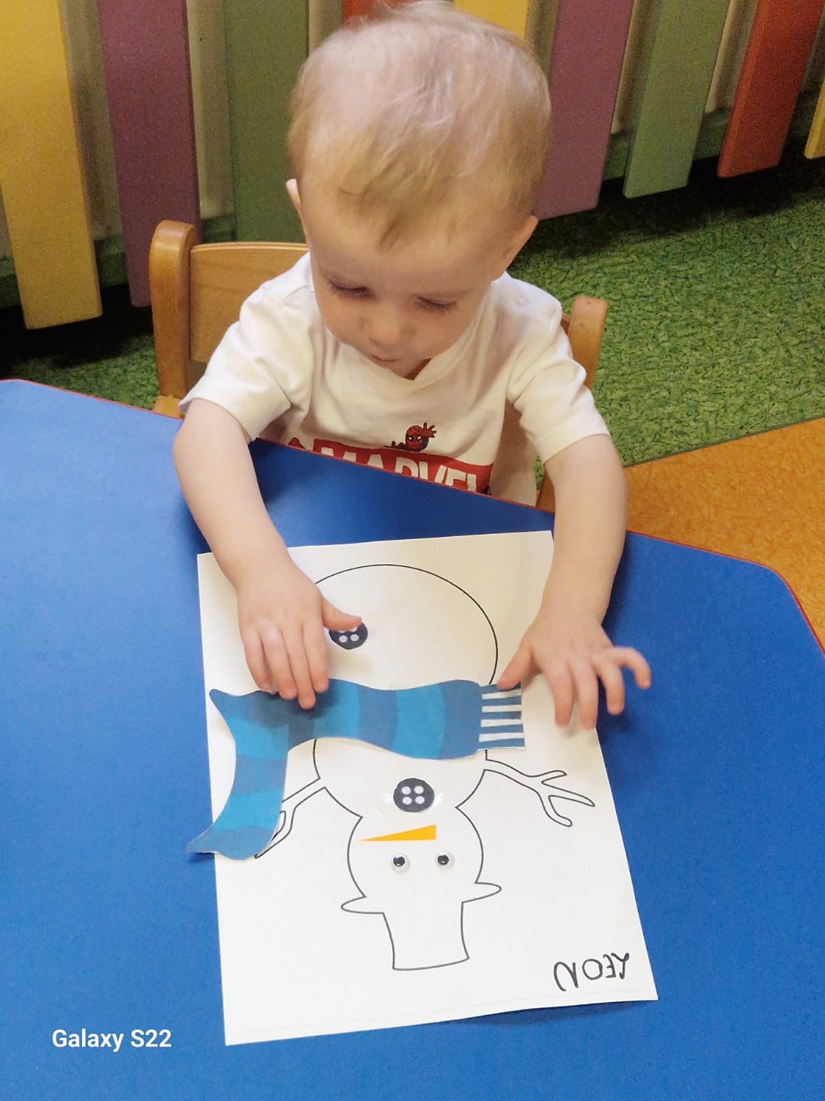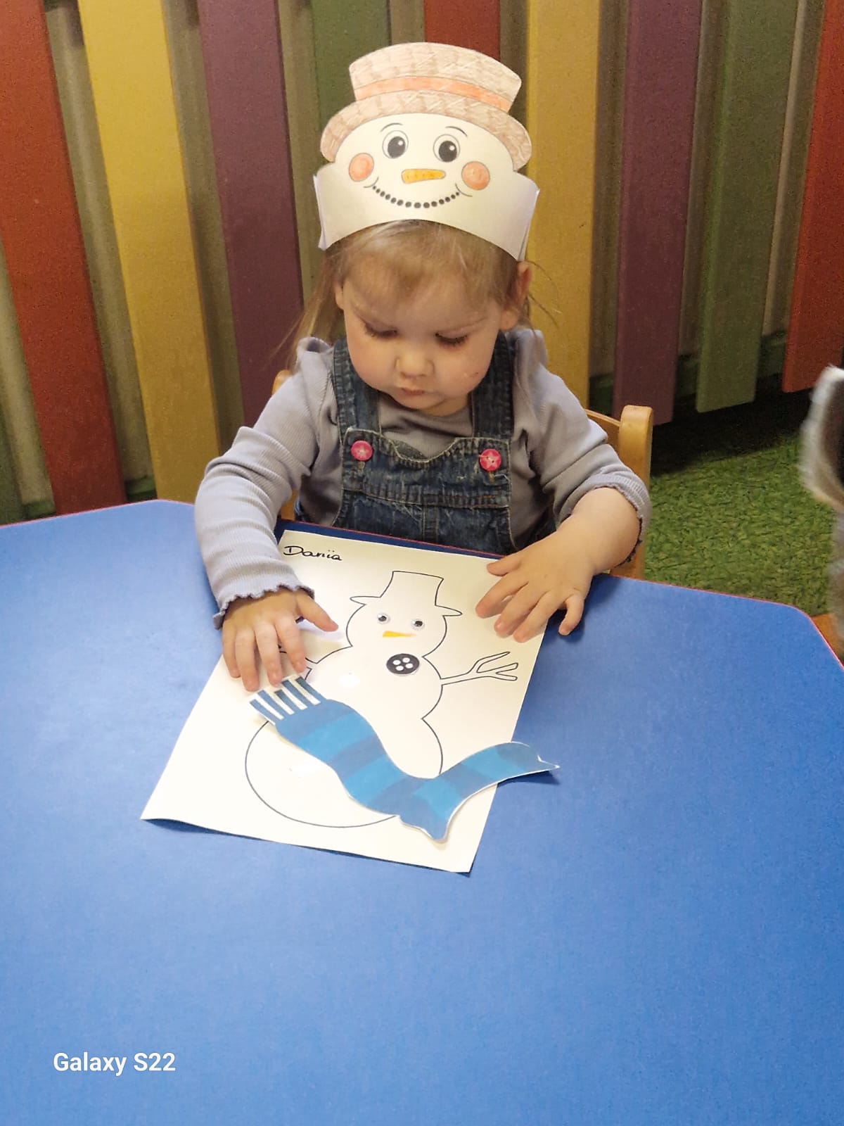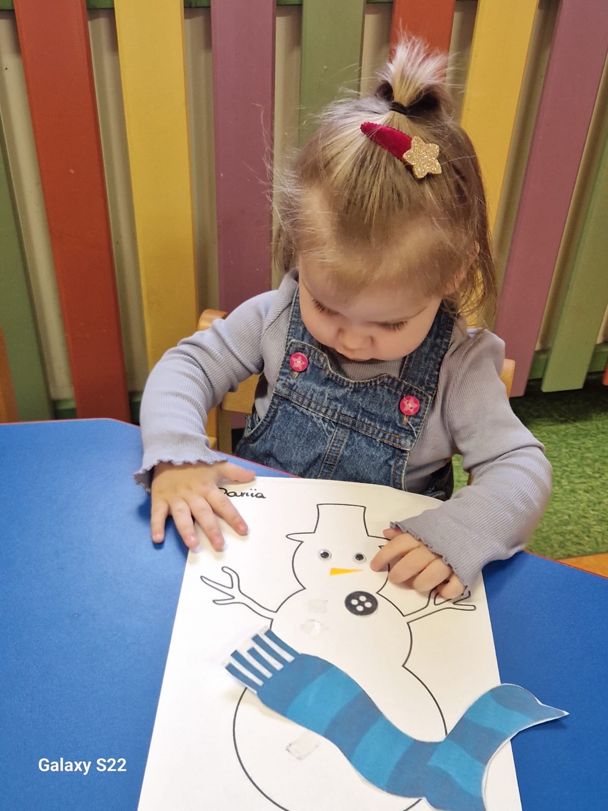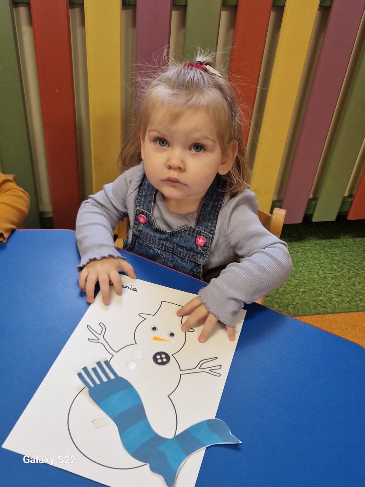 Biedronki ozdabiały zimowego bałwanka, przyklejały mu guziki i kolorowy szalik. W czapeczkach bałwanków świetnie wczuły się w zimowy klimat i z radością tworzyły swoje prace.