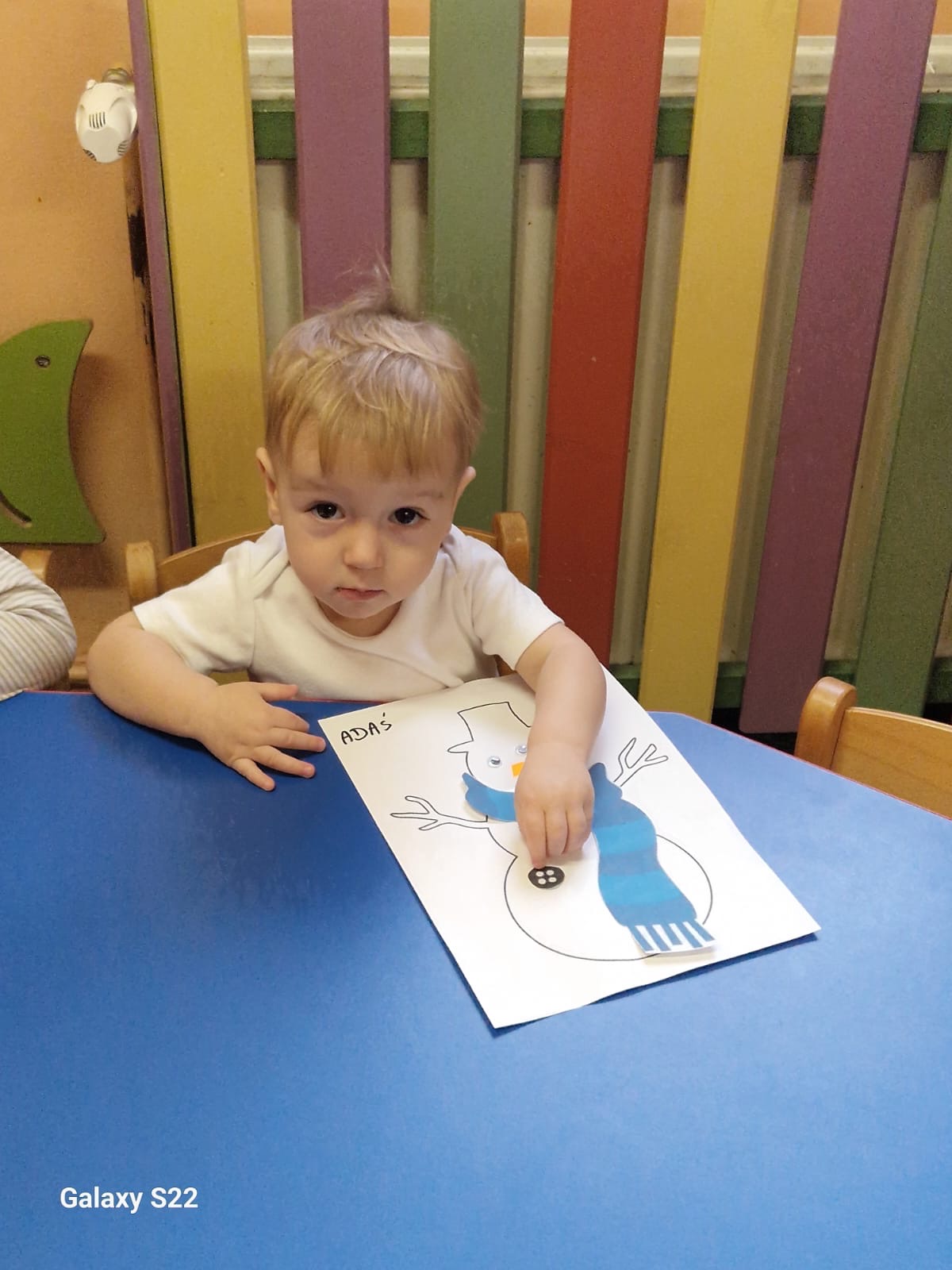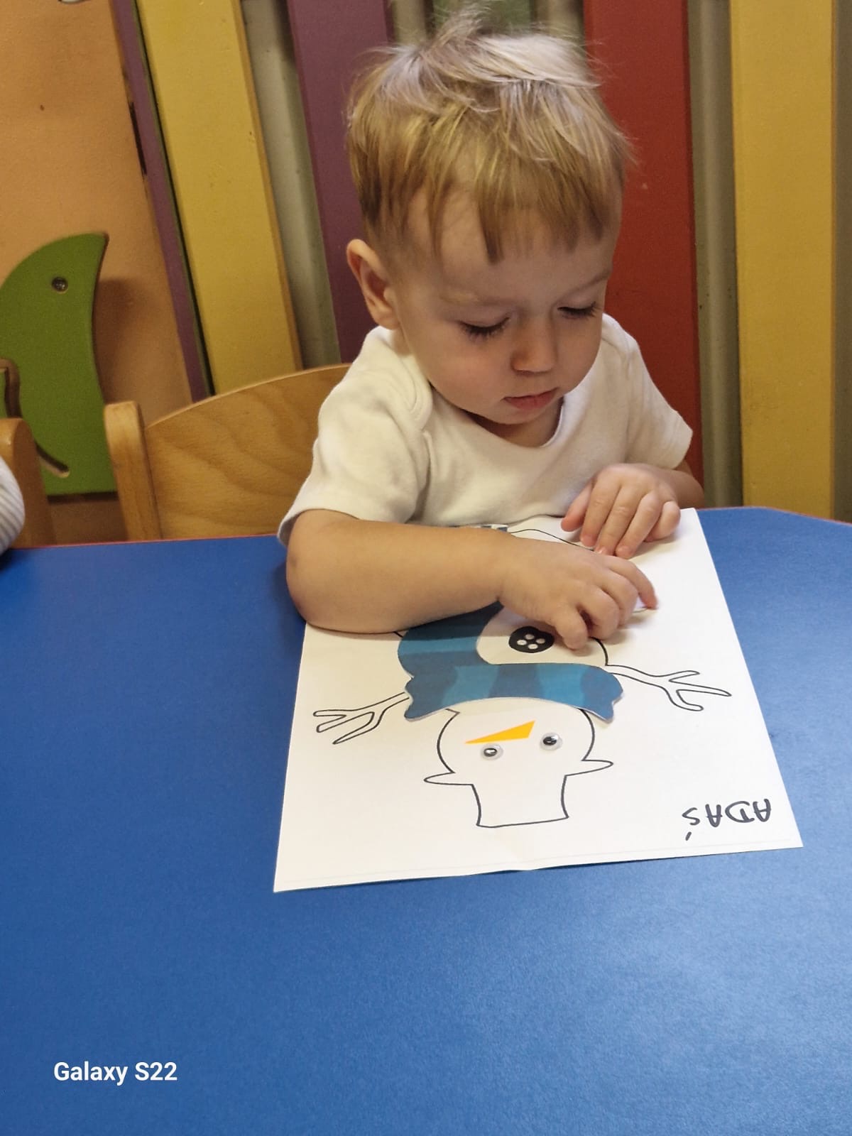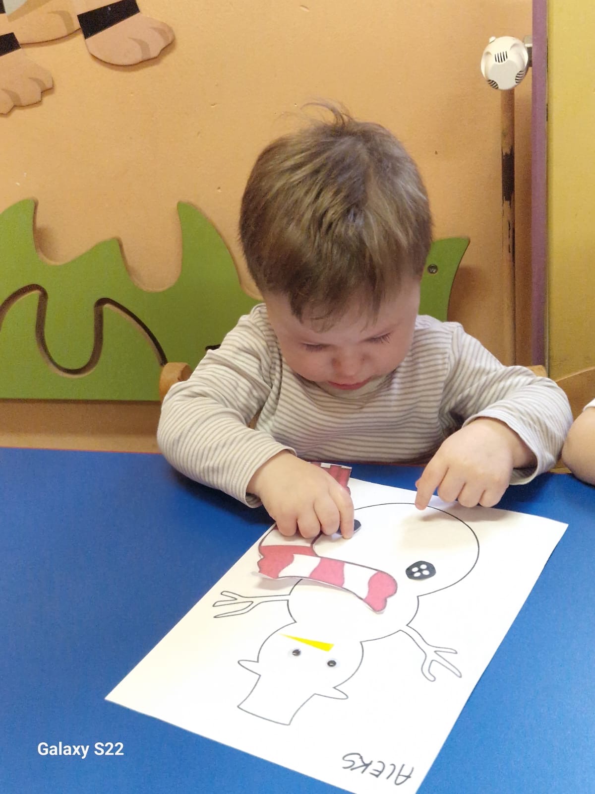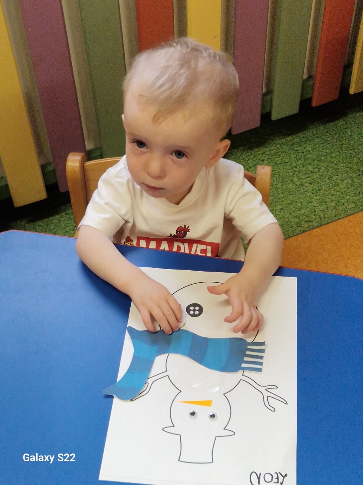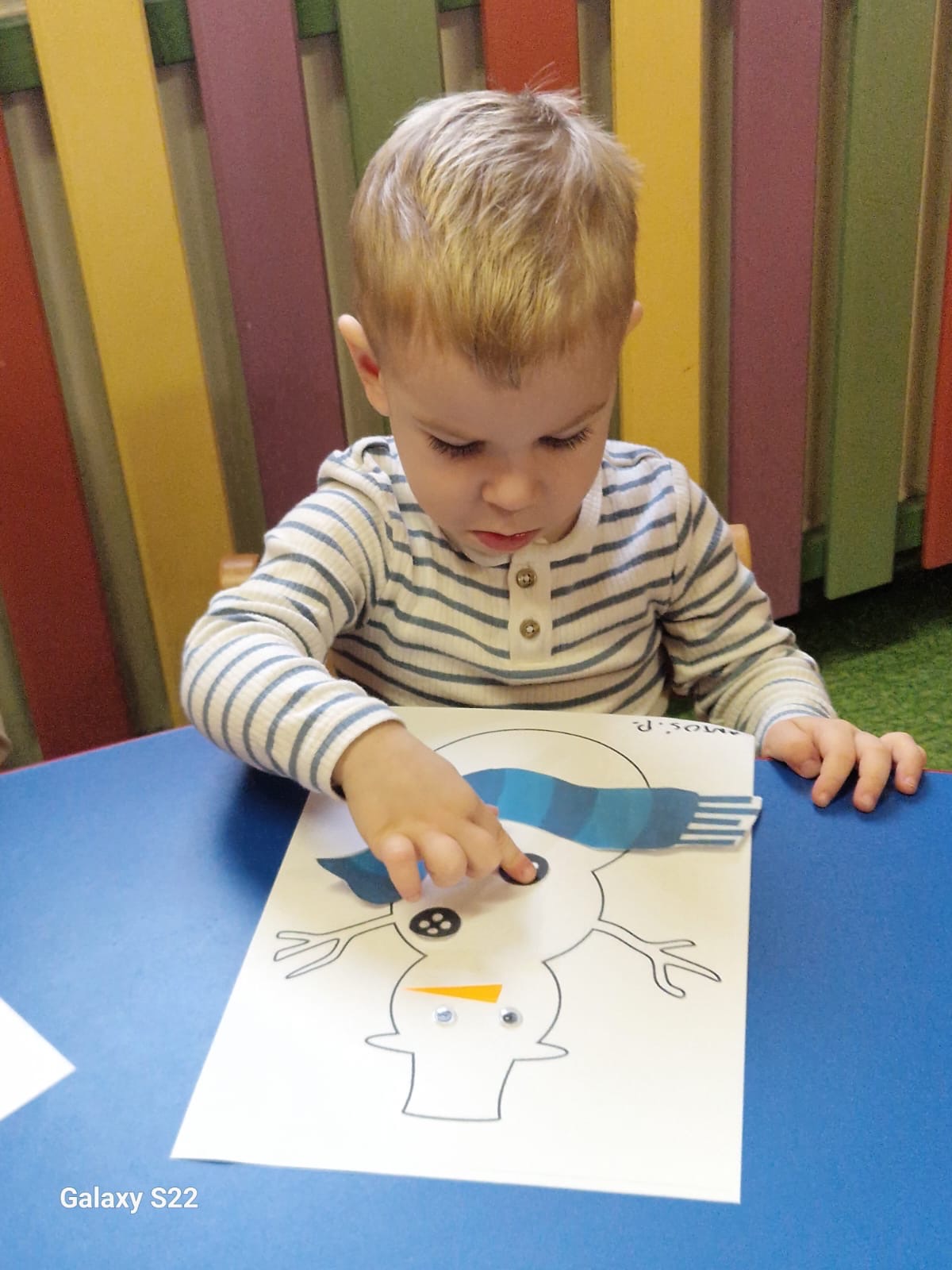 Biedronki ozdabiały zimowego bałwanka, przyklejały mu guziki i kolorowy szalik. W czapeczkach bałwanków świetnie wczuły się w zimowy klimat i z radością tworzyły swoje prace.