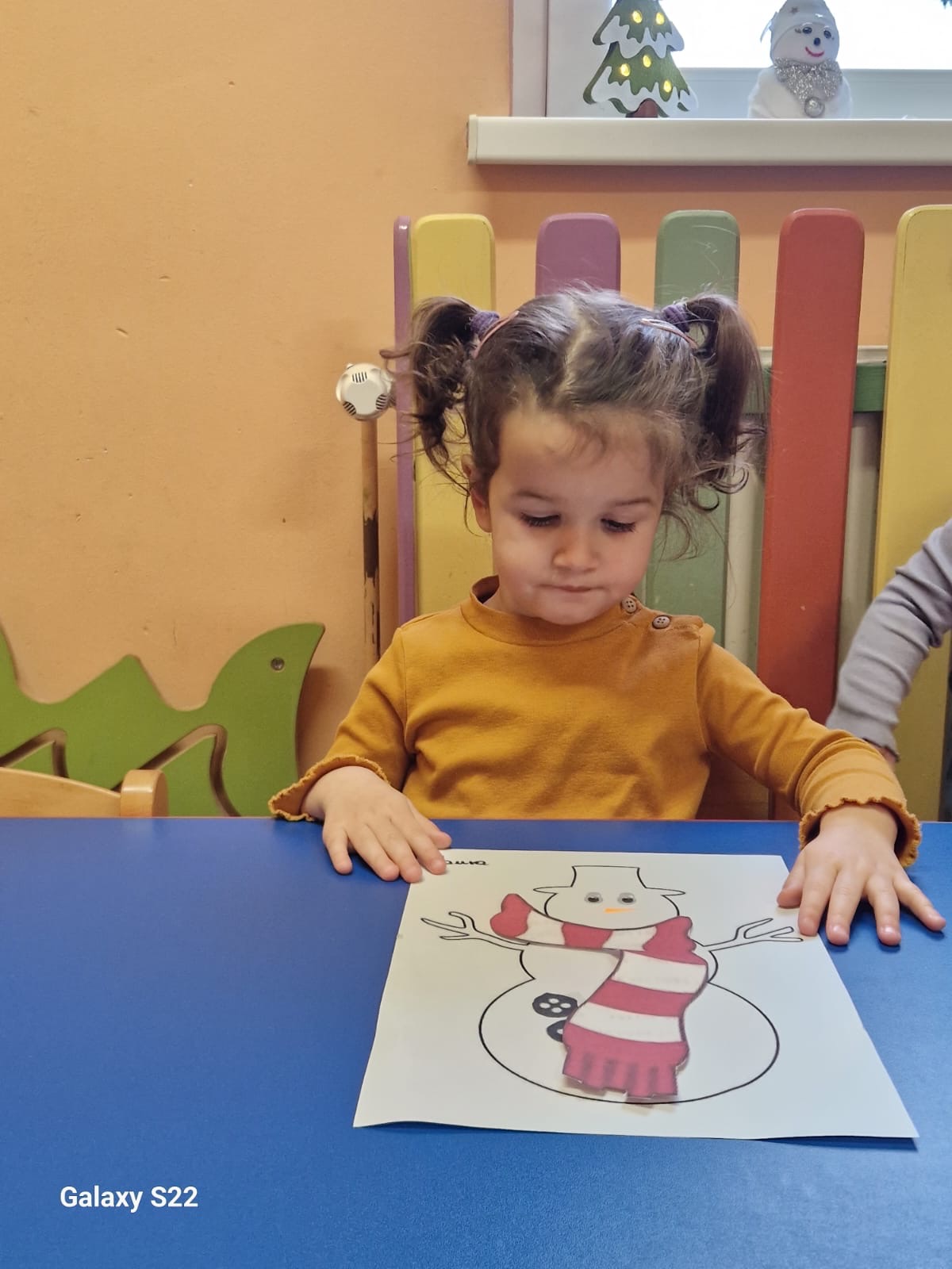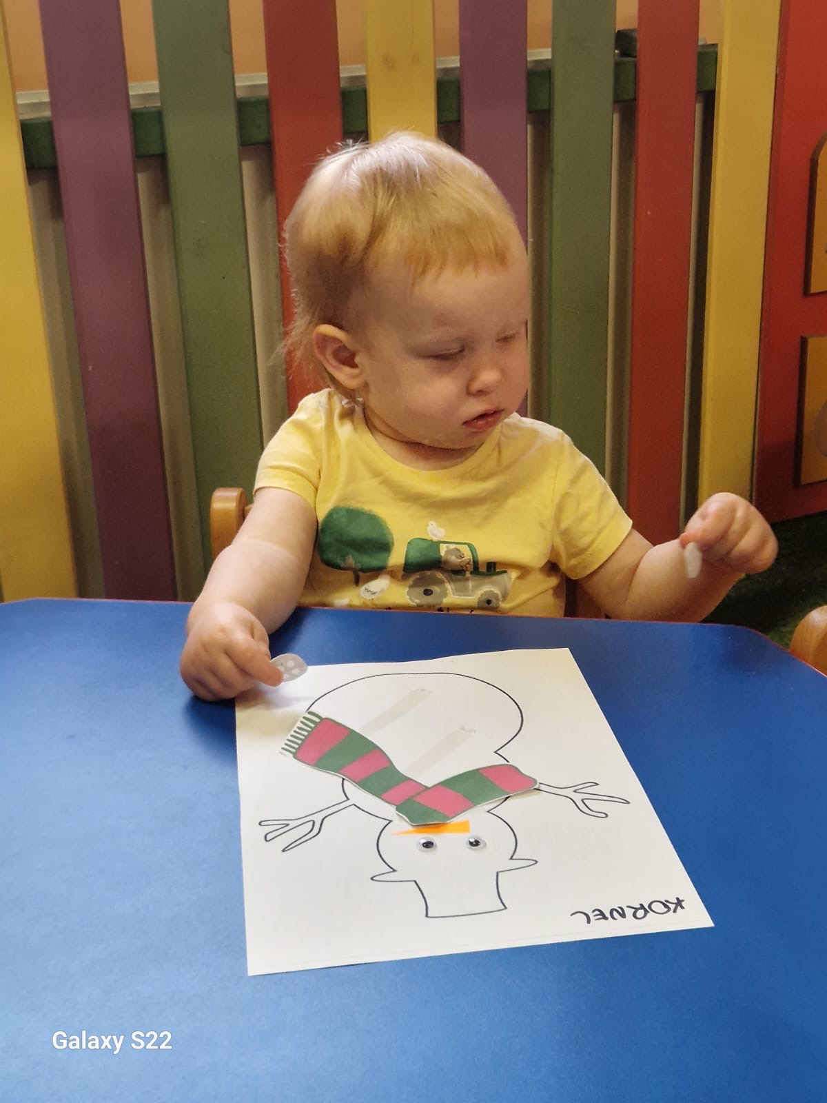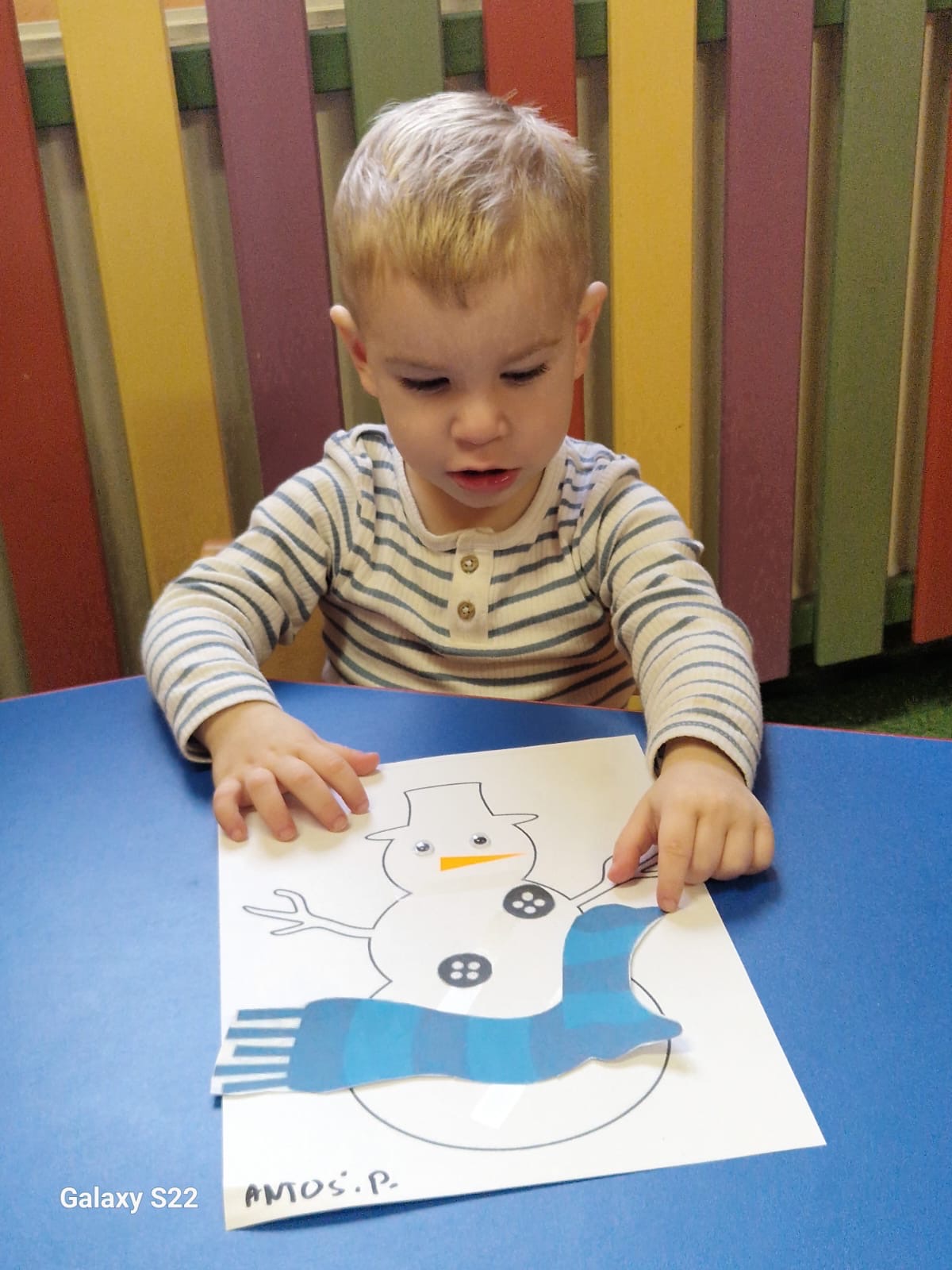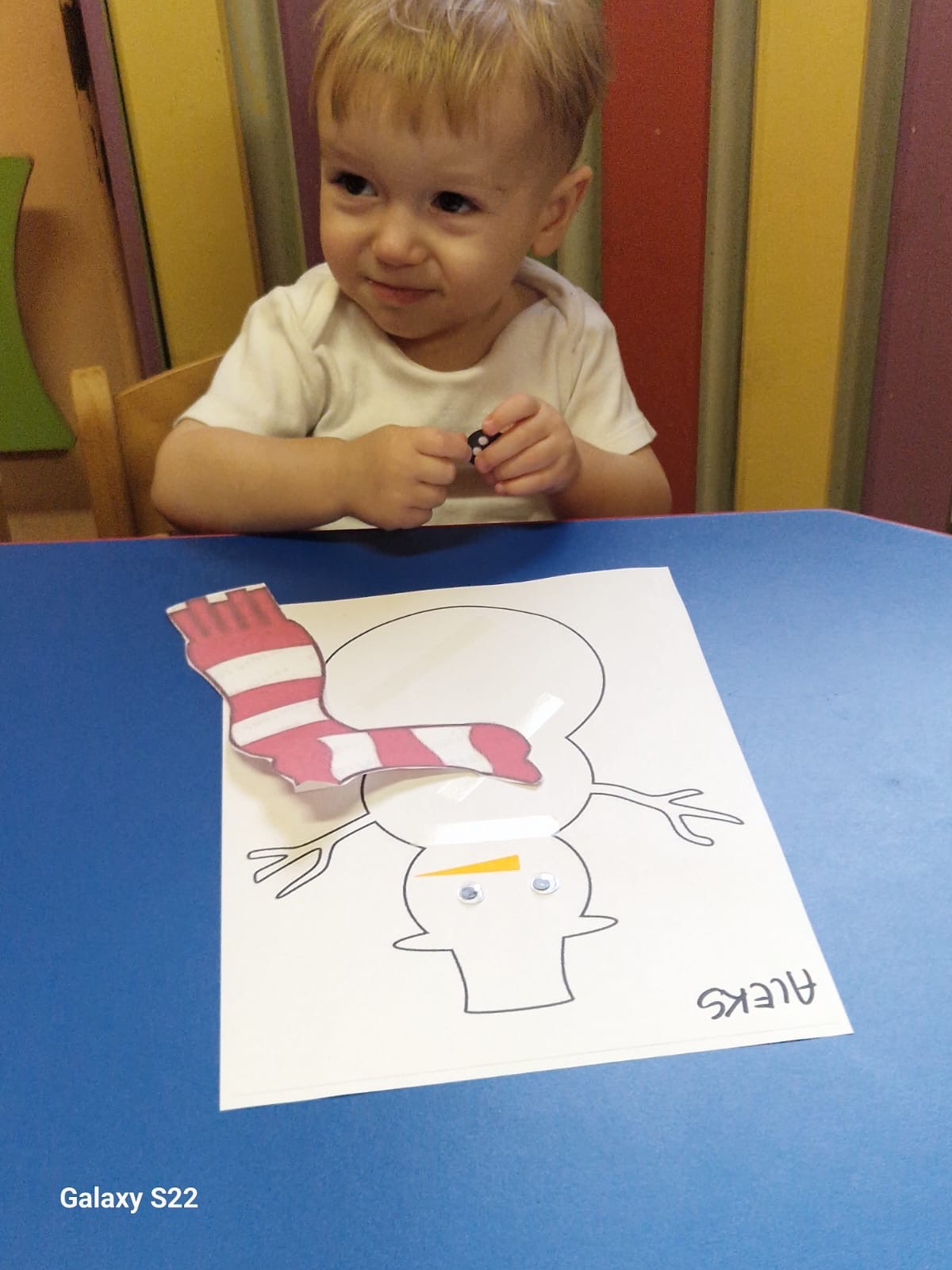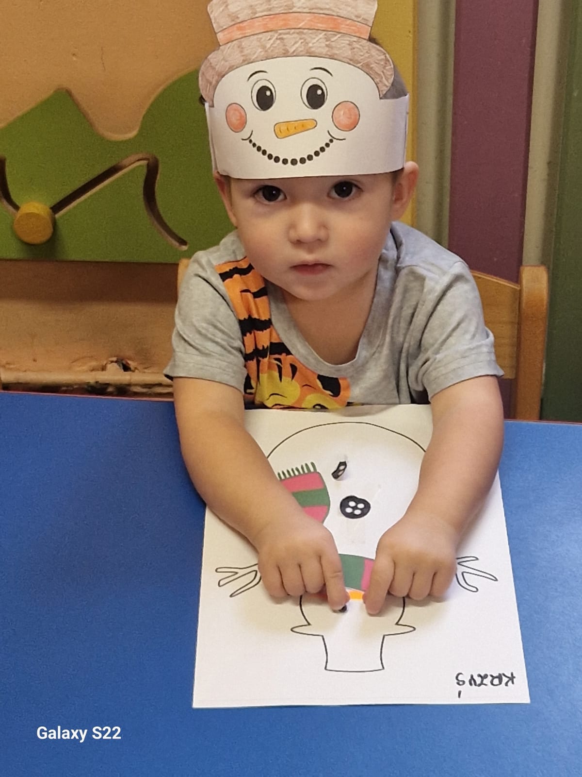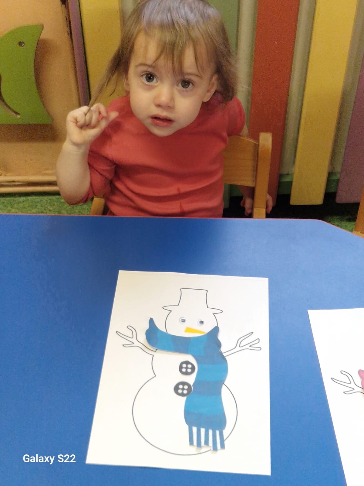 Biedronki ozdabiały zimowego bałwanka, przyklejały mu guziki i kolorowy szalik. W czapeczkach bałwanków świetnie wczuły się w zimowy klimat i z radością tworzyły swoje prace.