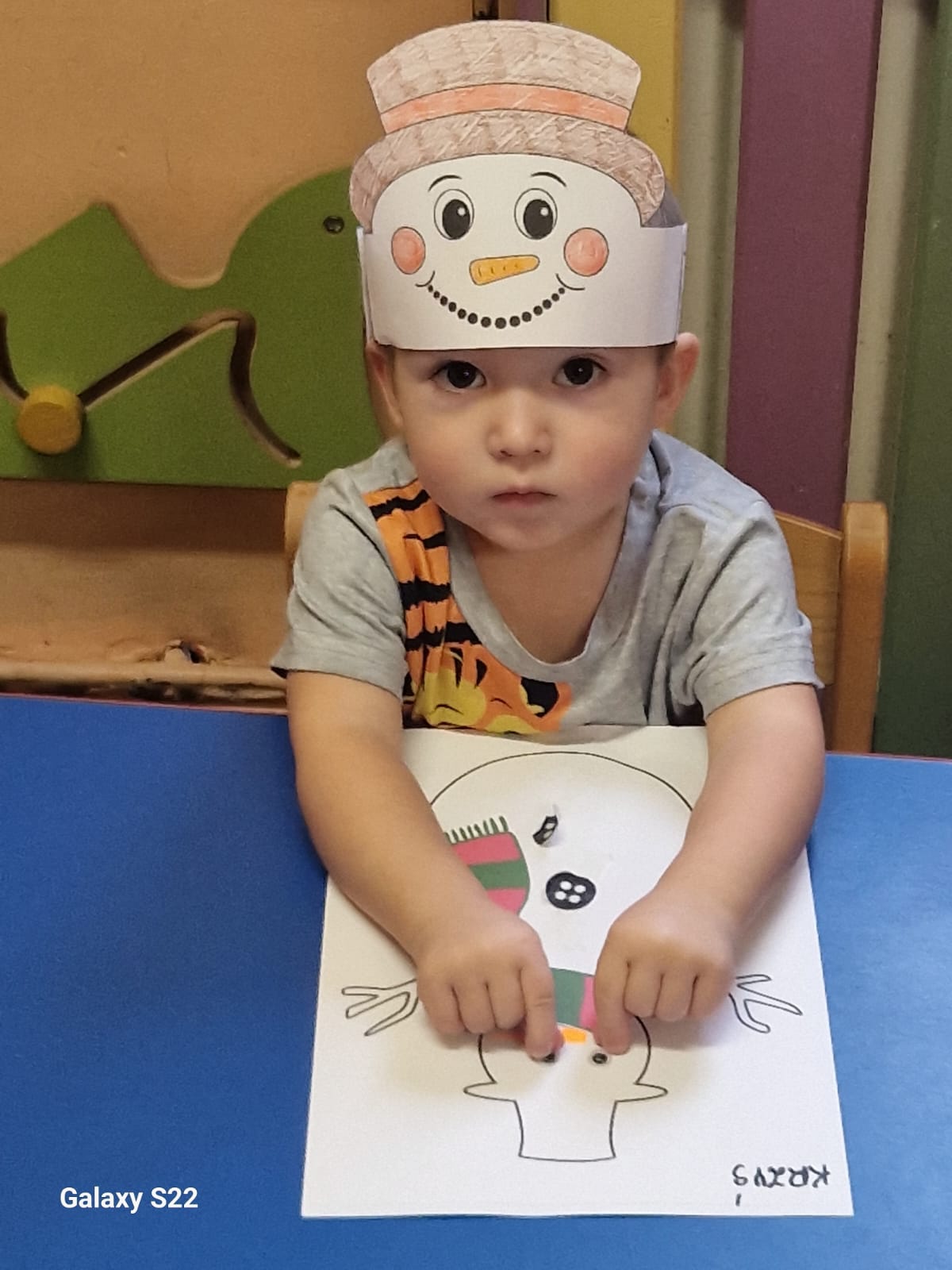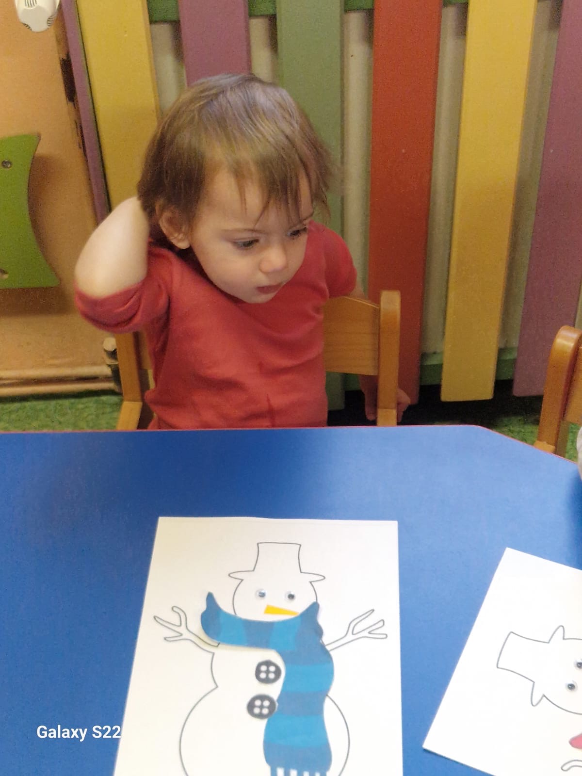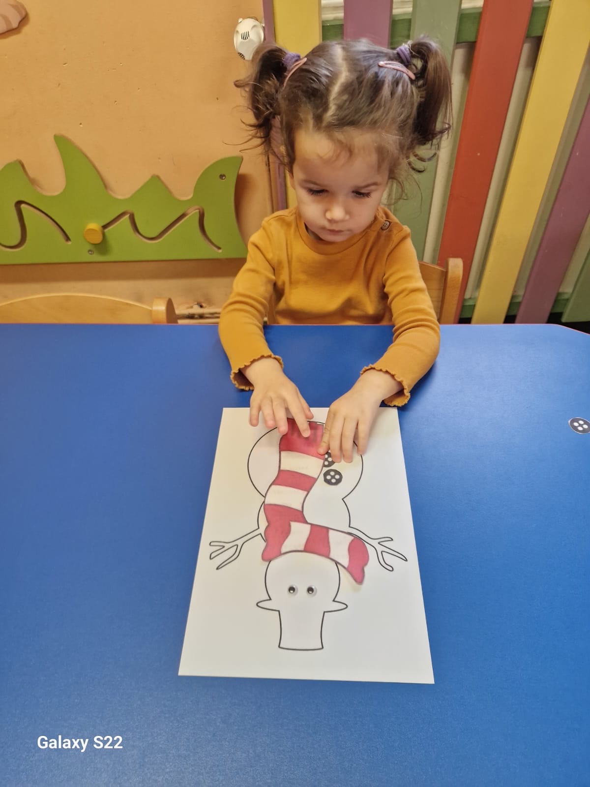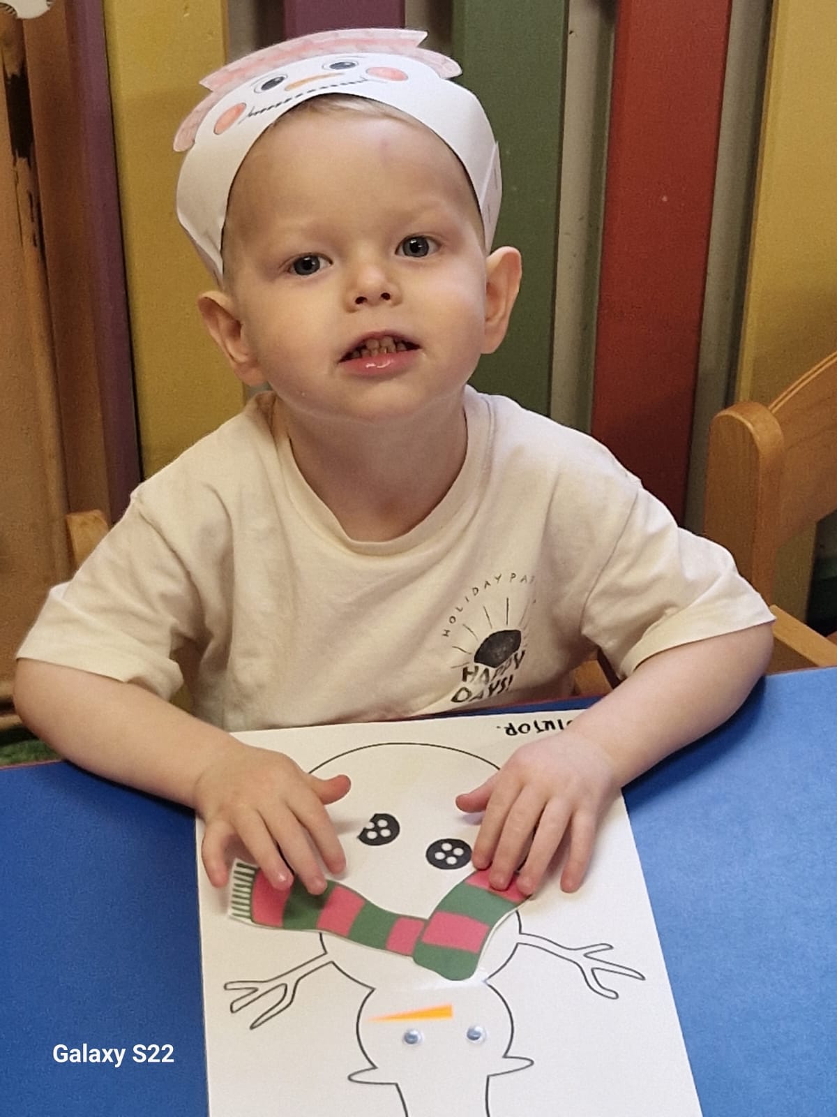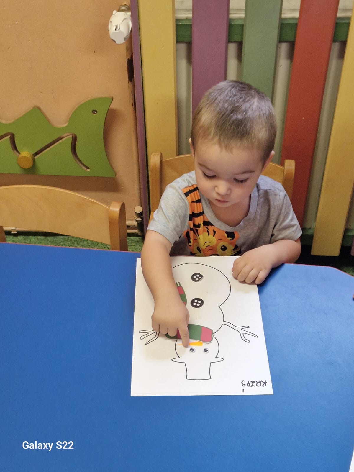 Biedronki ozdabiały zimowego bałwanka, przyklejały mu guziki i kolorowy szalik. W czapeczkach bałwanków świetnie wczuły się w zimowy klimat i z radością tworzyły swoje prace.