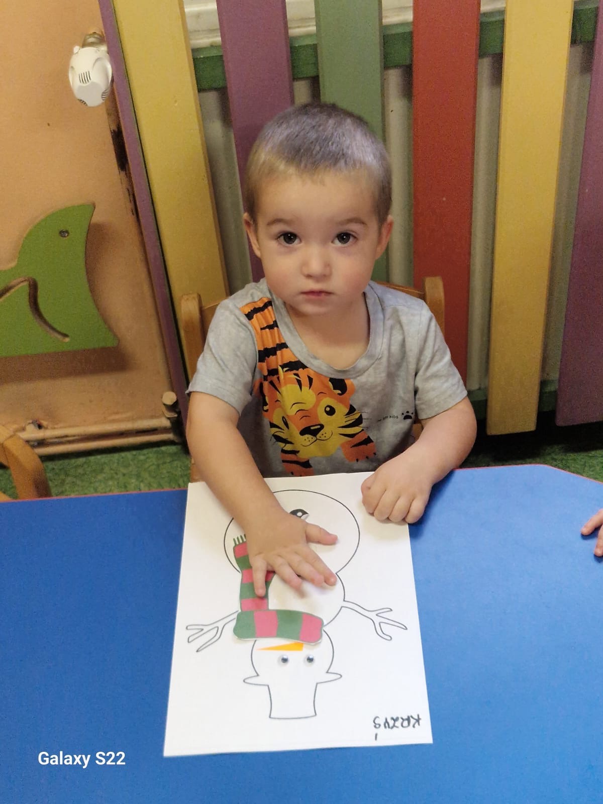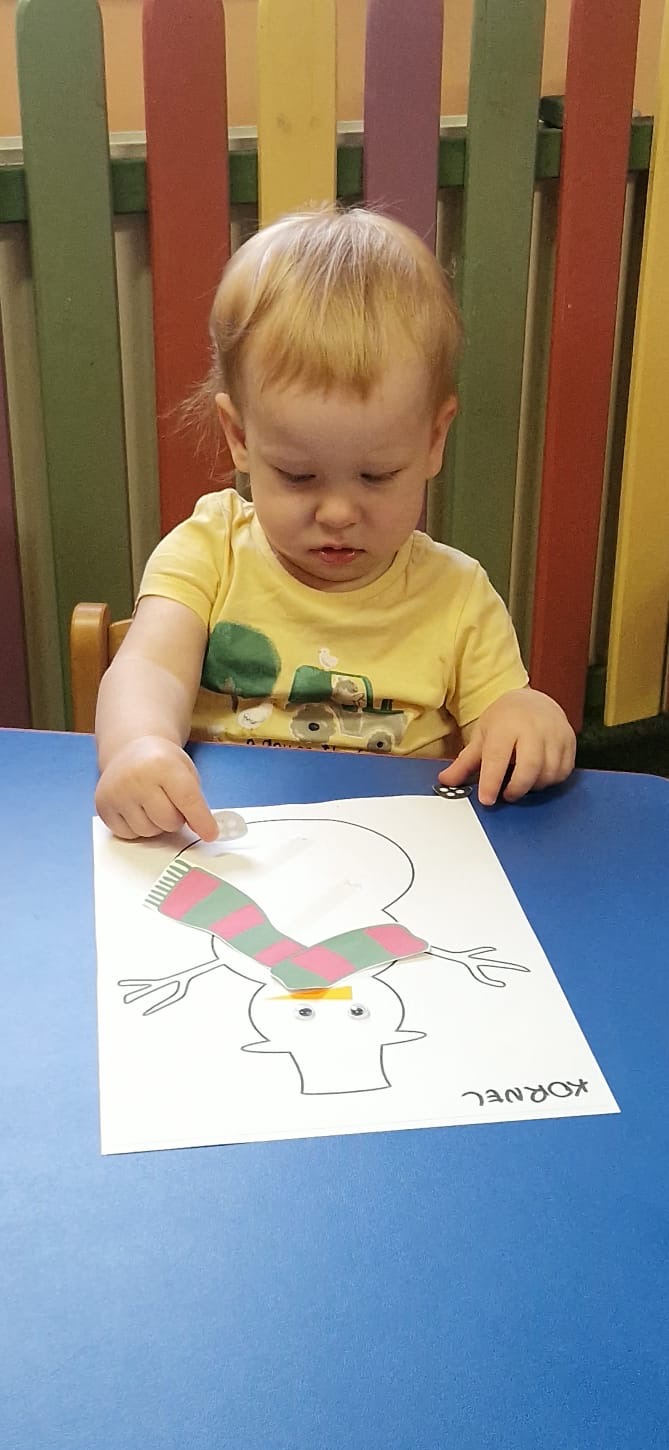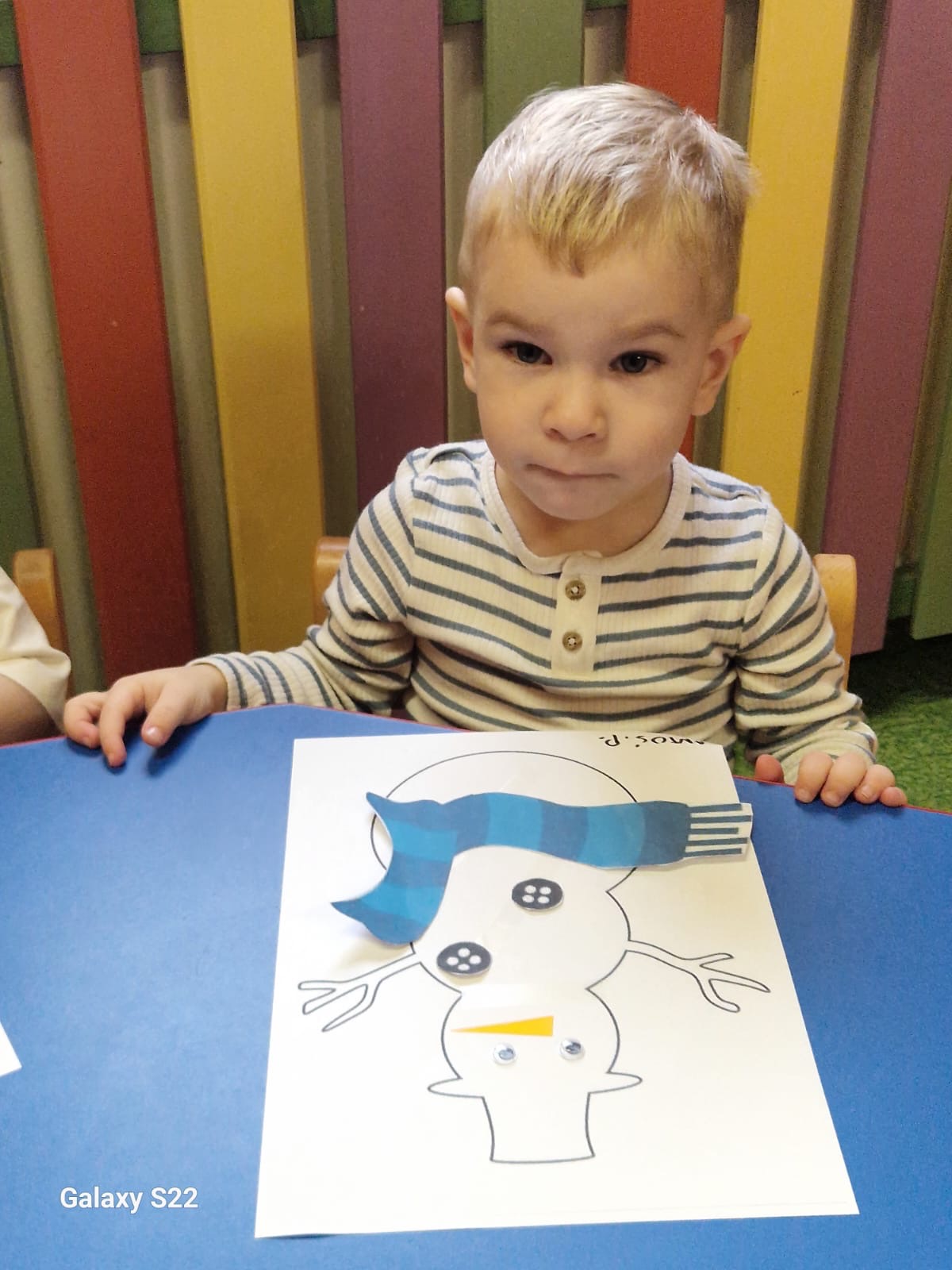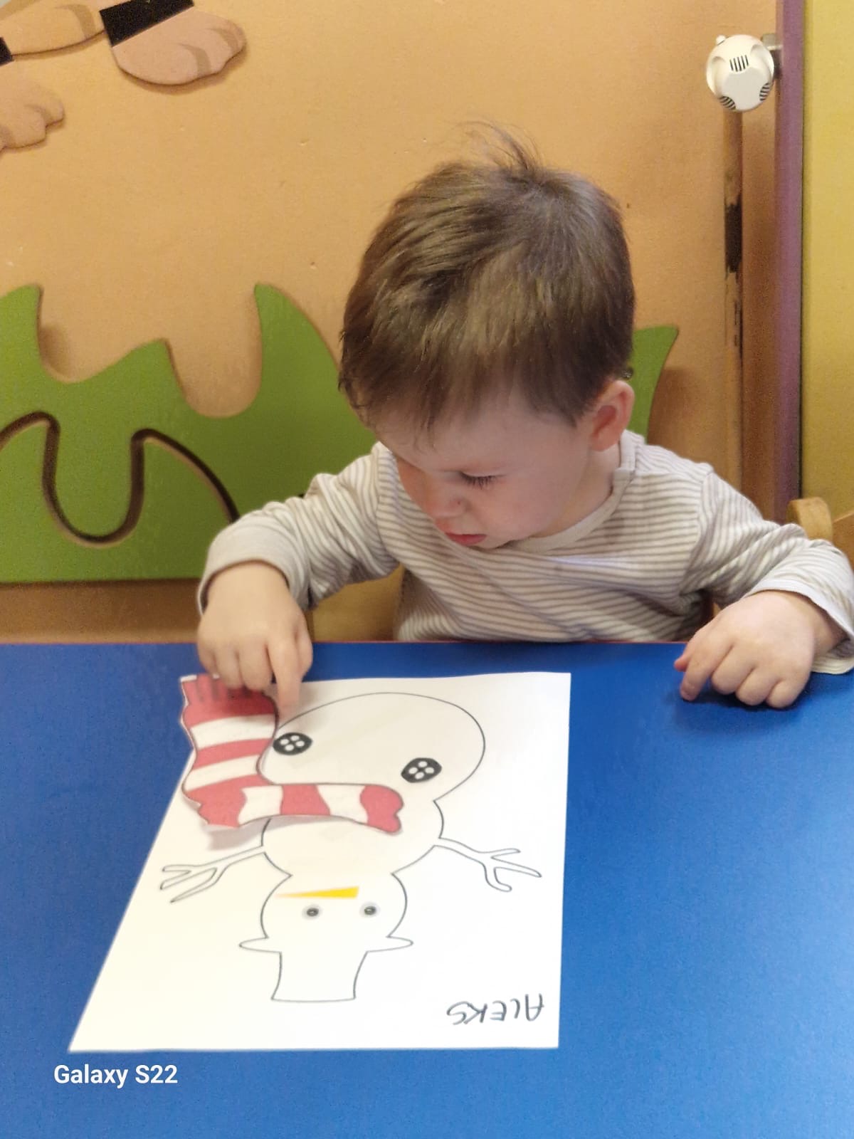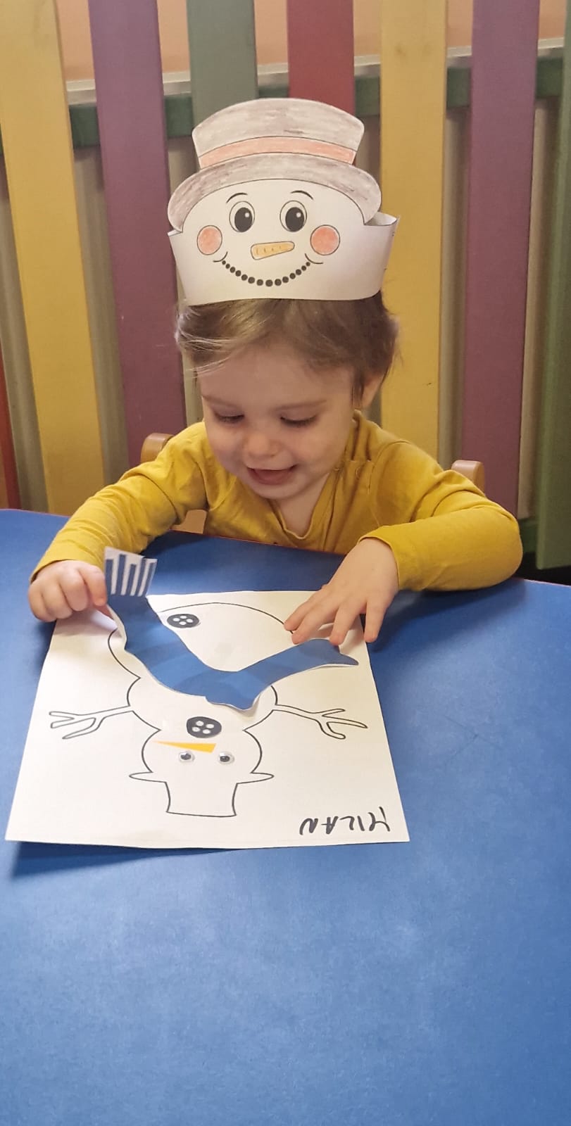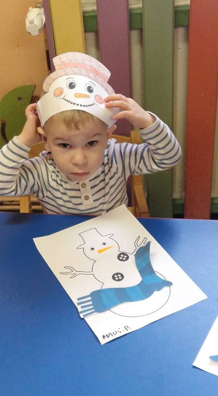 Biedronki ozdabiały zimowego bałwanka, przyklejały mu guziki i kolorowy szalik. W czapeczkach bałwanków świetnie wczuły się w zimowy klimat i z radością tworzyły swoje prace.