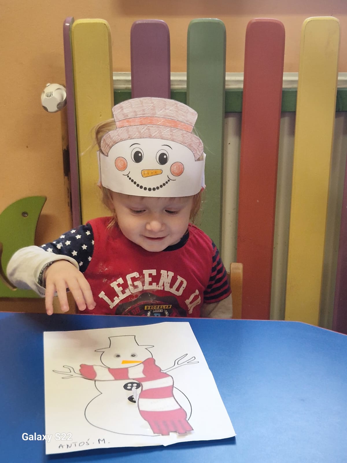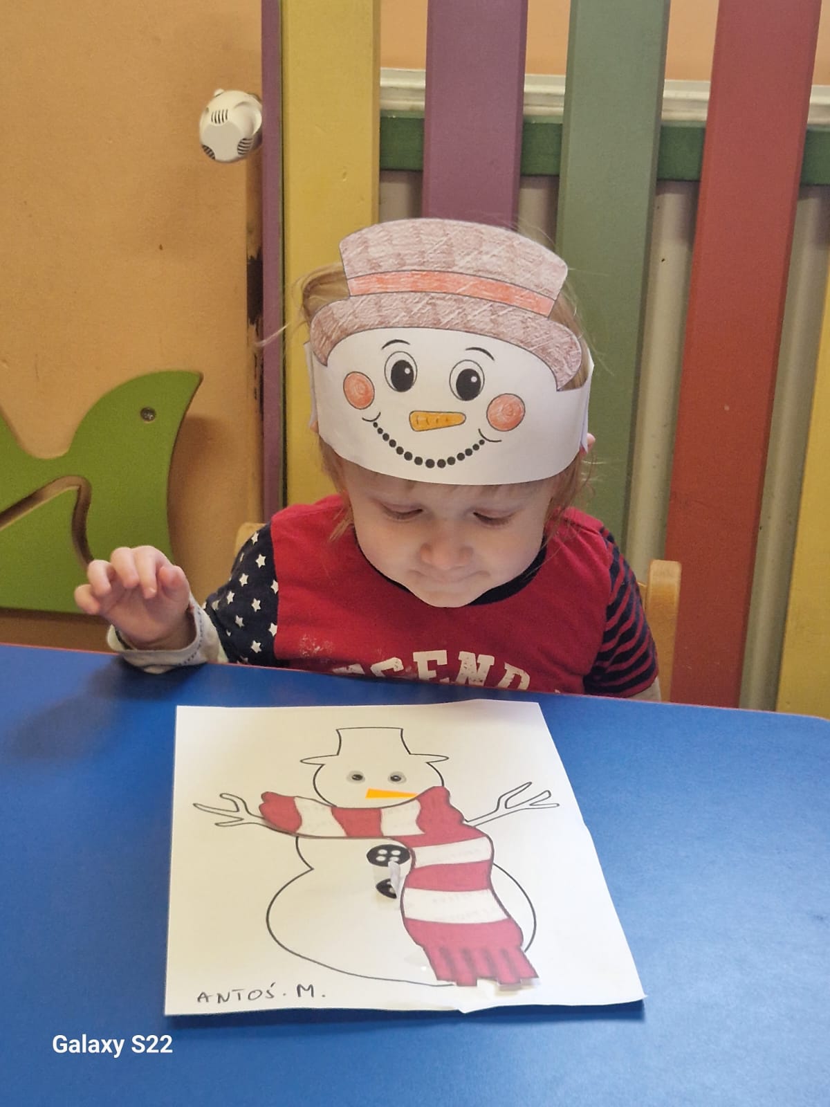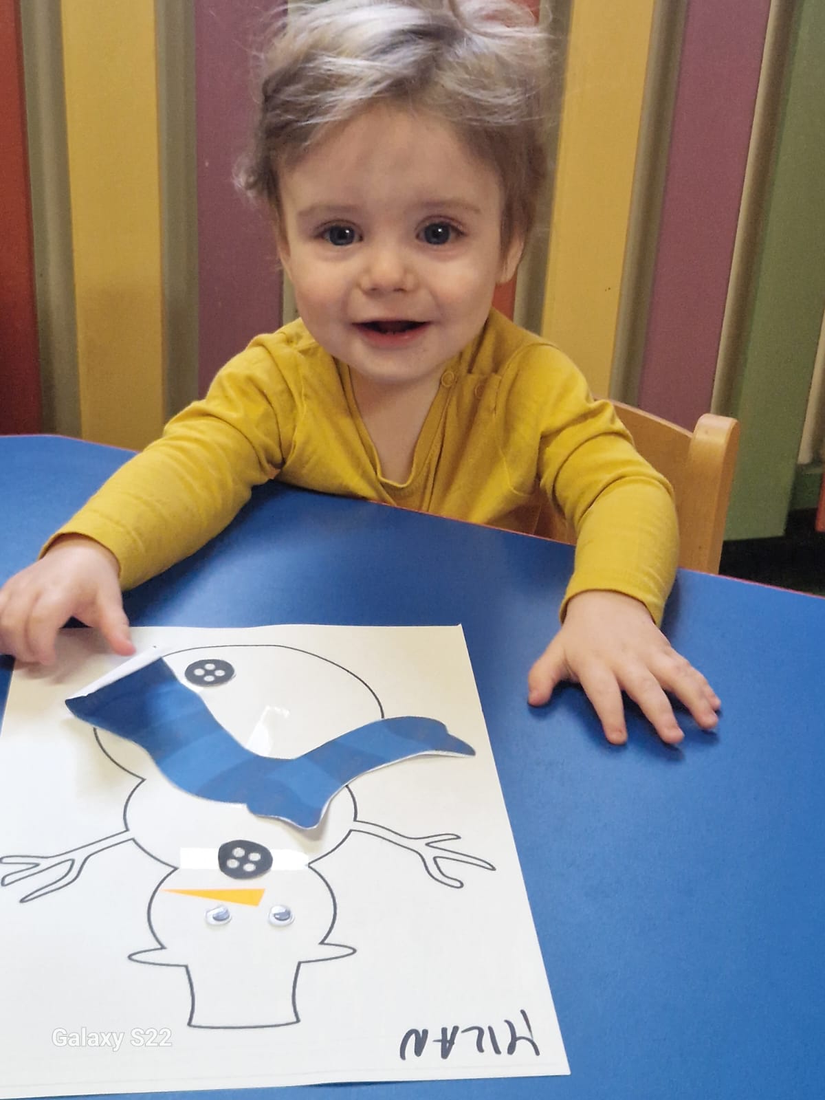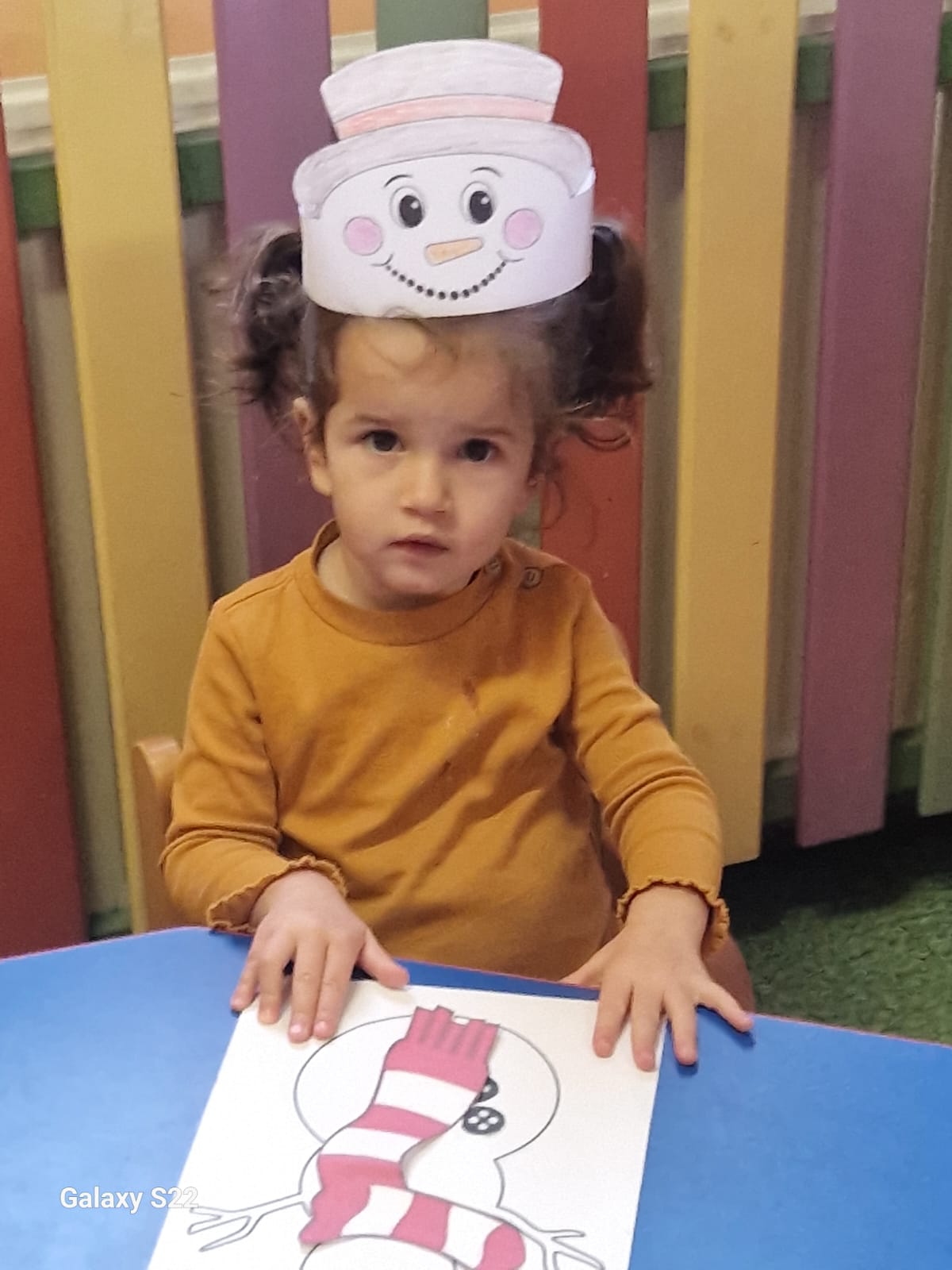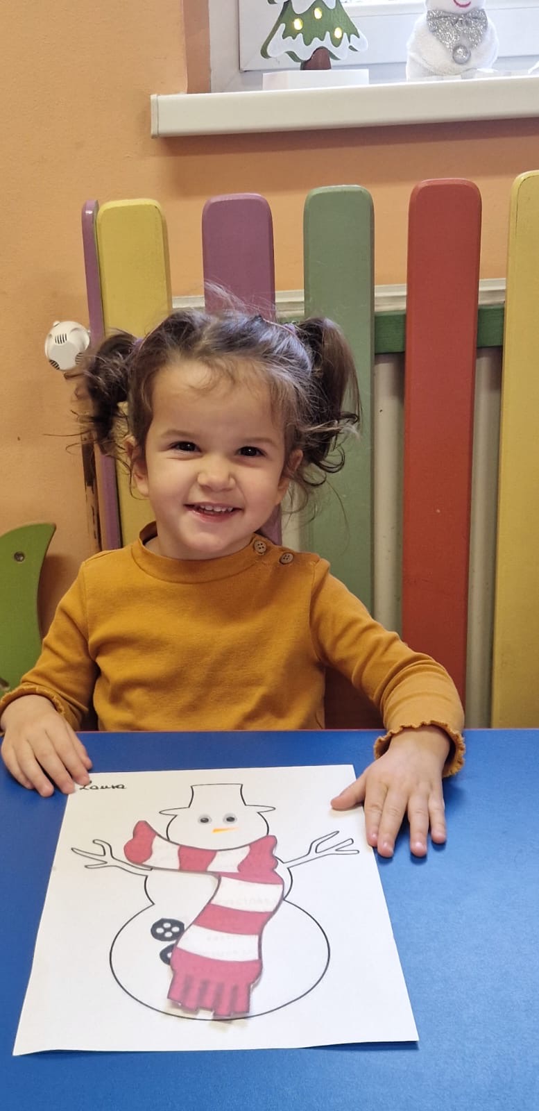 Biedronki ozdabiały zimowego bałwanka, przyklejały mu guziki i kolorowy szalik. W czapeczkach bałwanków świetnie wczuły się w zimowy klimat i z radością tworzyły swoje prace.