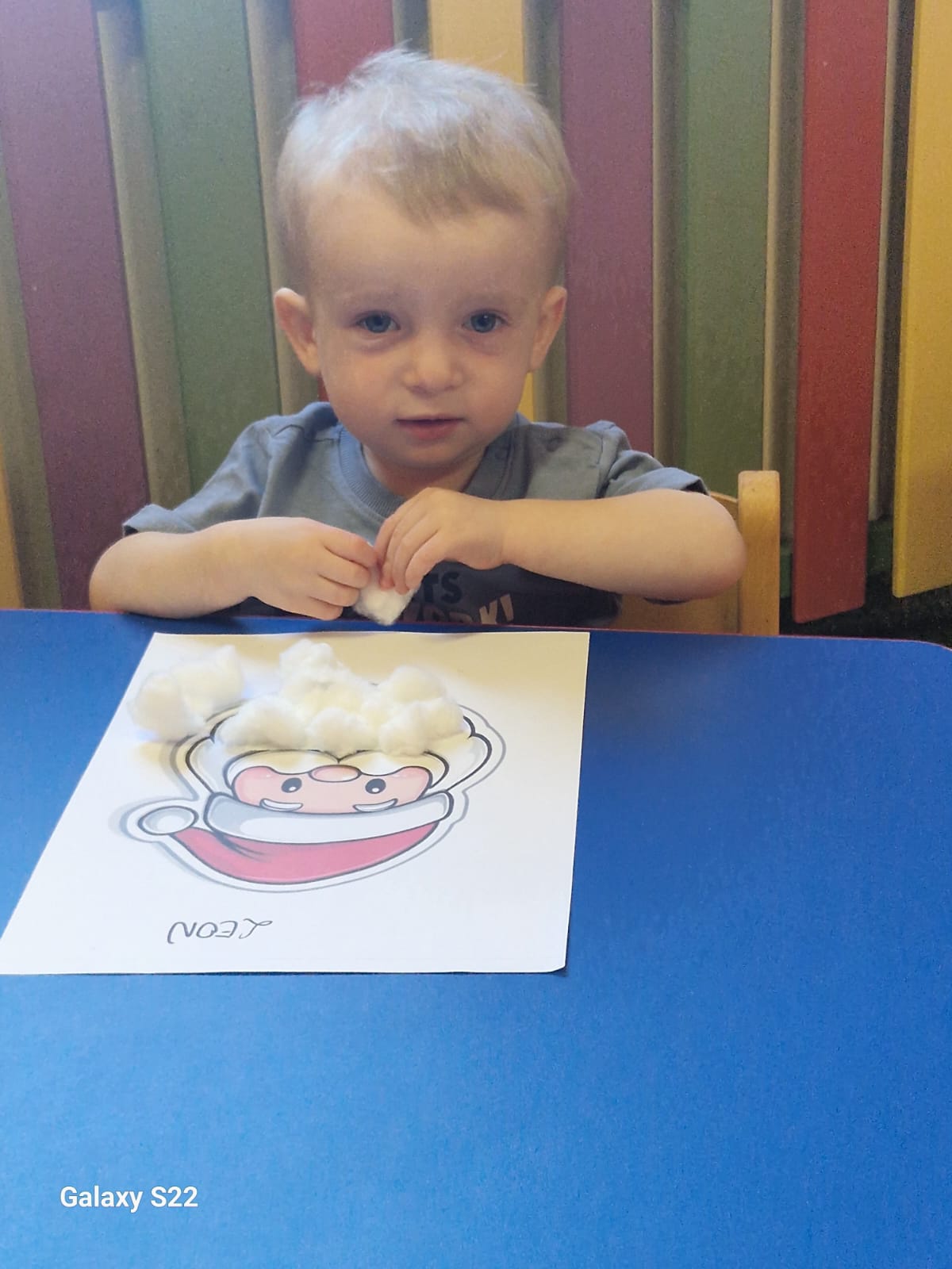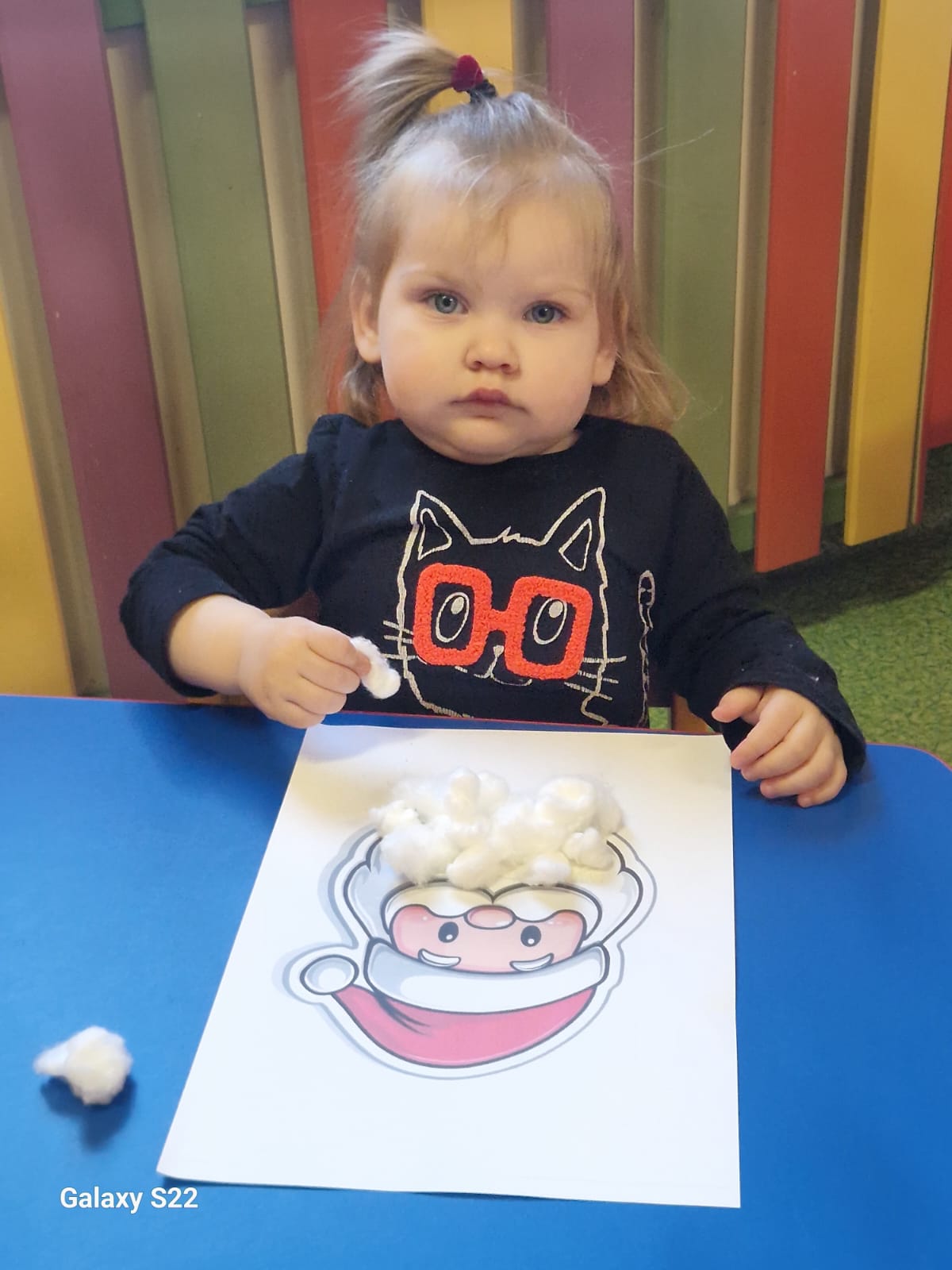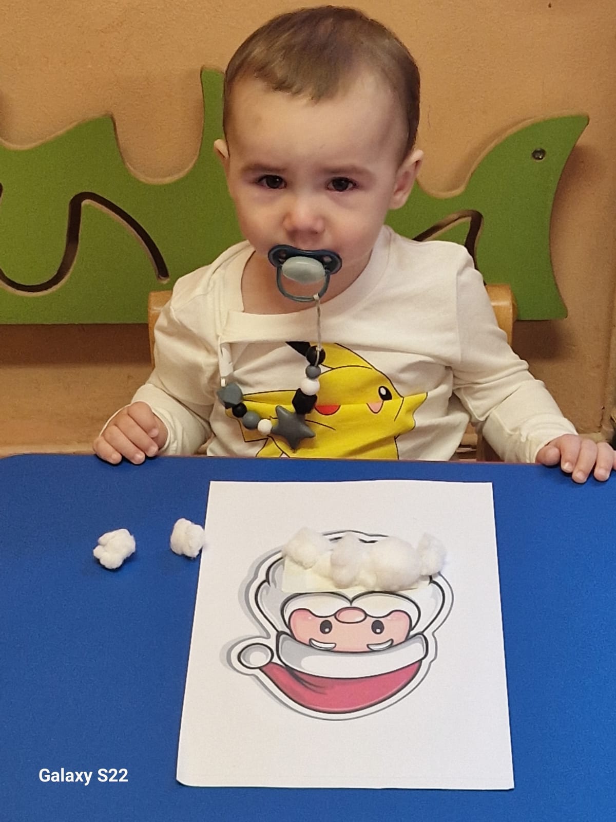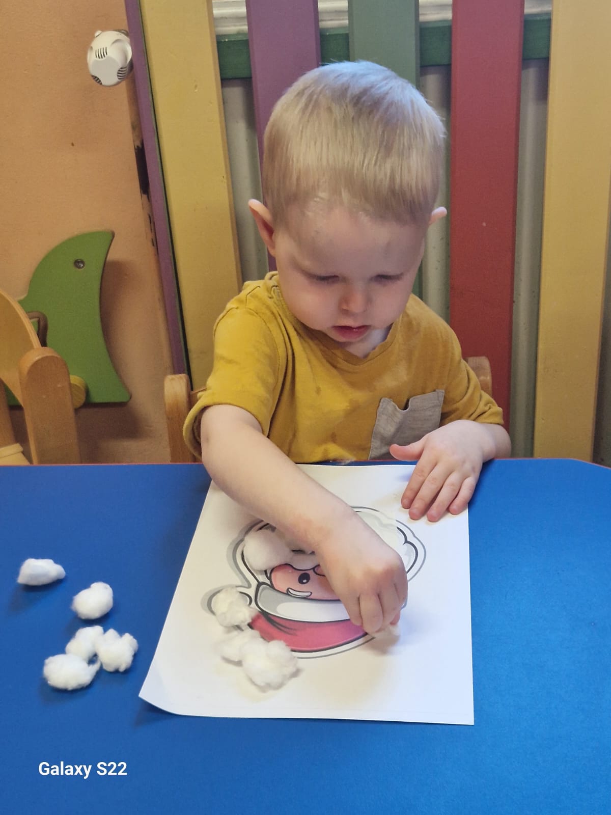 Biedronki , ozdabiały zimowego bałwanka ,przyklejały mu guziki i kolorowy szalik. W czapeczkach bałwanków świetnie wczuły się w zimowy klimat i z radością tworzyły swoje prace. Cele: - rozwój motoryki małej, -koordynacja oko-ręka, -kreatywność i wyobraźnia,