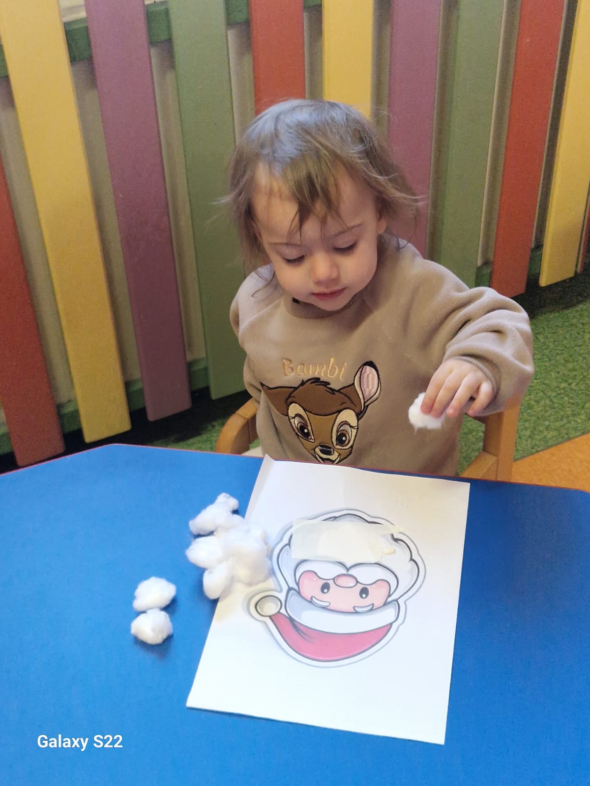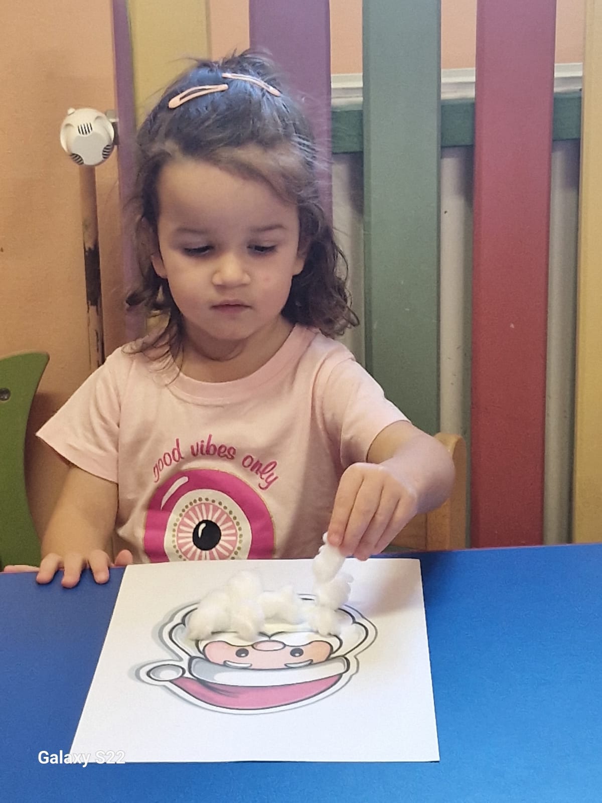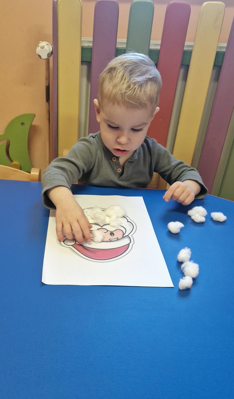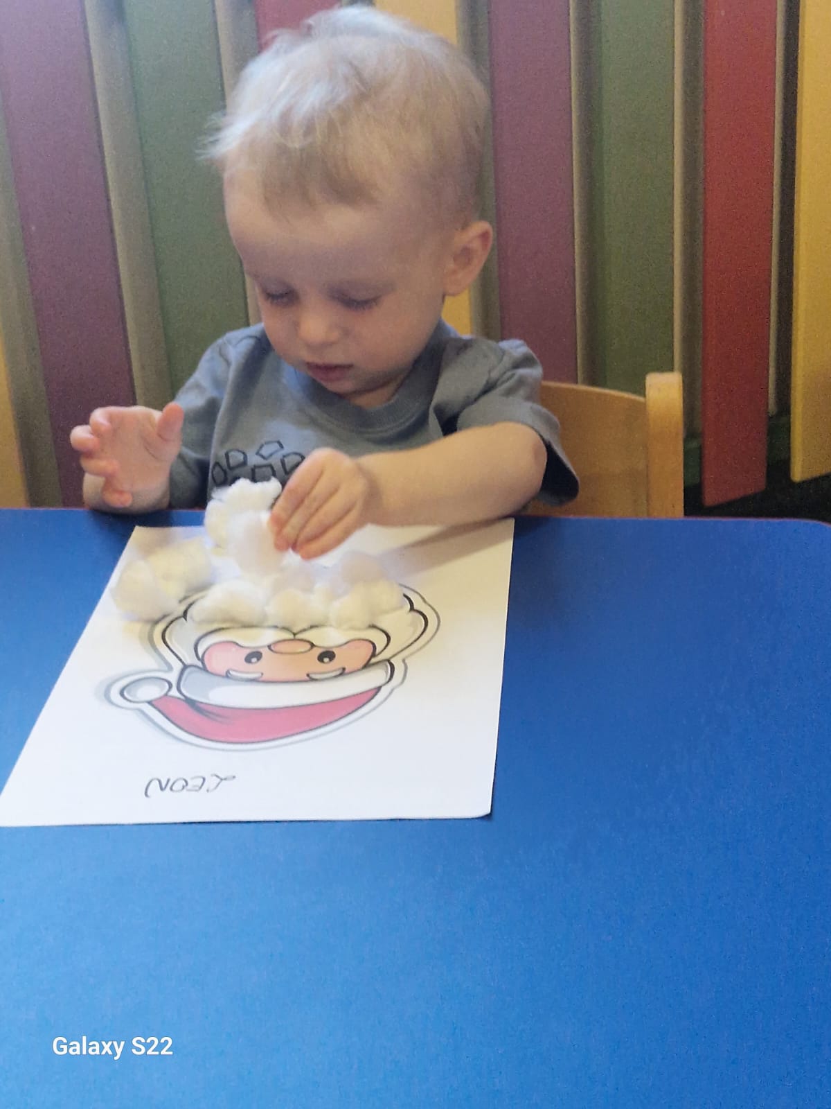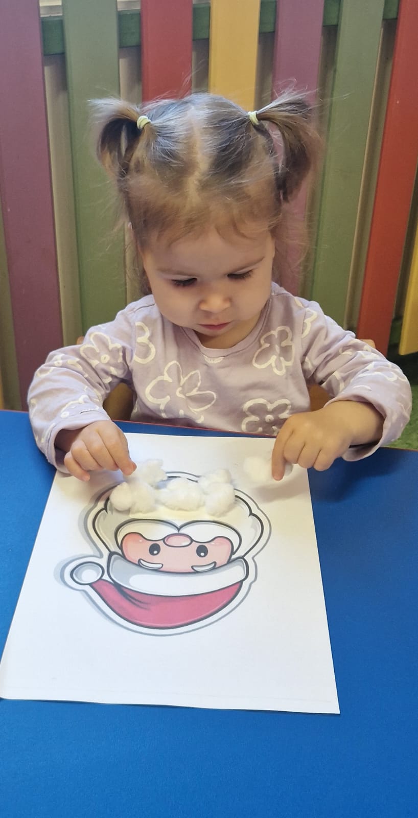 Biedronki , ozdabiały zimowego bałwanka ,przyklejały mu guziki i kolorowy szalik. W czapeczkach bałwanków świetnie wczuły się w zimowy klimat i z radością tworzyły swoje prace. Cele: - rozwój motoryki małej, -koordynacja oko-ręka, -kreatywność i wyobraźnia,