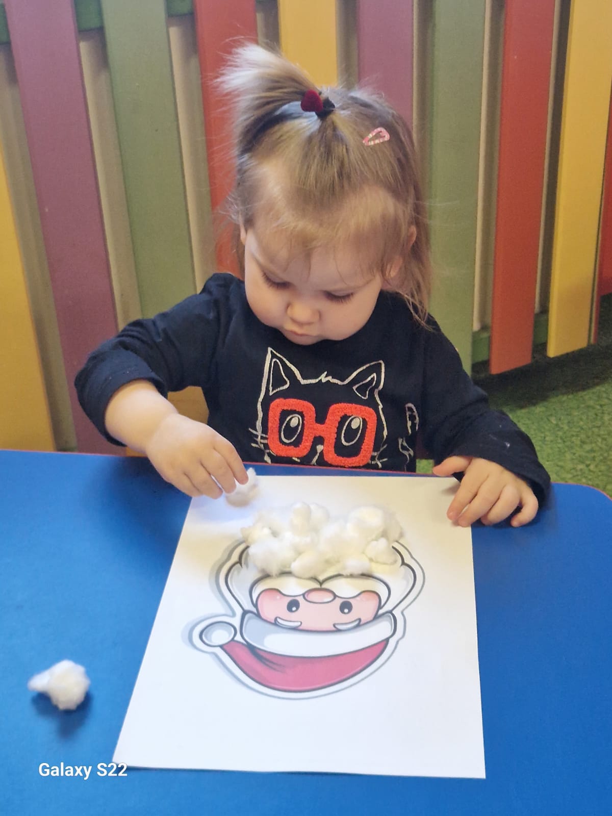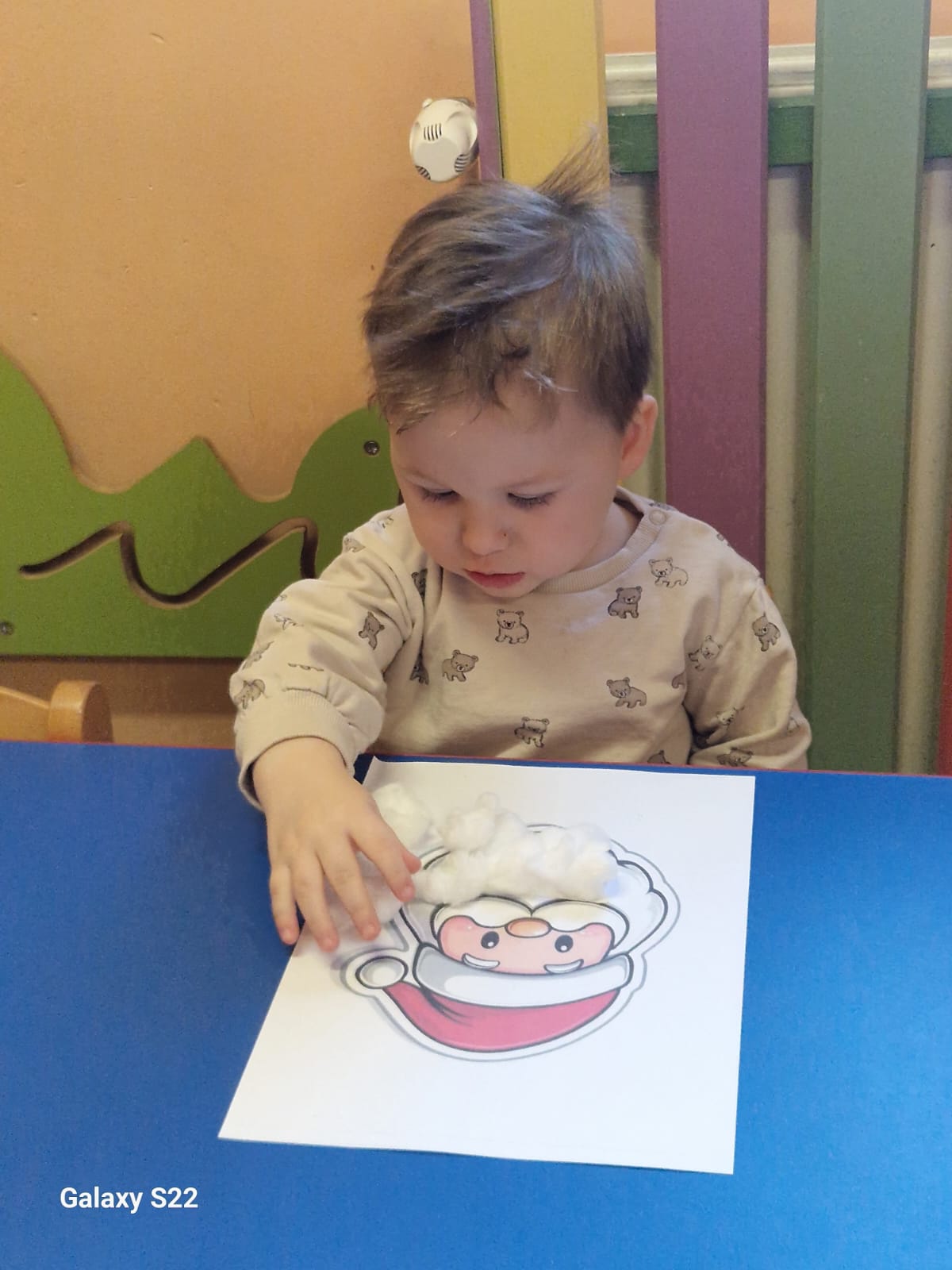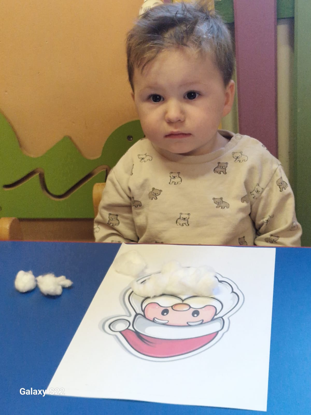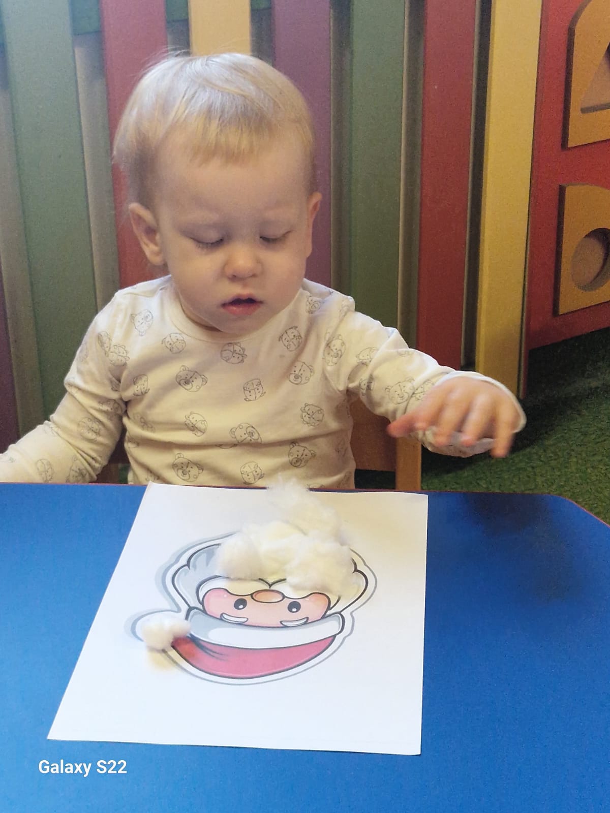 Biedronki , ozdabiały zimowego bałwanka ,przyklejały mu guziki i kolorowy szalik. W czapeczkach bałwanków świetnie wczuły się w zimowy klimat i z radością tworzyły swoje prace. Cele: - rozwój motoryki małej, -koordynacja oko-ręka, -kreatywność i wyobraźnia,