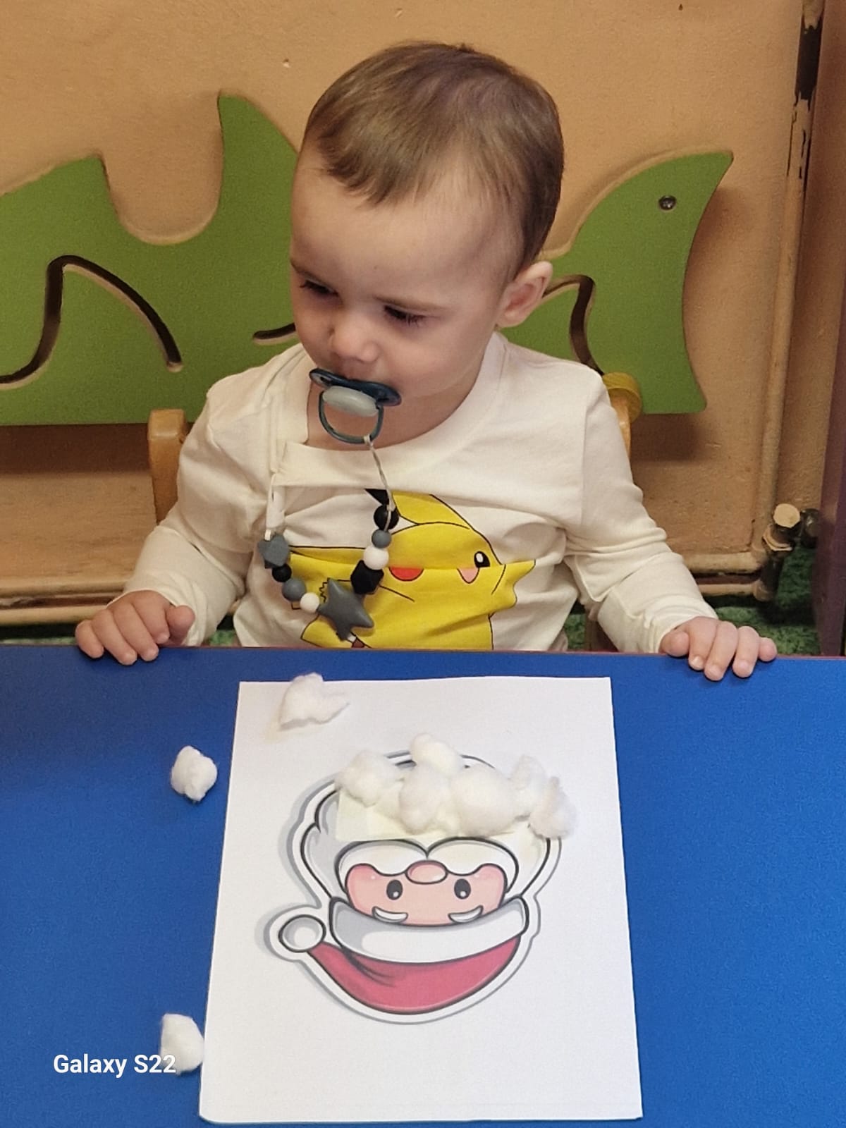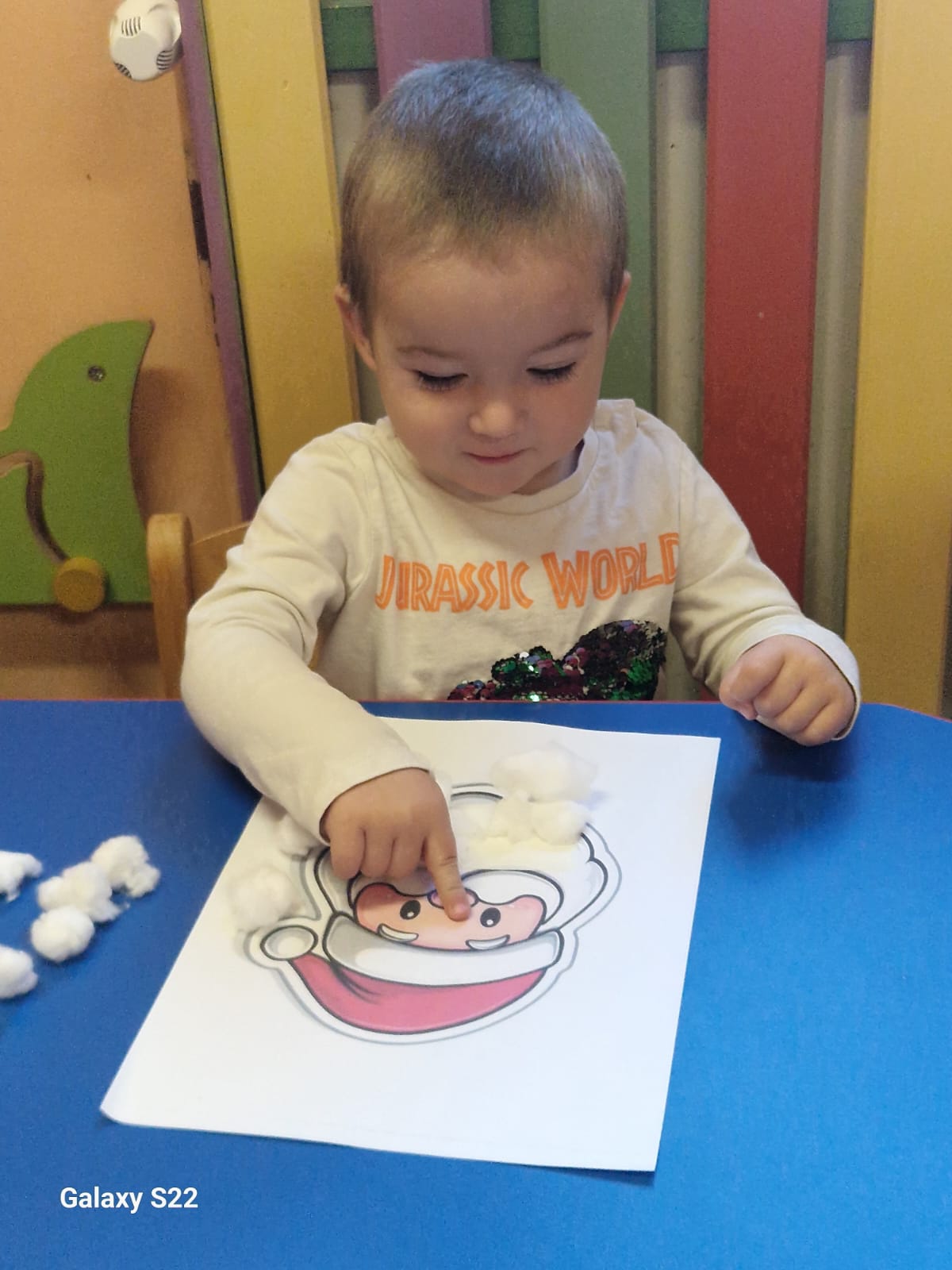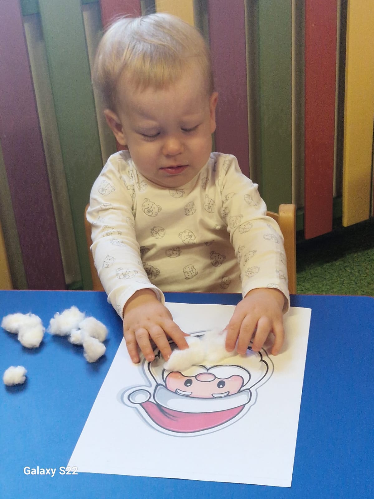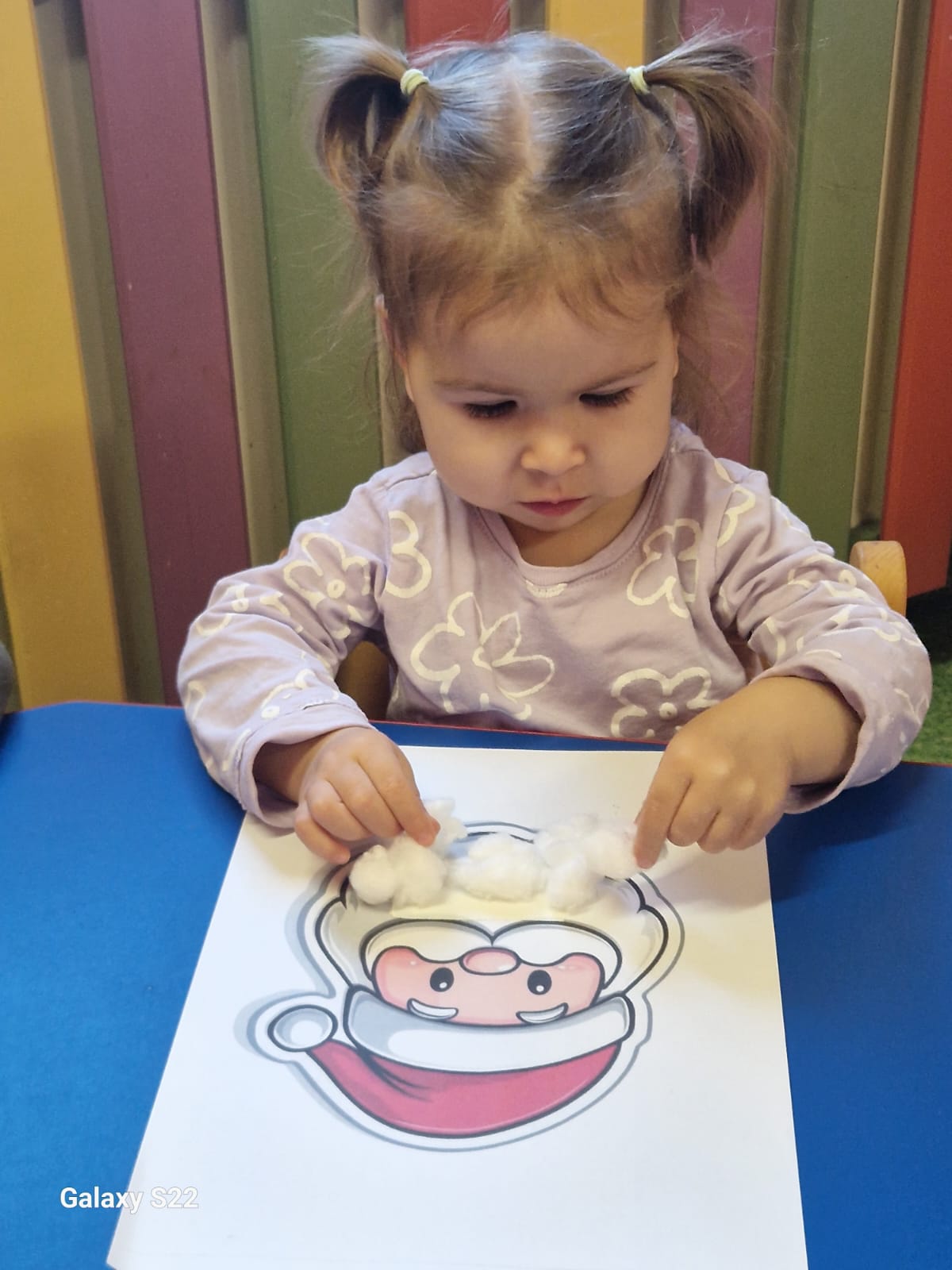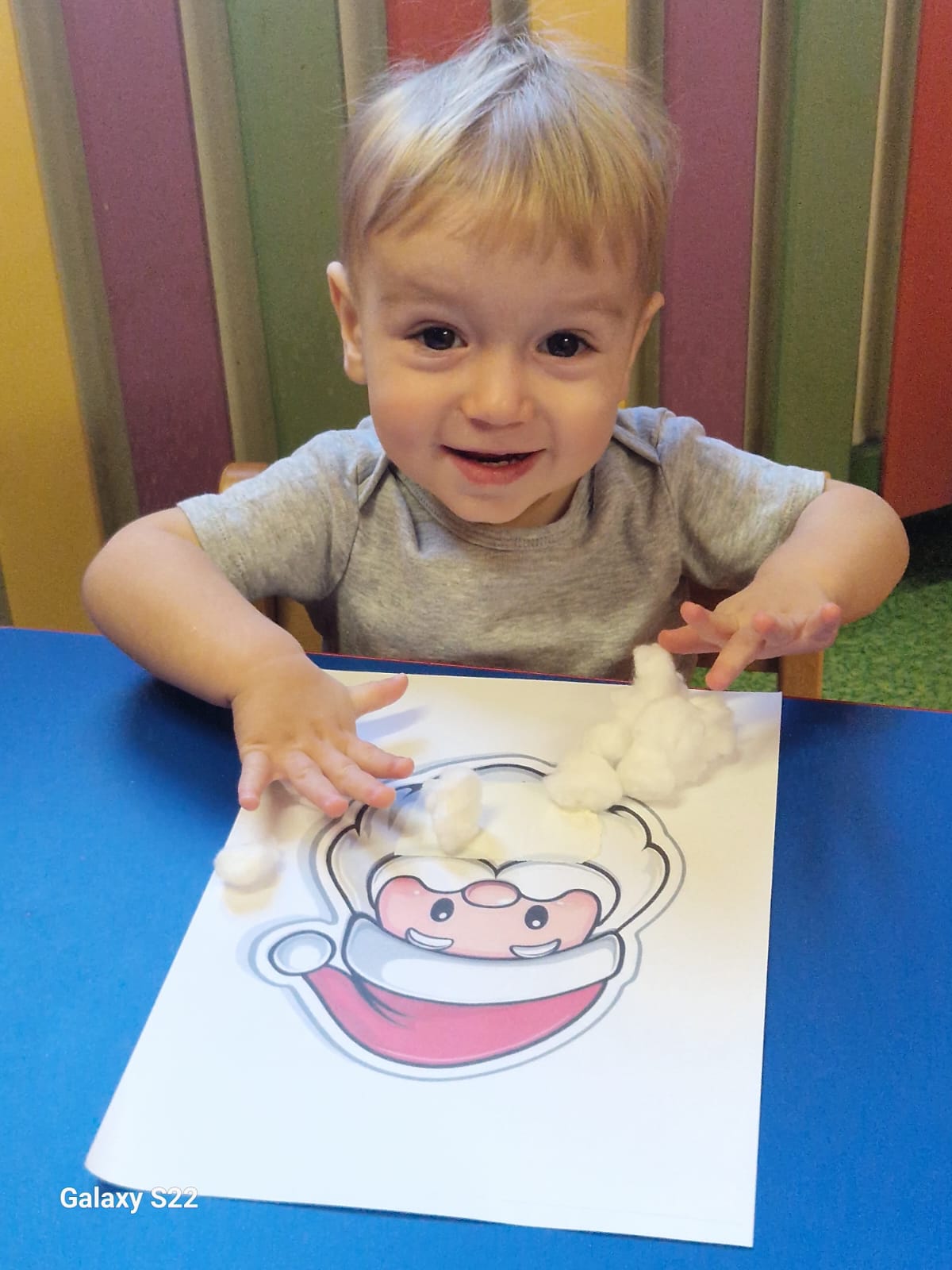 Biedronki , ozdabiały zimowego bałwanka ,przyklejały mu guziki i kolorowy szalik. W czapeczkach bałwanków świetnie wczuły się w zimowy klimat i z radością tworzyły swoje prace. Cele: - rozwój motoryki małej, -koordynacja oko-ręka, -kreatywność i wyobraźnia,
