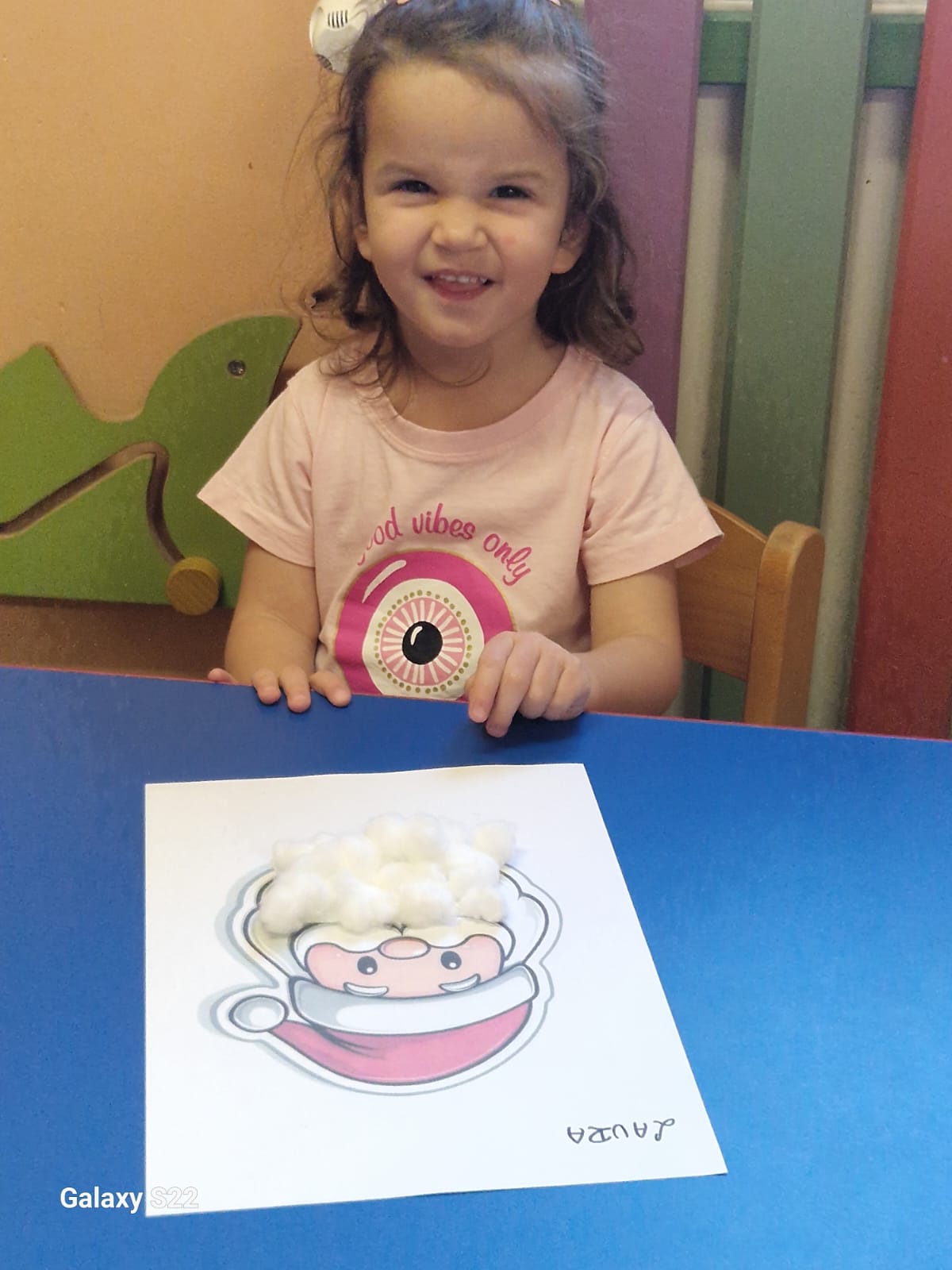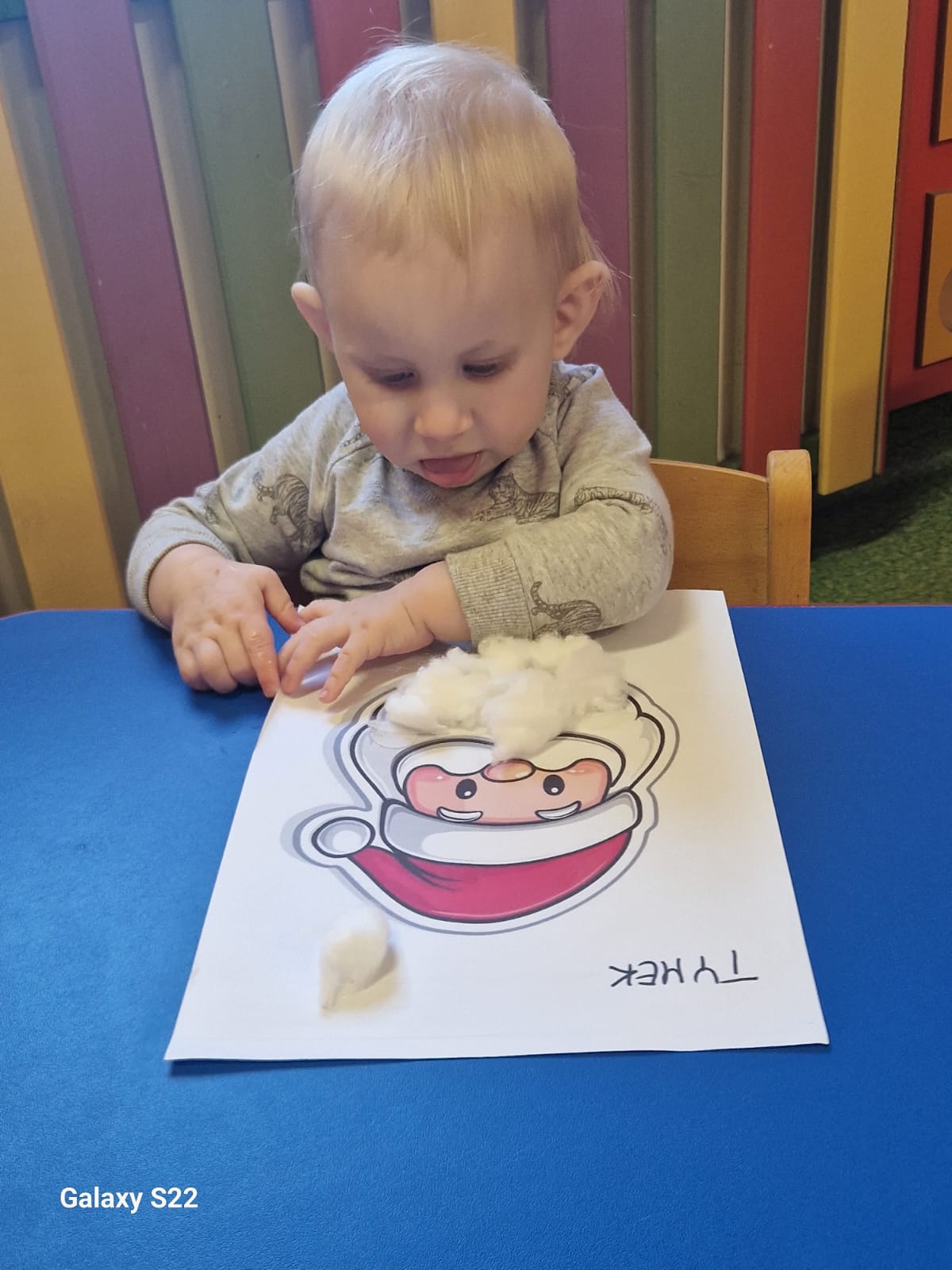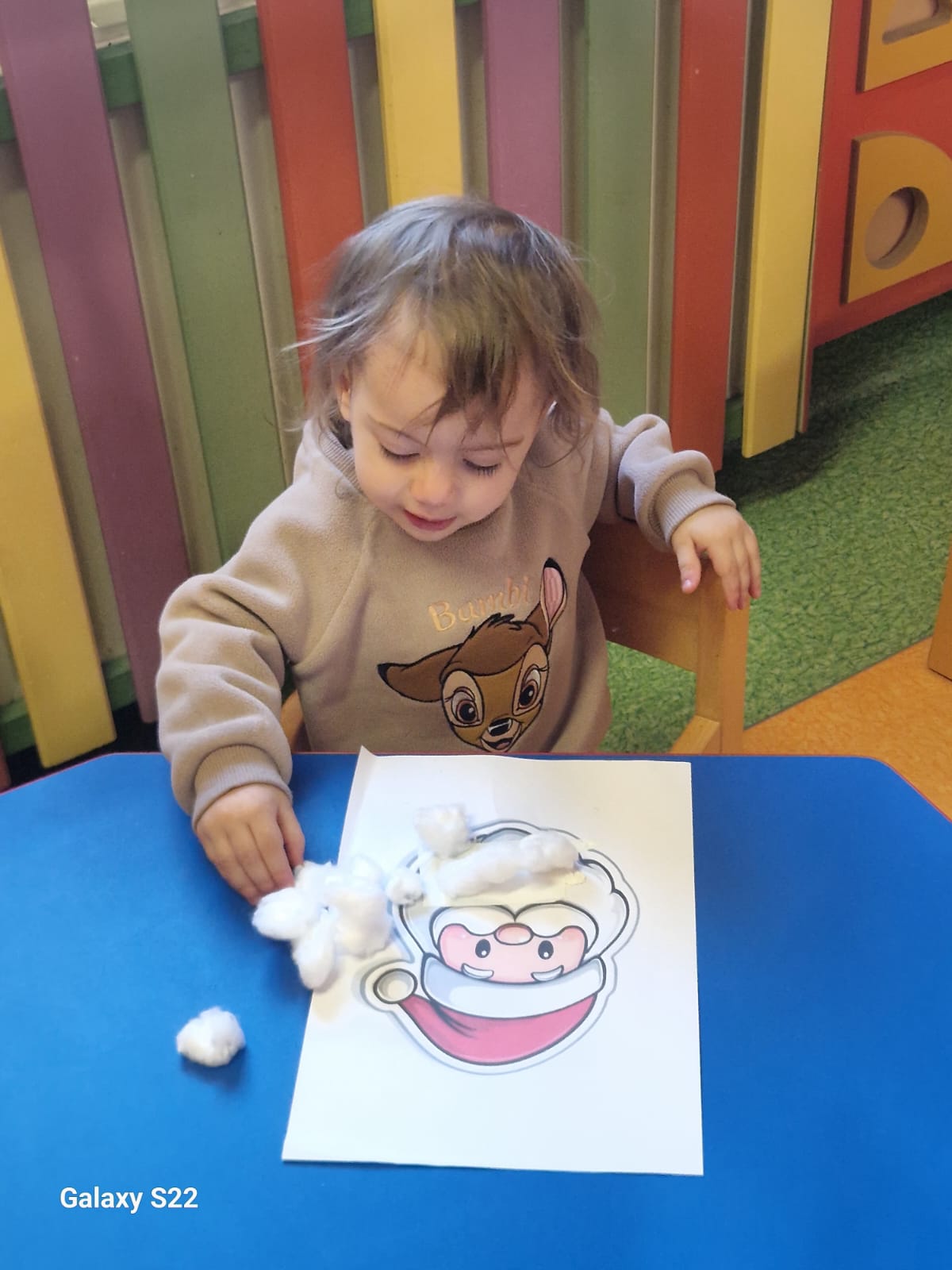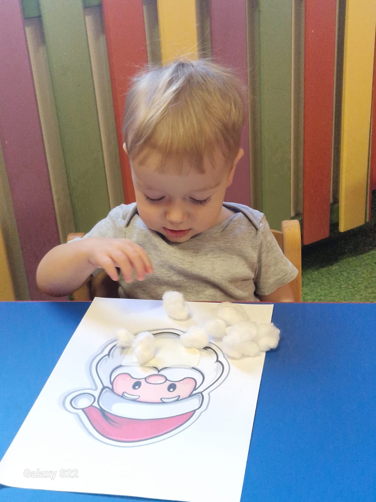Biedronki , ozdabiały zimowego bałwanka ,przyklejały mu guziki i kolorowy szalik. W czapeczkach bałwanków świetnie wczuły się w zimowy klimat i z radością tworzyły swoje prace. Cele: - rozwój motoryki małej, -koordynacja oko-ręka, -kreatywność i wyobraźnia,