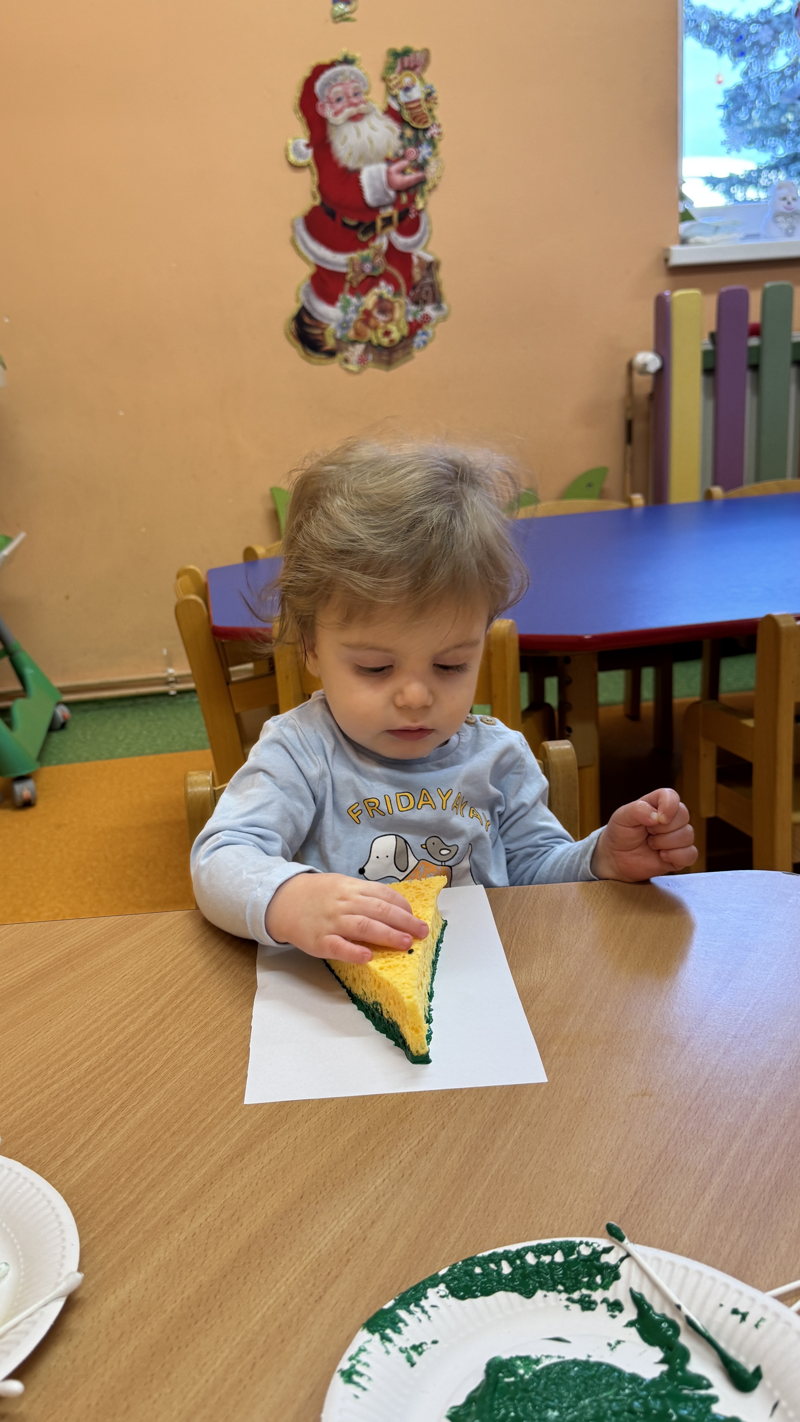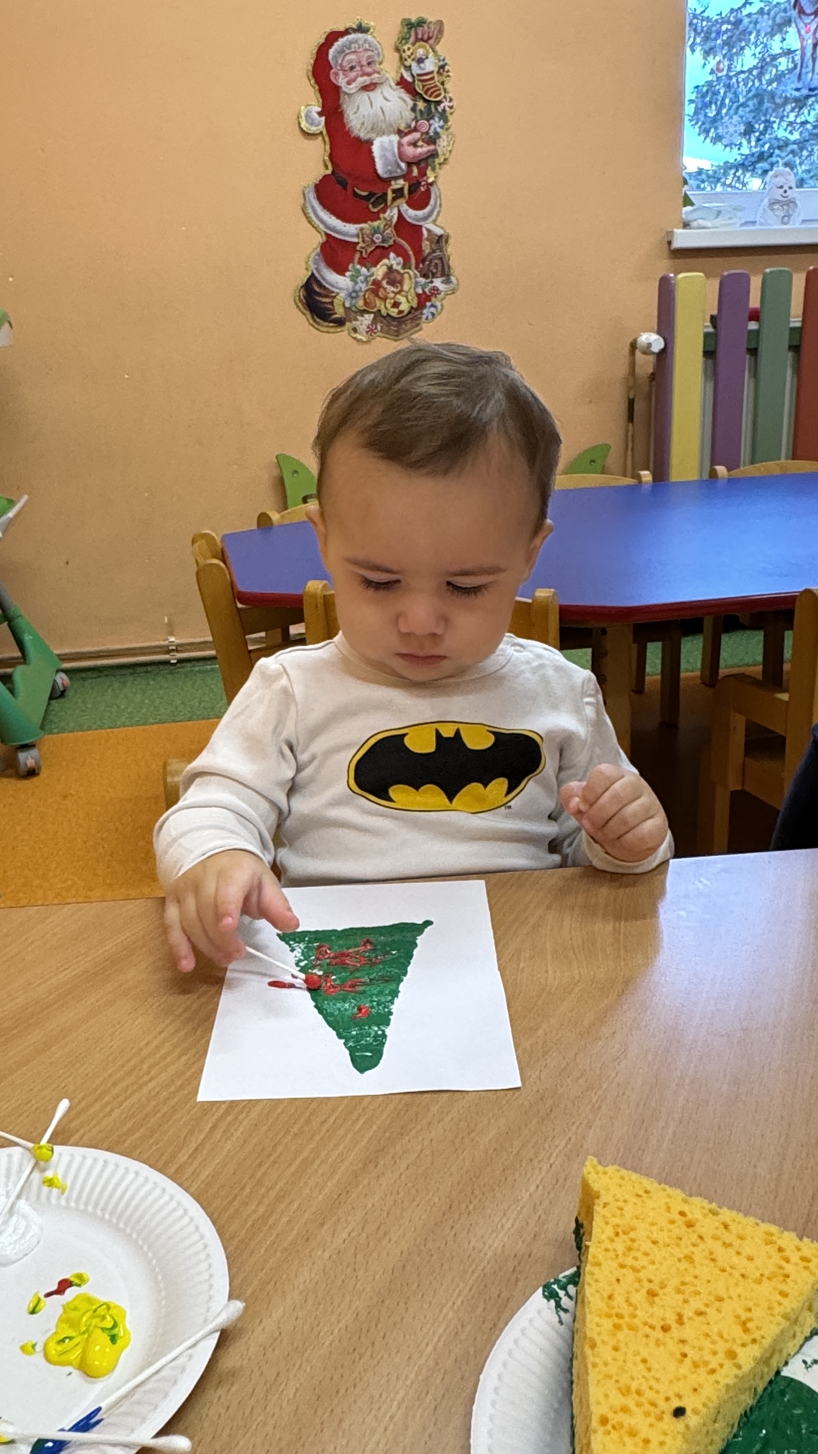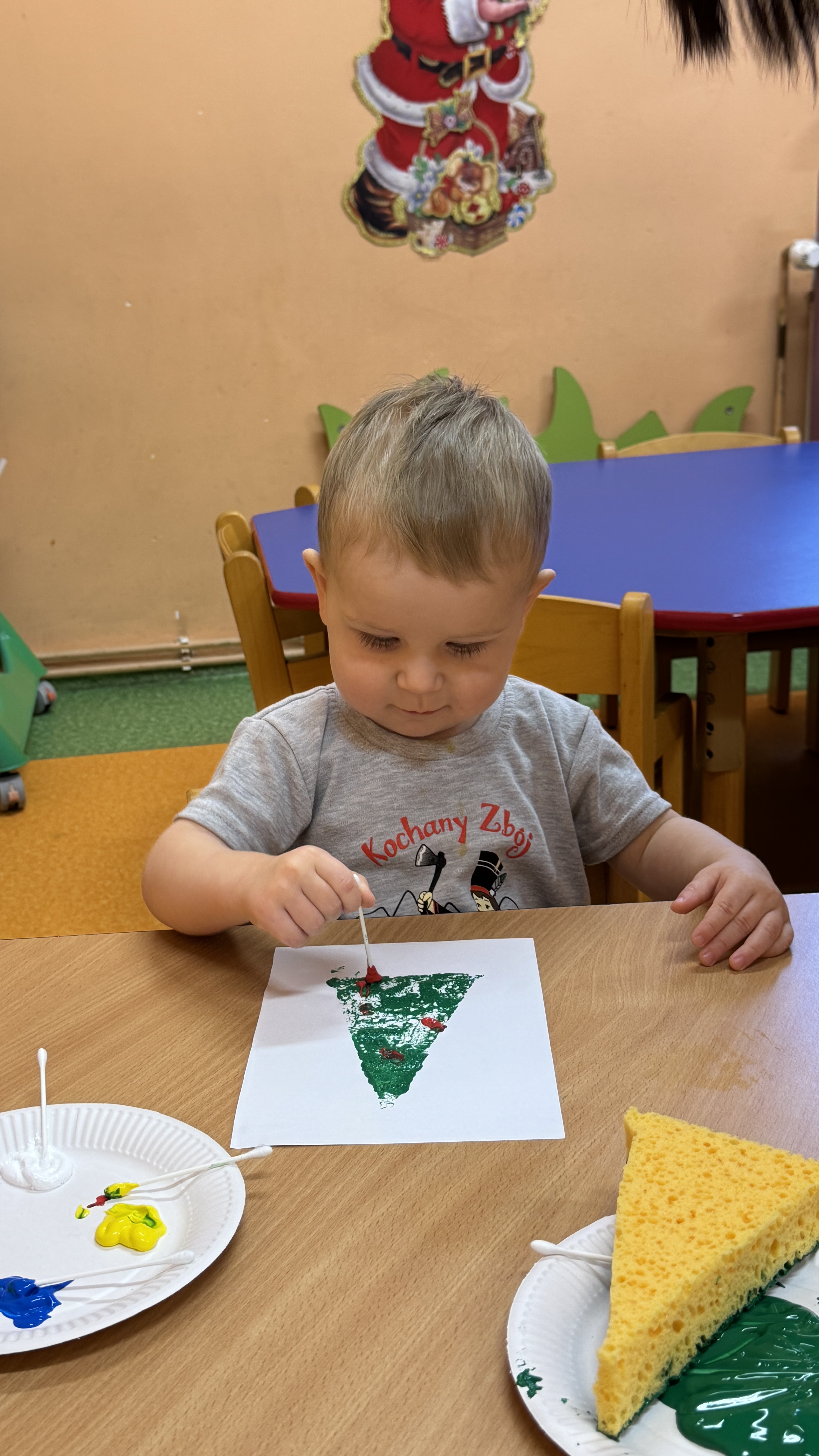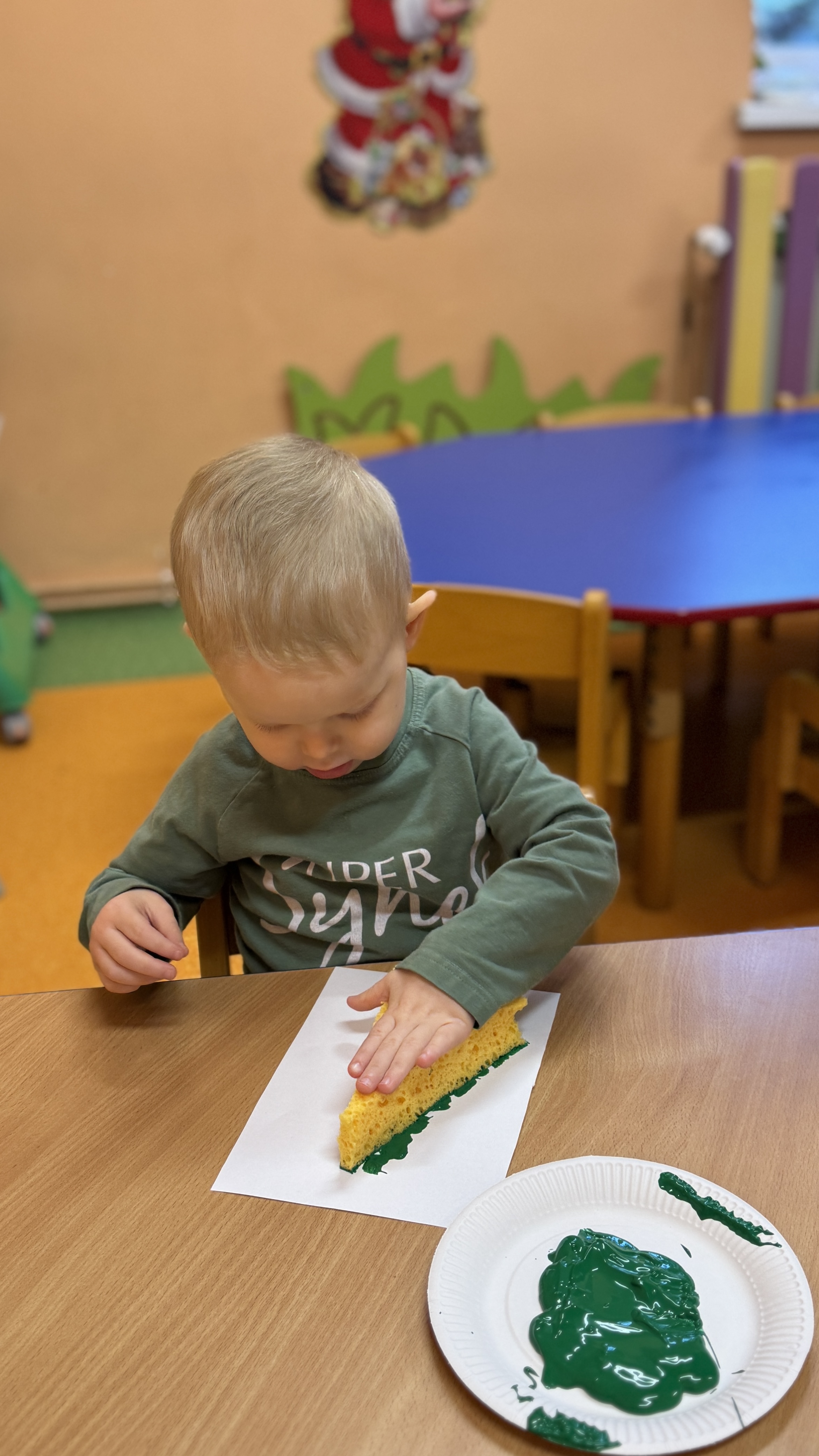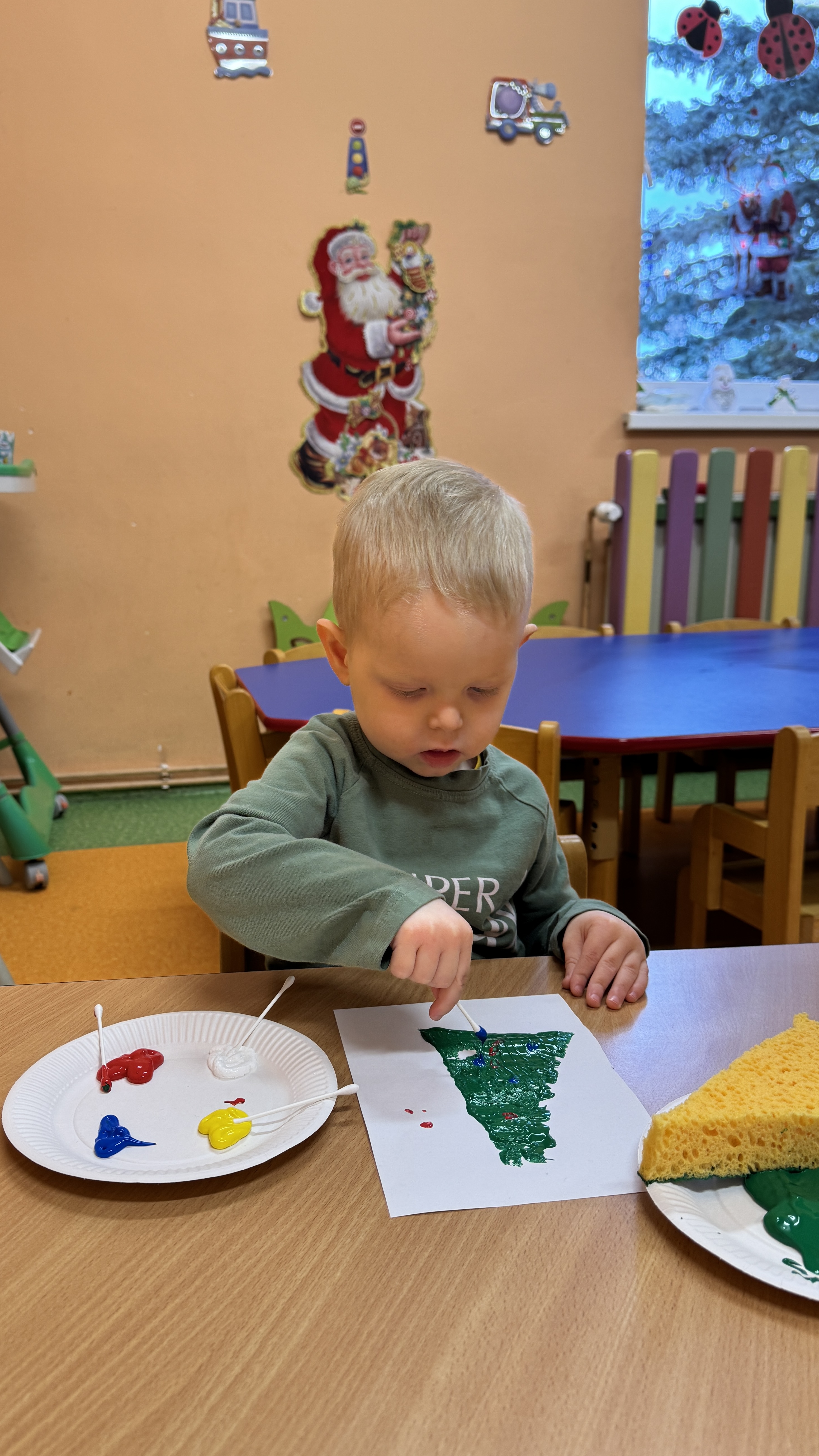 Nasze Biedroneczki dziś stemplowały choinki gąbką, ozdabiając je kolorowymi bombkami z patyczków tworząc świąteczne prace plastyczne. Nasze Maluszki rozwijały przy tym sprawność rąk i kreatywność.