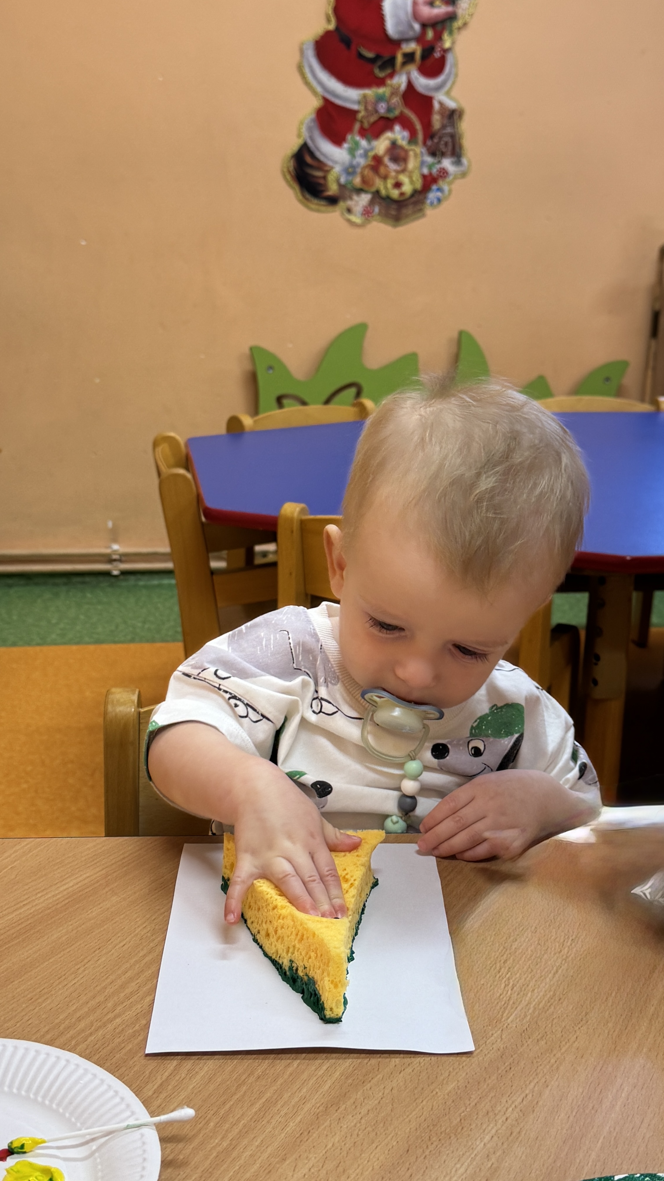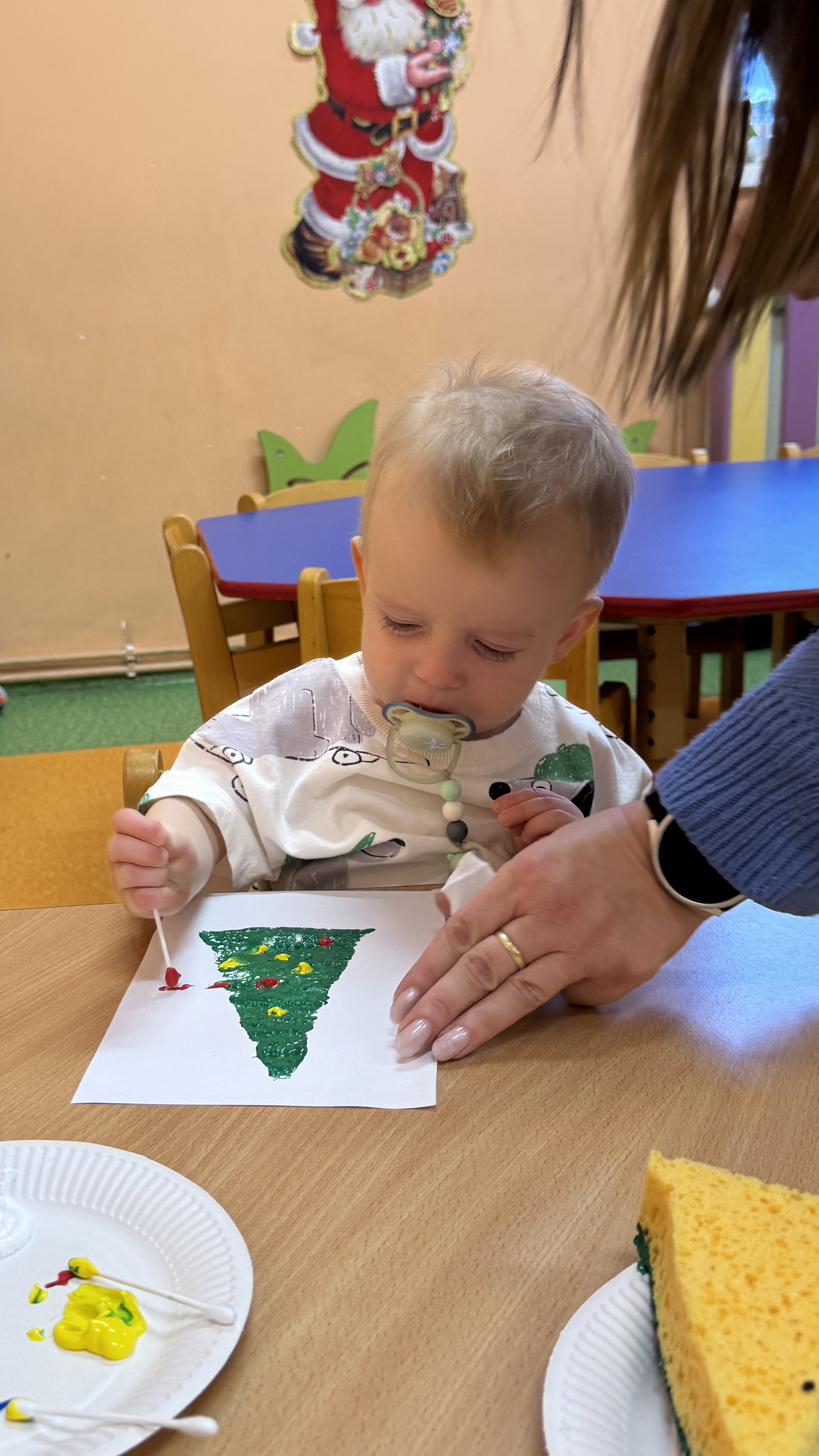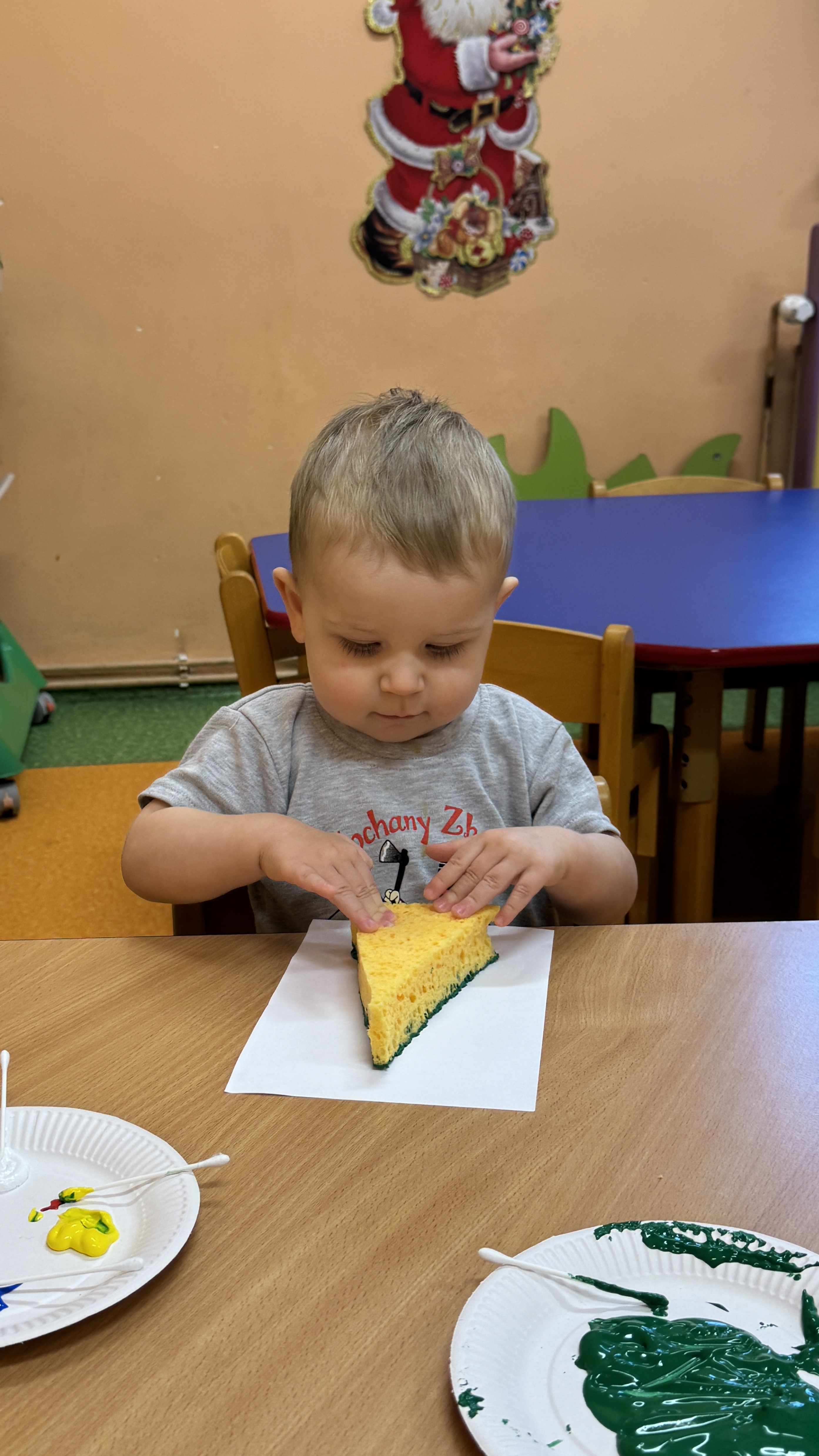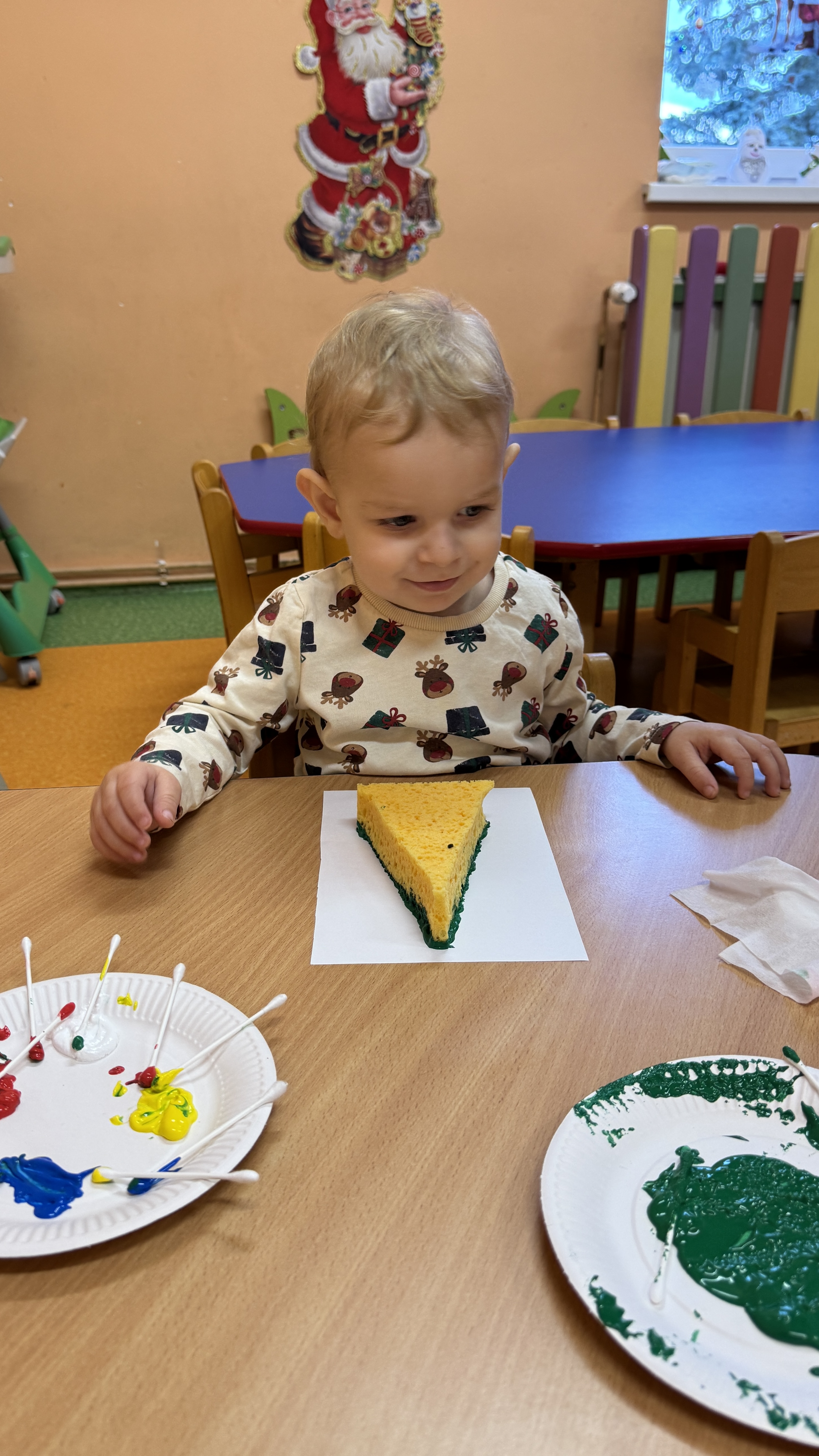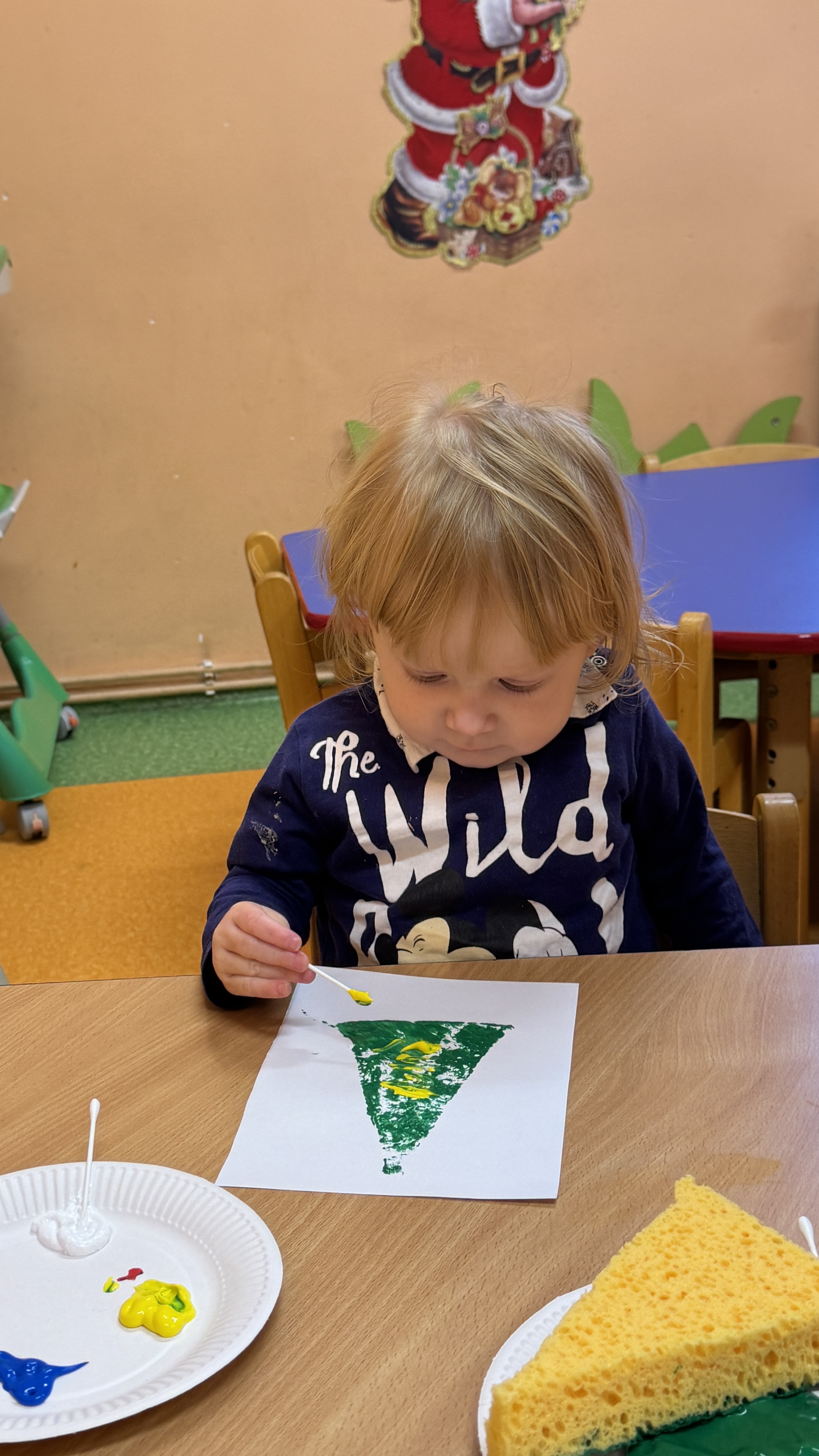 Nasze Biedroneczki dziś stemplowały choinki gąbką, ozdabiając je kolorowymi bombkami z patyczków tworząc świąteczne prace plastyczne. Nasze Maluszki rozwijały przy tym sprawność rąk i kreatywność.