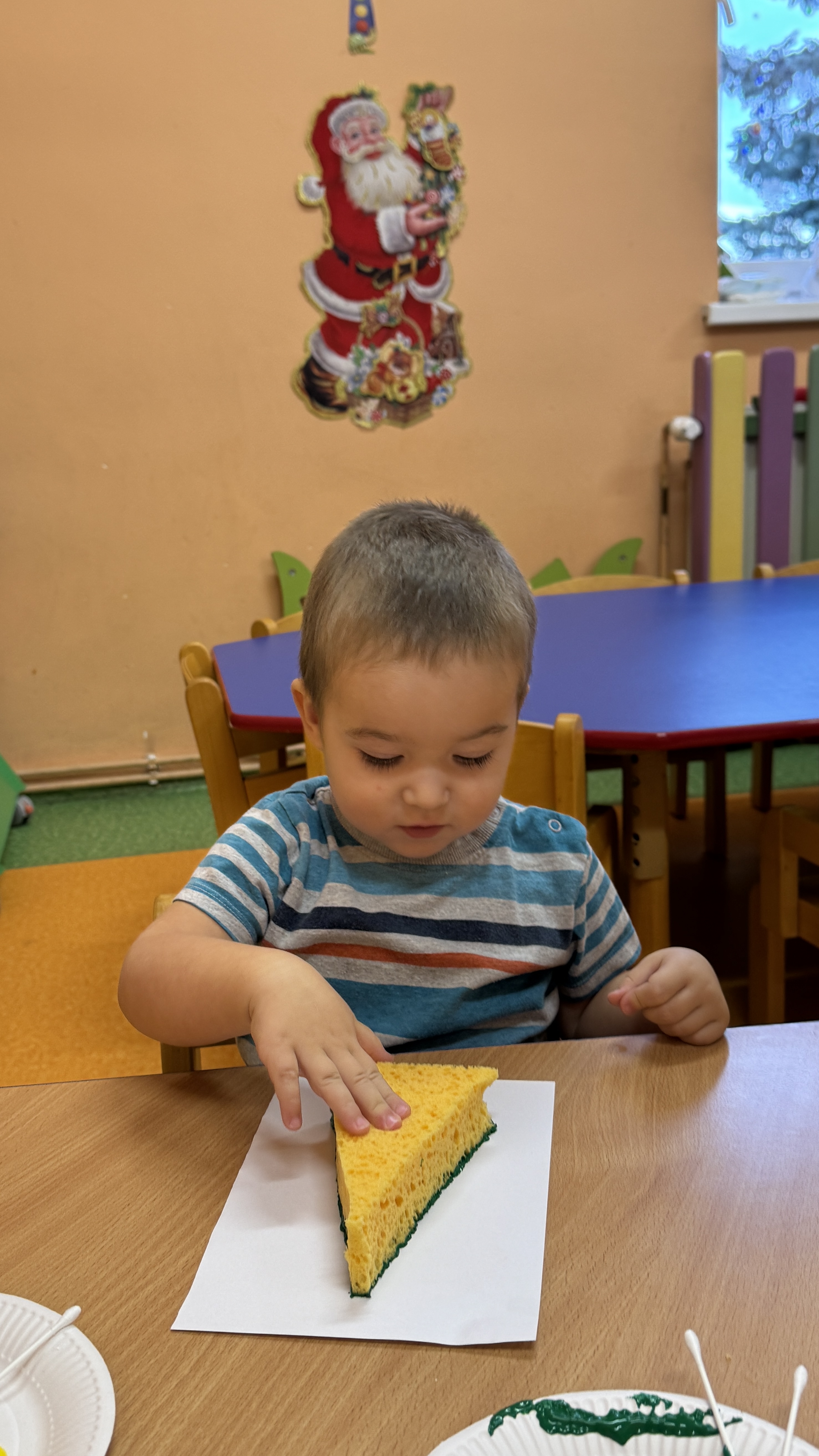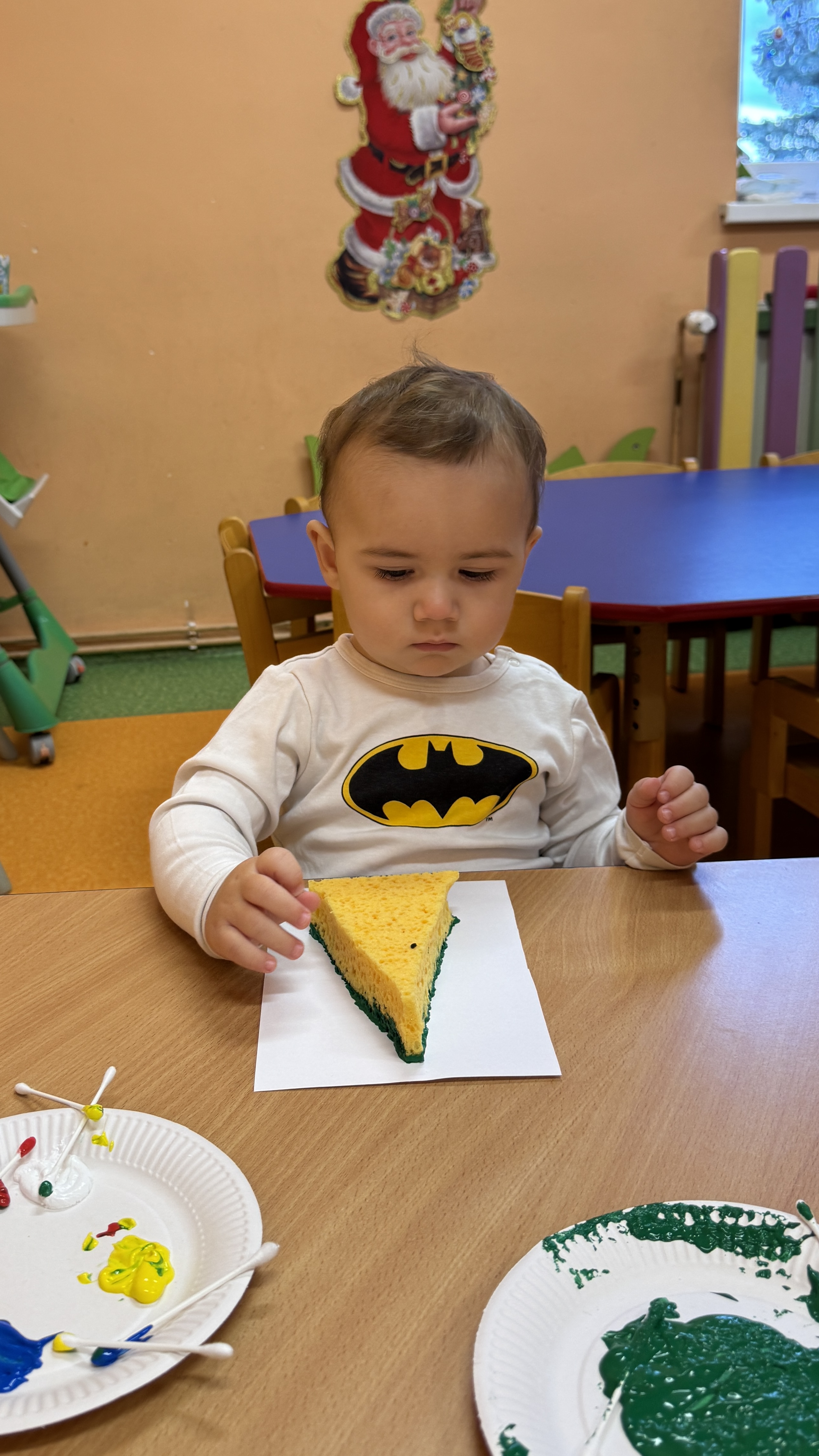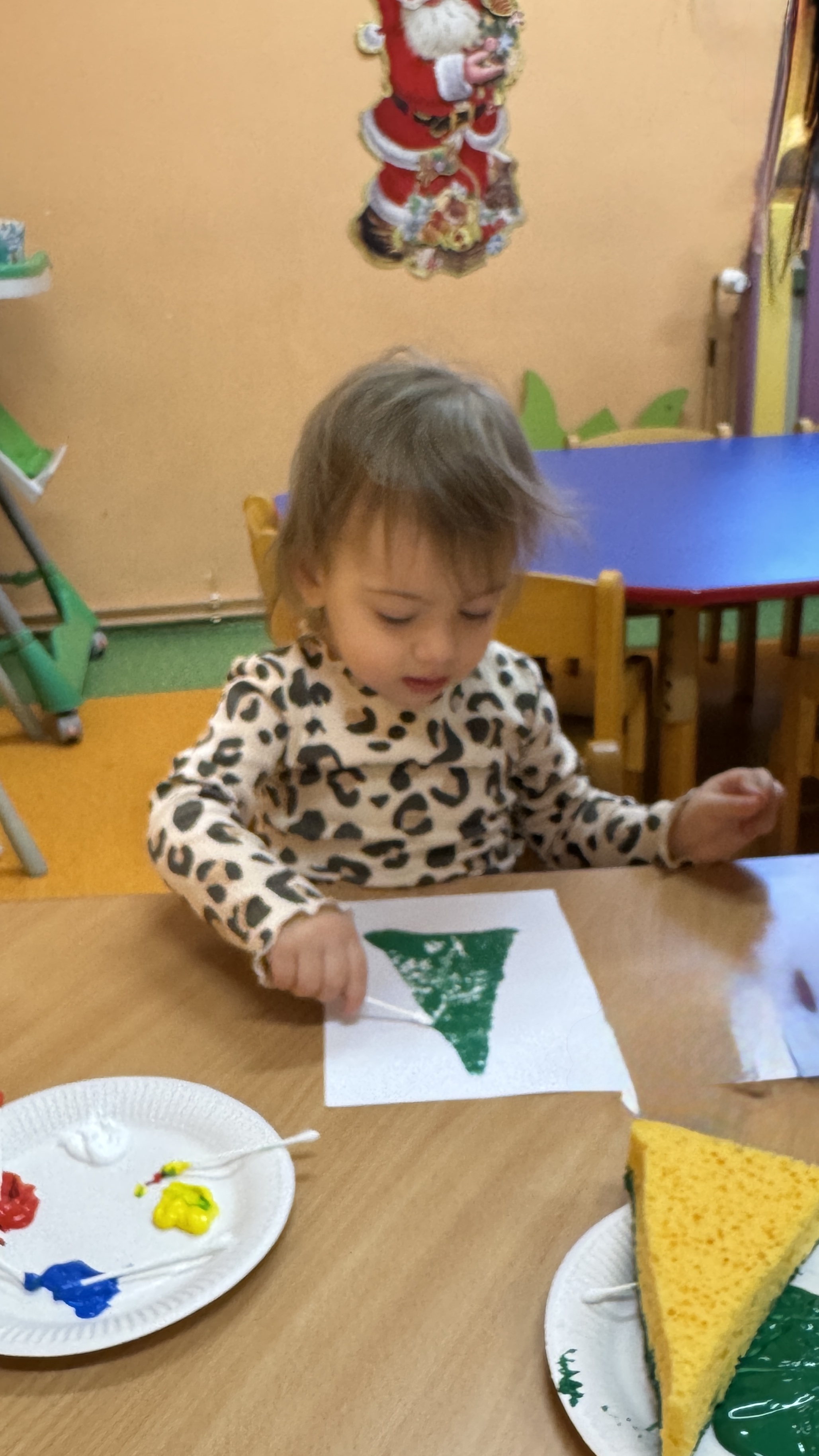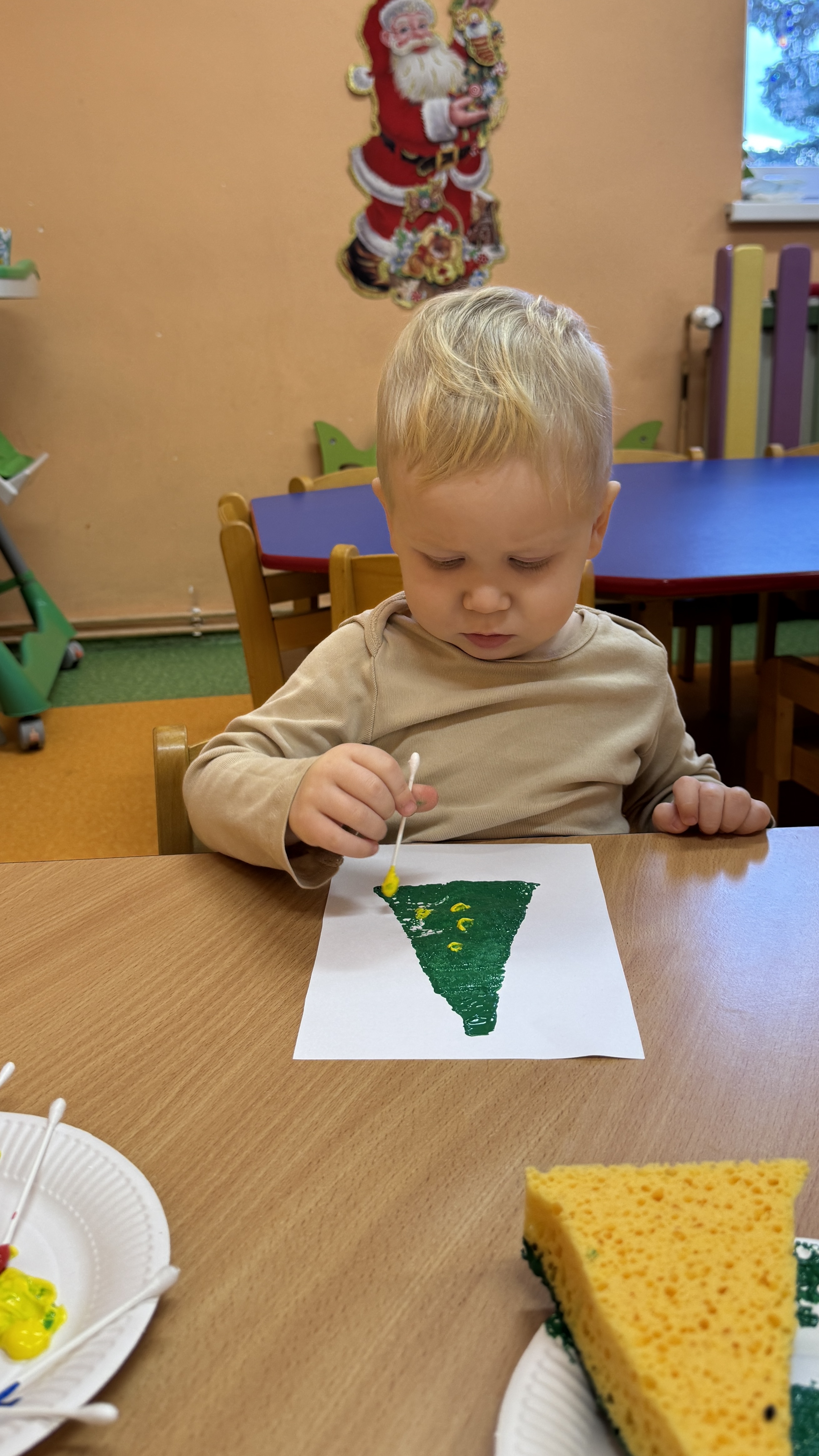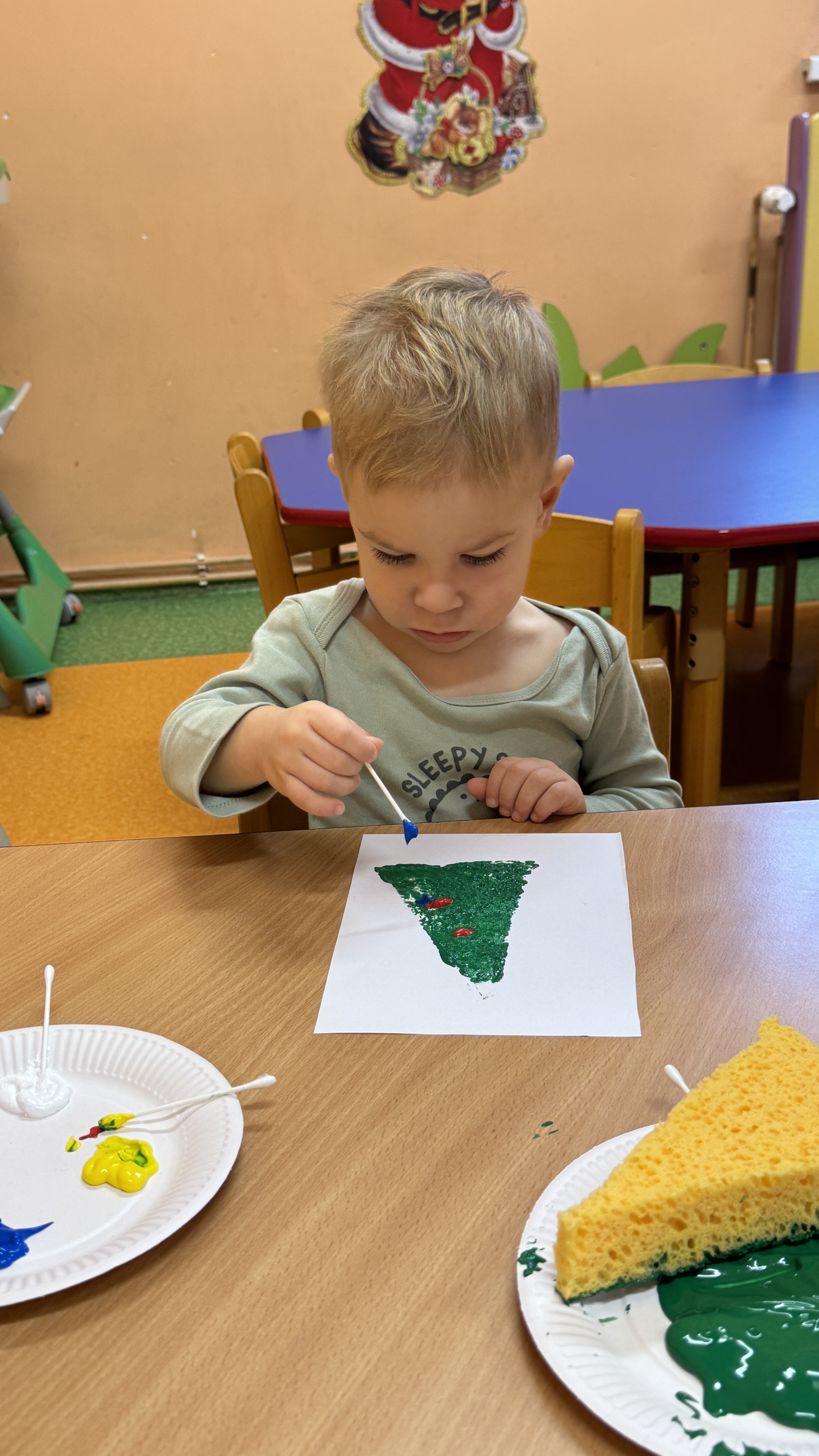 Nasze Biedroneczki dziś stemplowały choinki gąbką, ozdabiając je kolorowymi bombkami z patyczków tworząc świąteczne prace plastyczne. Nasze Maluszki rozwijały przy tym sprawność rąk i kreatywność.