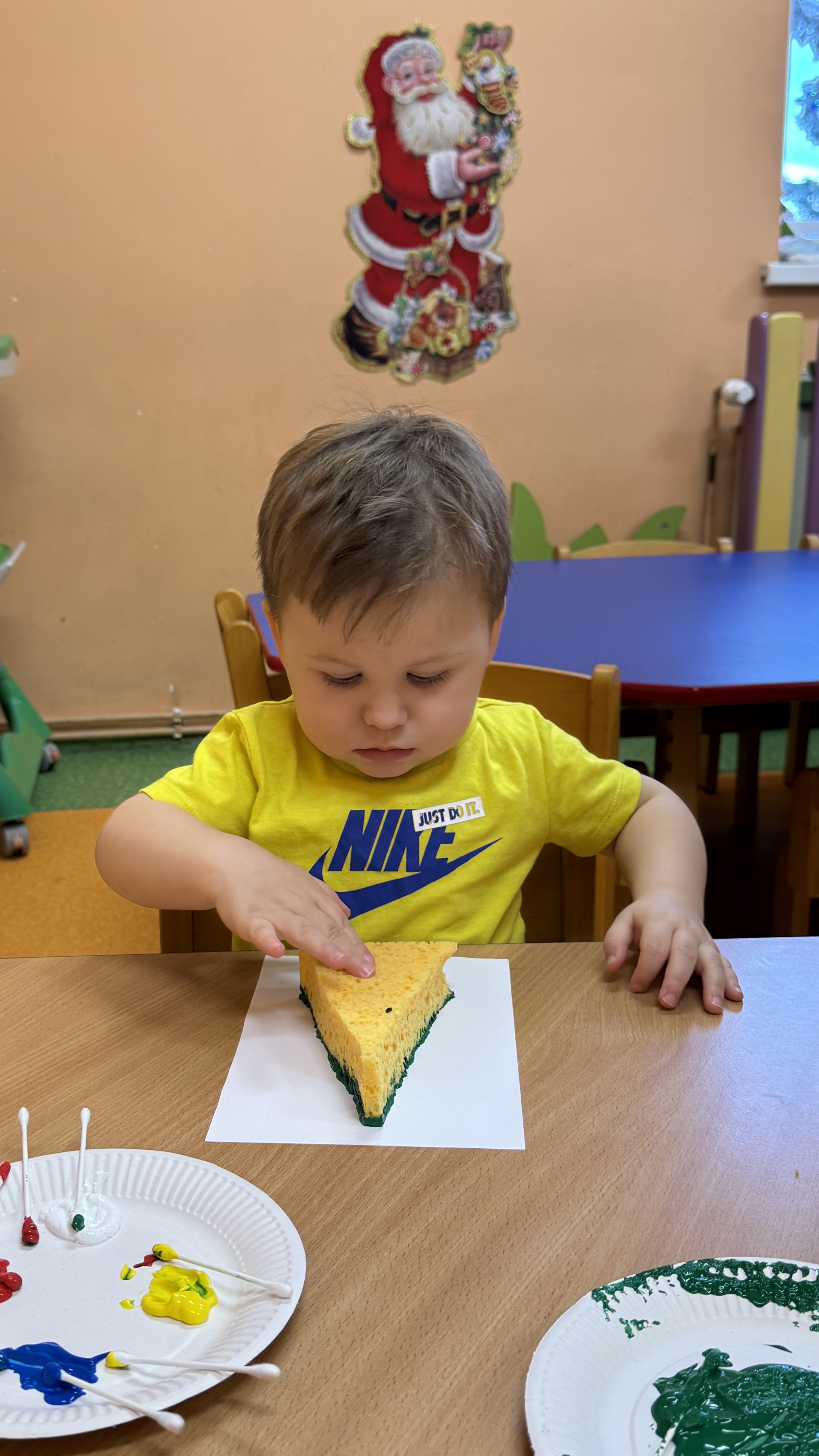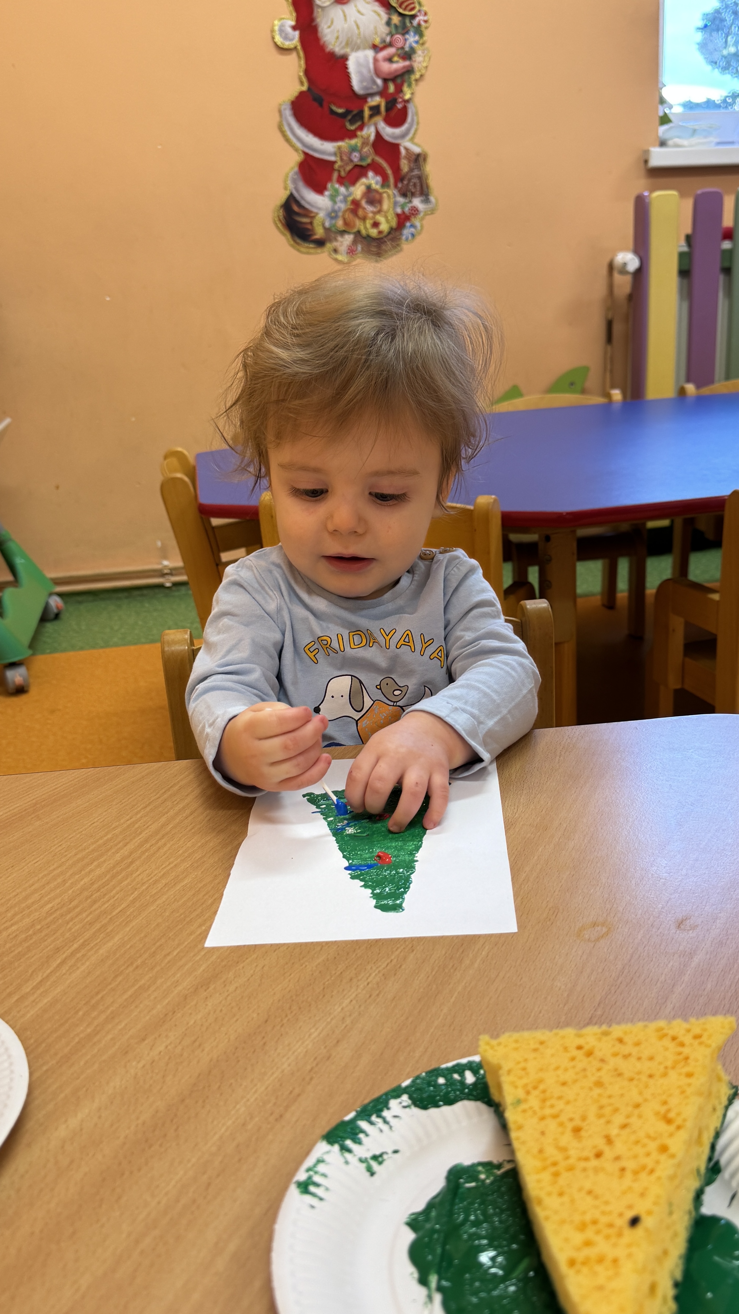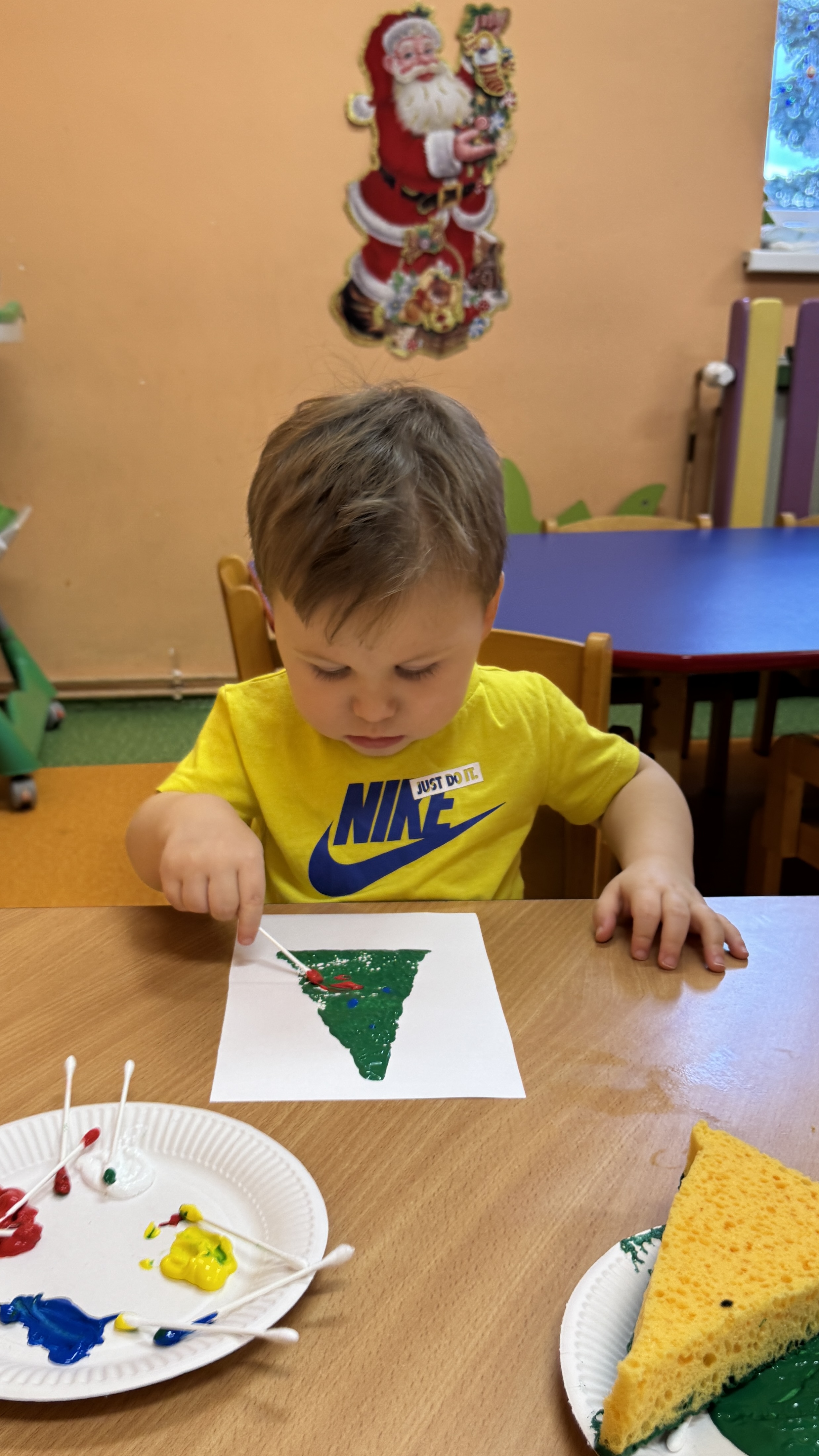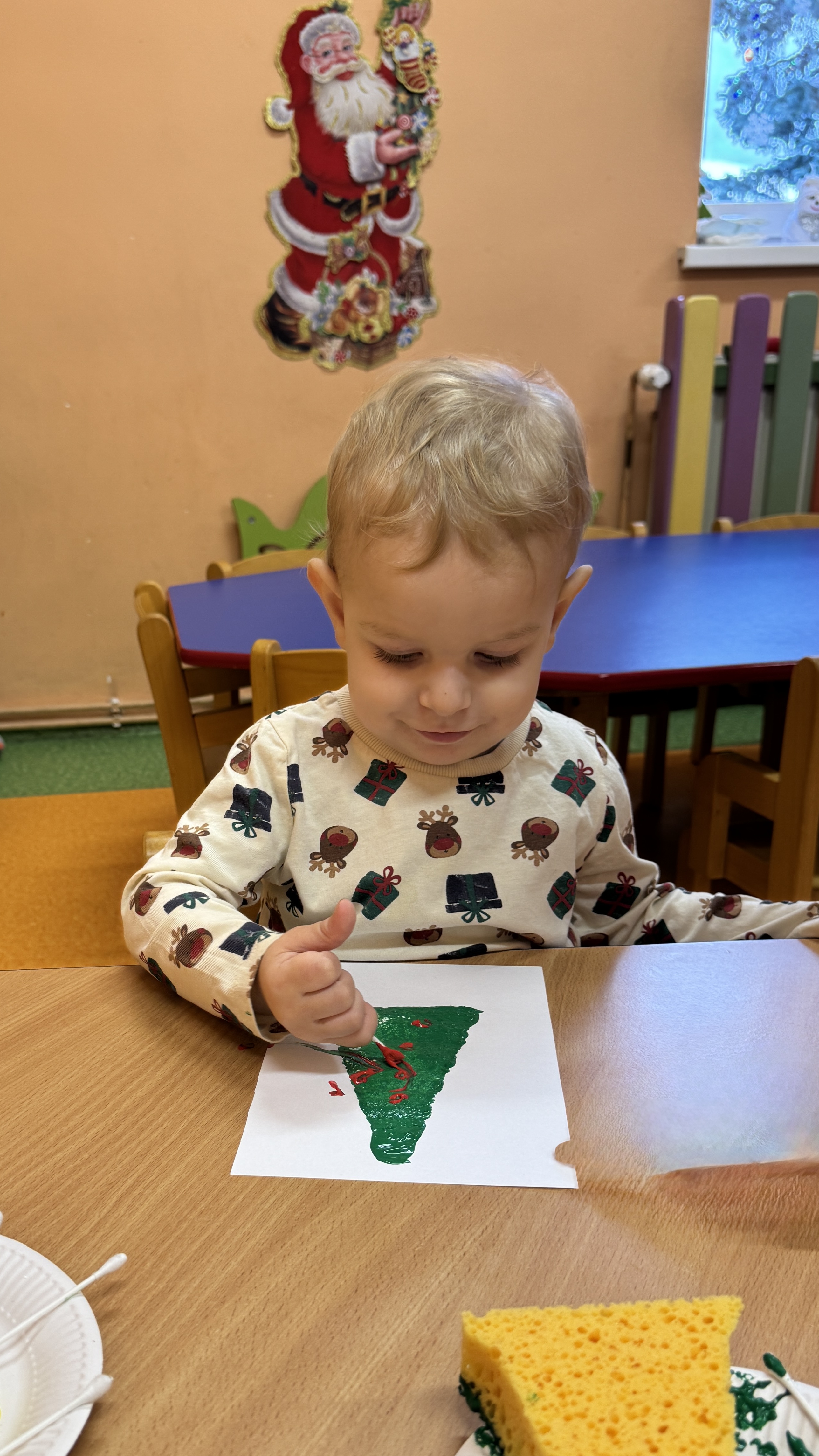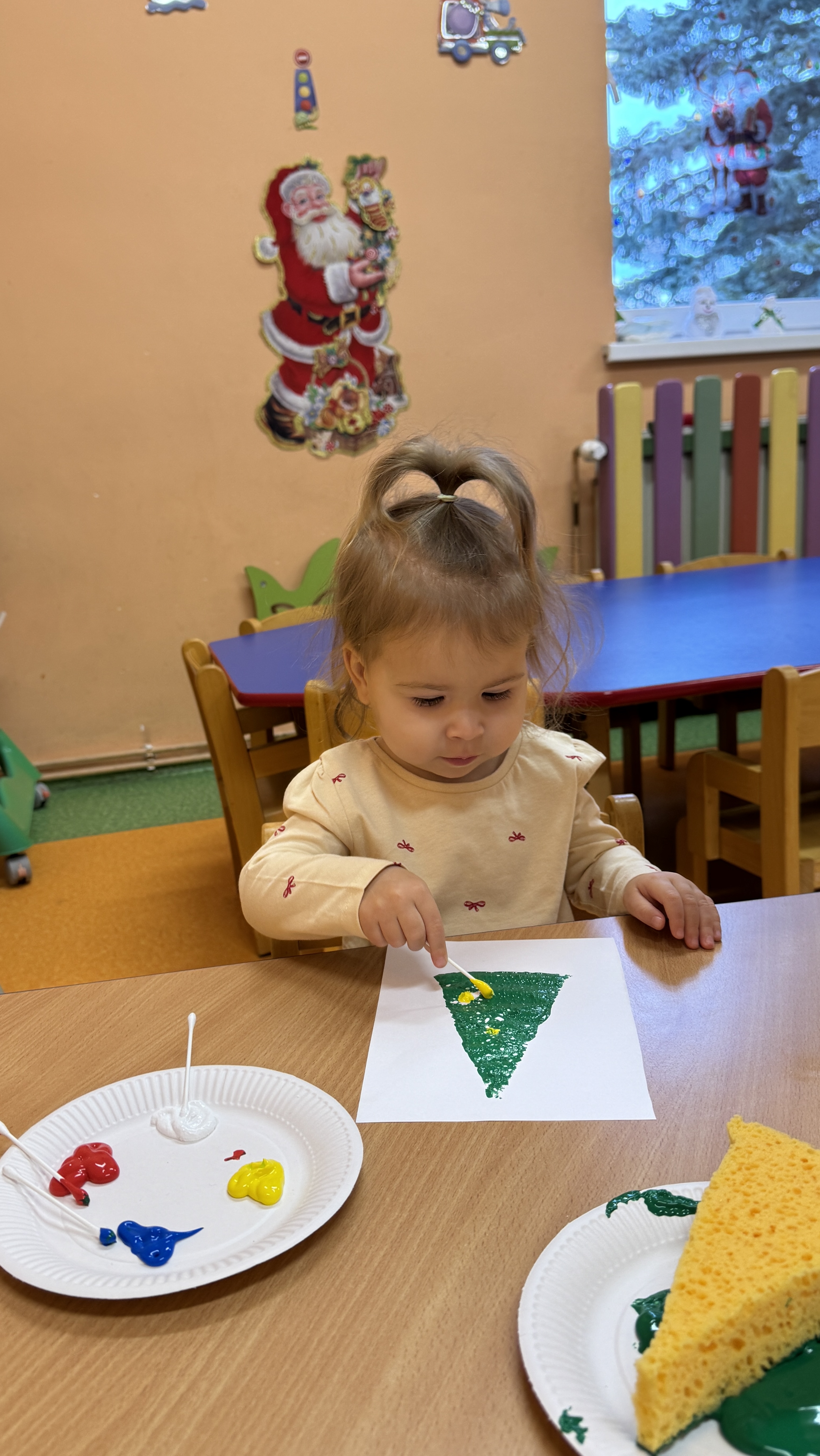Nasze Biedroneczki dziś stemplowały choinki gąbką, ozdabiając je kolorowymi bombkami z patyczków tworząc świąteczne prace plastyczne. Nasze Maluszki rozwijały przy tym sprawność rąk i kreatywność.