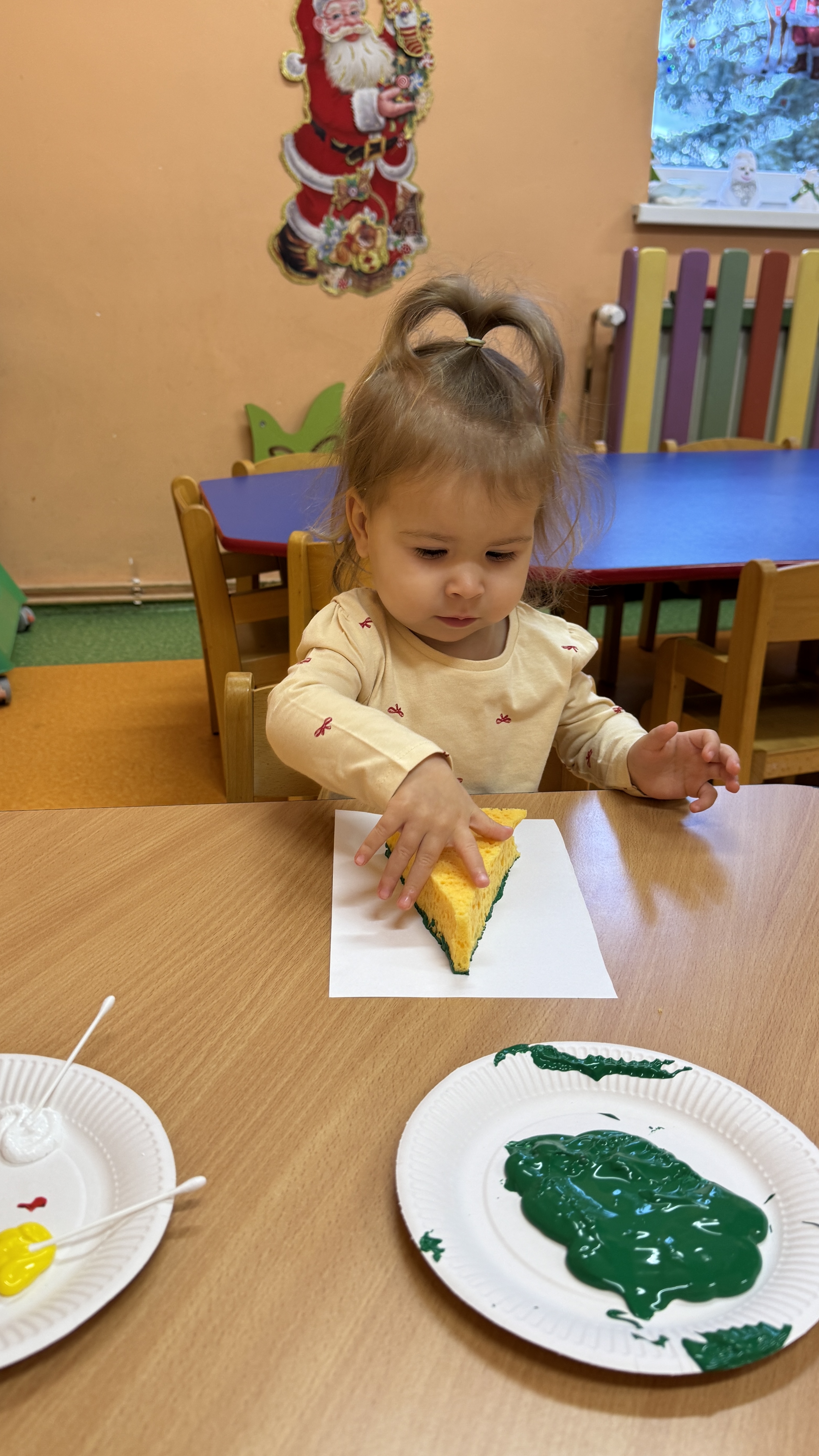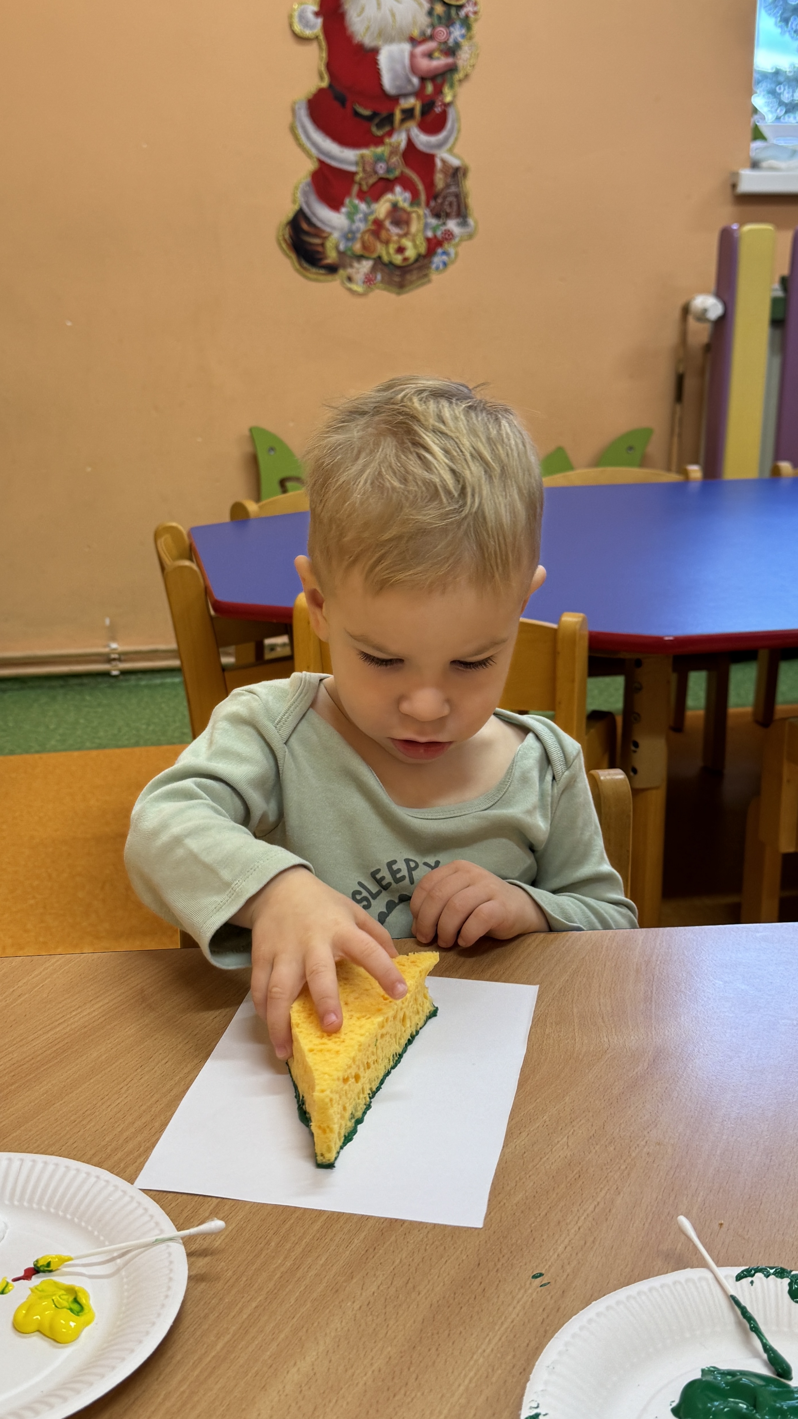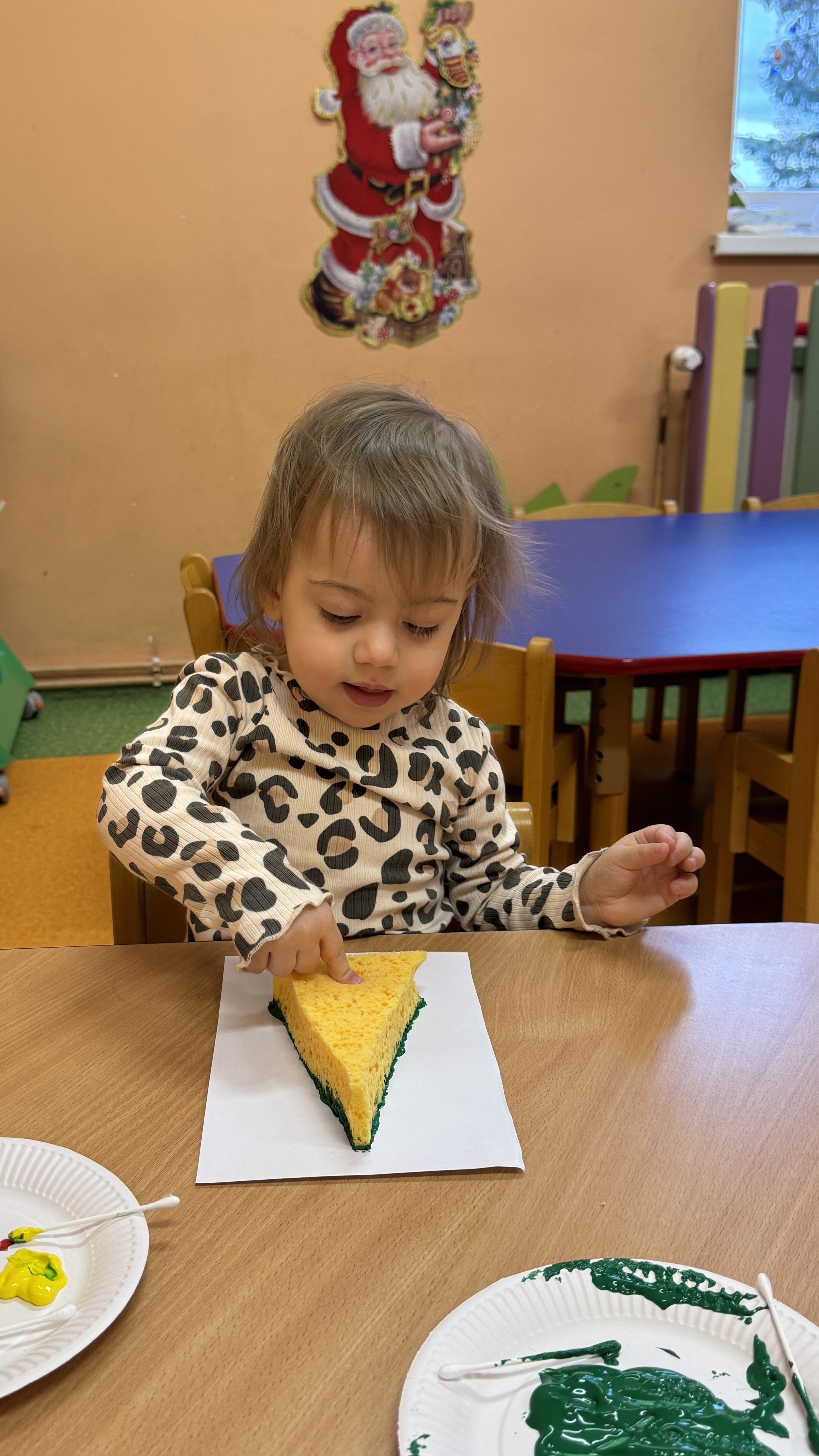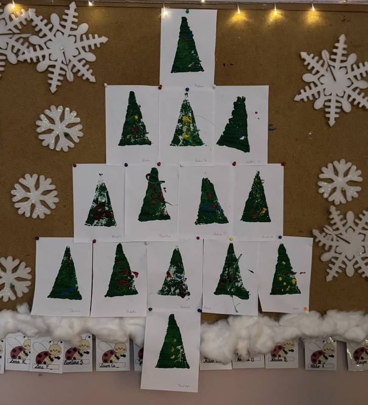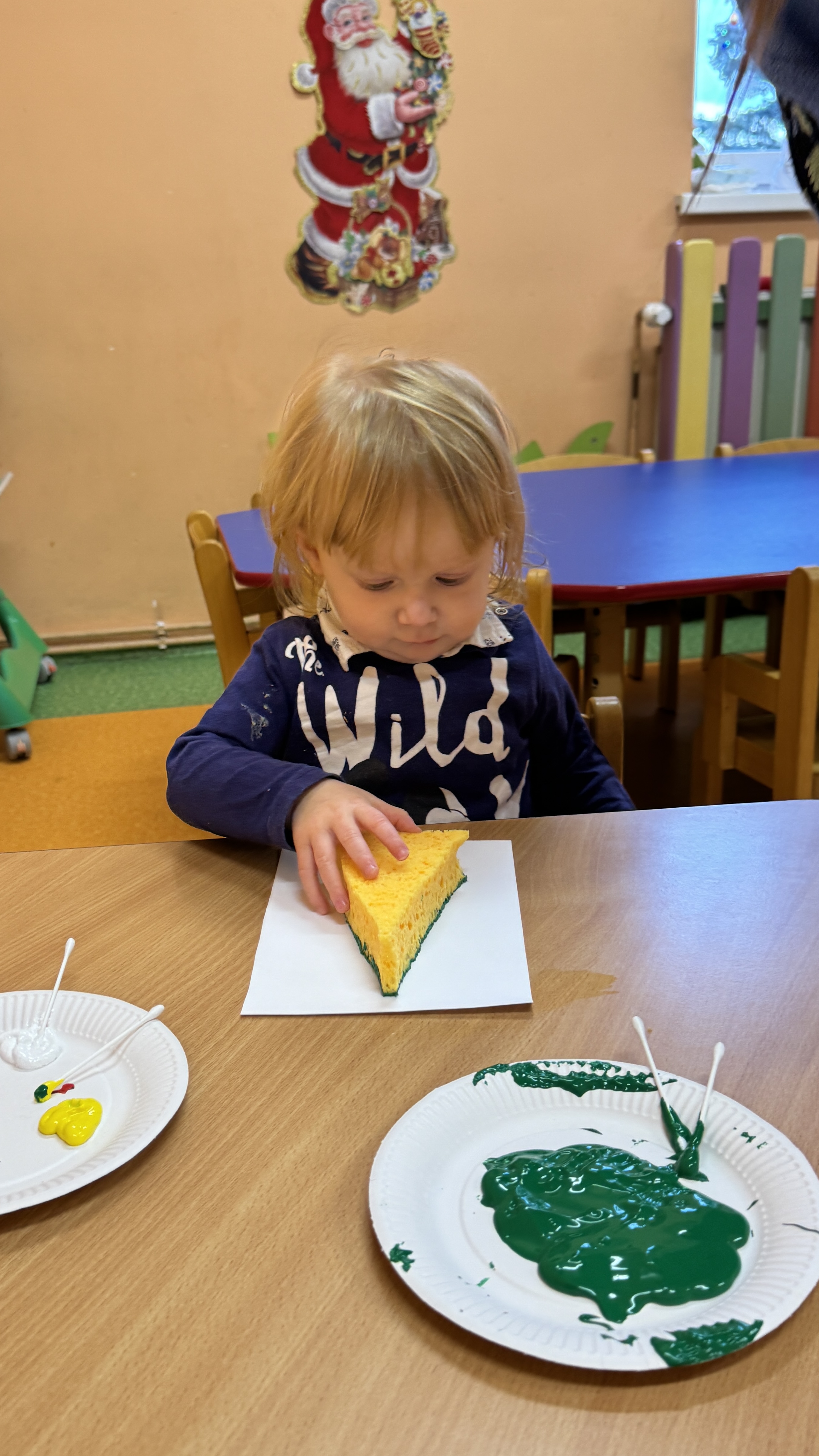 Nasze Biedroneczki dziś stemplowały choinki gąbką, ozdabiając je kolorowymi bombkami z patyczków tworząc świąteczne prace plastyczne. Nasze Maluszki rozwijały przy tym sprawność rąk i kreatywność.