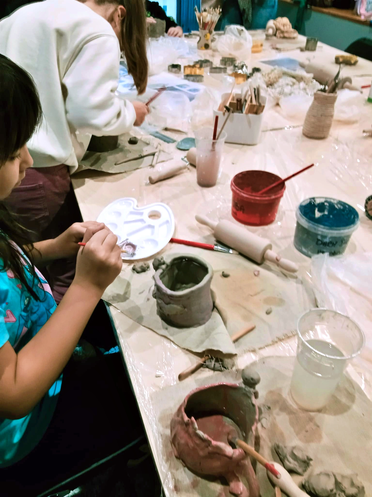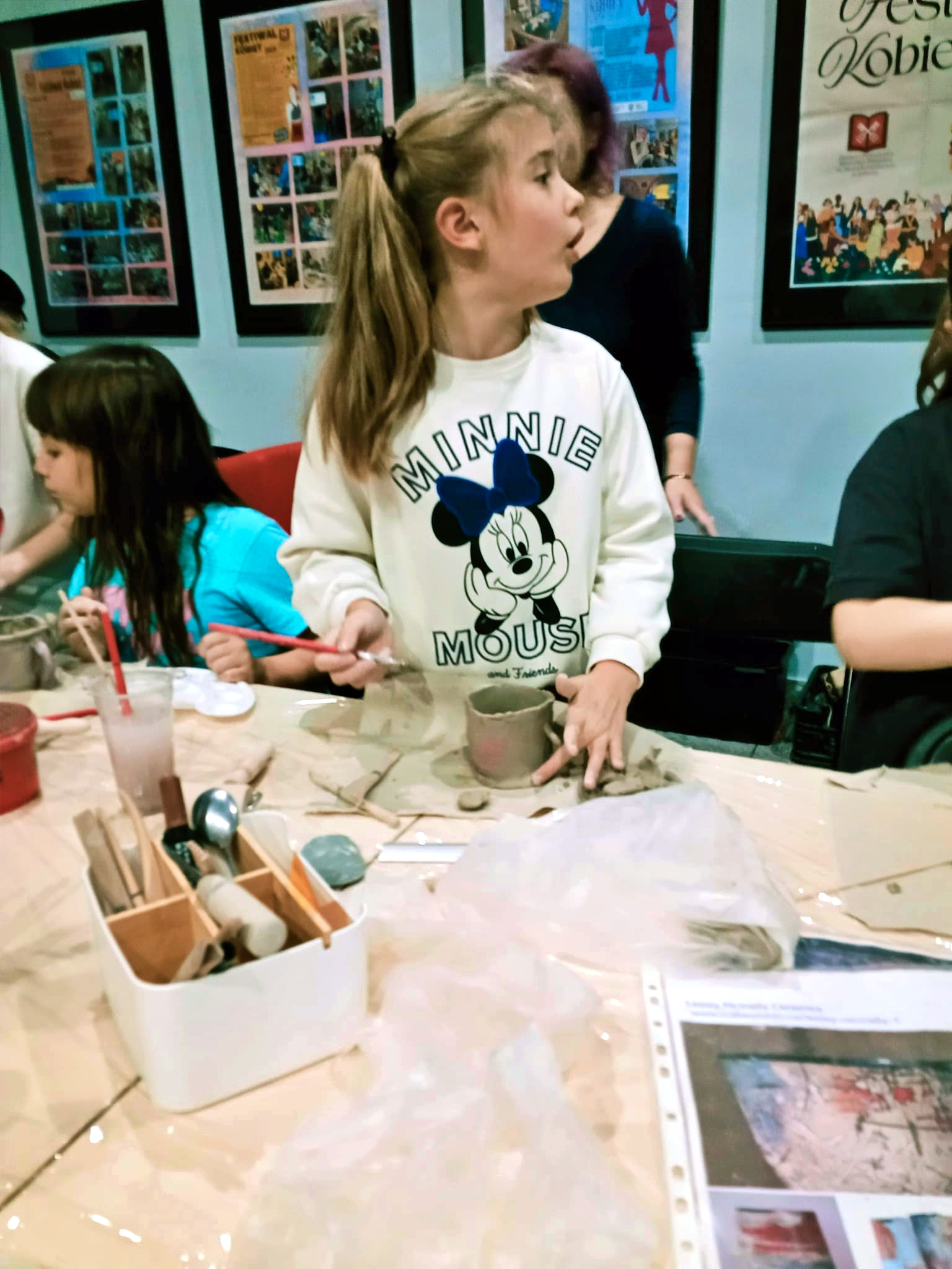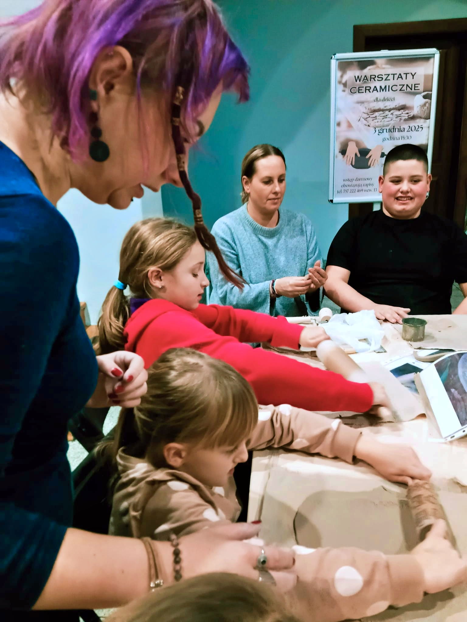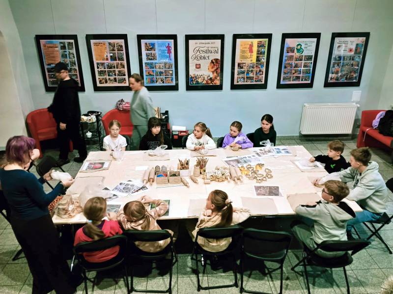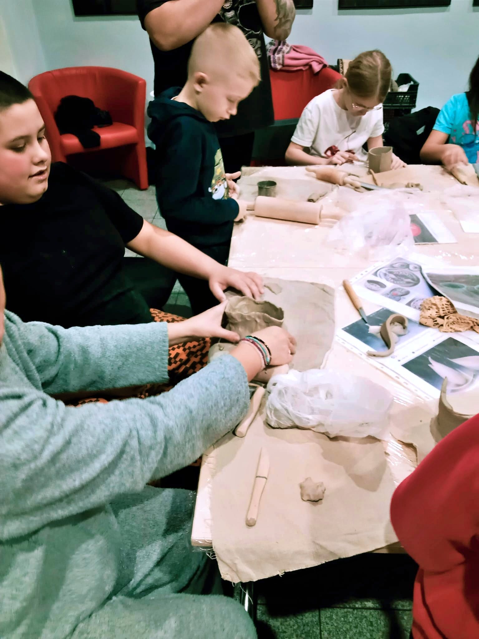 Dzieci od pierwszych chwil z entuzjazmem zanurzyły ręce w glinie, odkrywając jej wyjątkową plastyczność i nieograniczone możliwości twórcze. Pod czujnym okiem prowadzącej uczestnicy lepili, ugniatali, wałkowali i formowali materiał, tworząc własne, niepowtarzalne dzieła. Wśród powstających prac można było zobaczyć zarówno fantastyczne figurki, jak i praktyczne przedmioty codziennego użytku – miseczki, kubeczki czy ozdoby. Prowadząca z ogromną cierpliwością i serdecznością tłumaczyła kolejne etapy pracy, pokazując techniki, których na co dzień nie mają okazji poznać nawet najbardziej kreatywne dzieci. Warsztaty przebiegały w atmosferze radości, skupienia i dobrej zabawy.