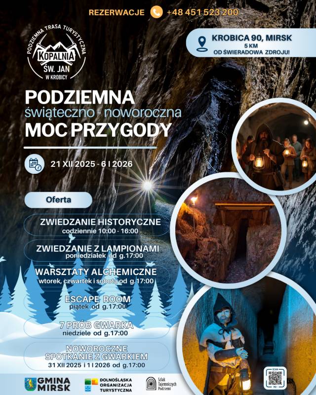 Kopalnia św. Jan w Krobicy to jedyne udostępnione turystycznie podziemia dawnego górnictwa izerskich kruszców – cyny i kobaltu – z tradycją sięgającą niemal 450 lat. W okresie świąteczno-noworocznym to niezwykłe miejsce nabiera jeszcze bardziej ciepłego charakteru. Subtelne światło lampionów oraz wyjątkowa atmosfera sprawiają, że zimowa wizyta staje się najpiękniejszym świątecznym prezentem – przeżyciem, które zapada w pamięć i tworzy wspólne rodzinne wspomnienia.