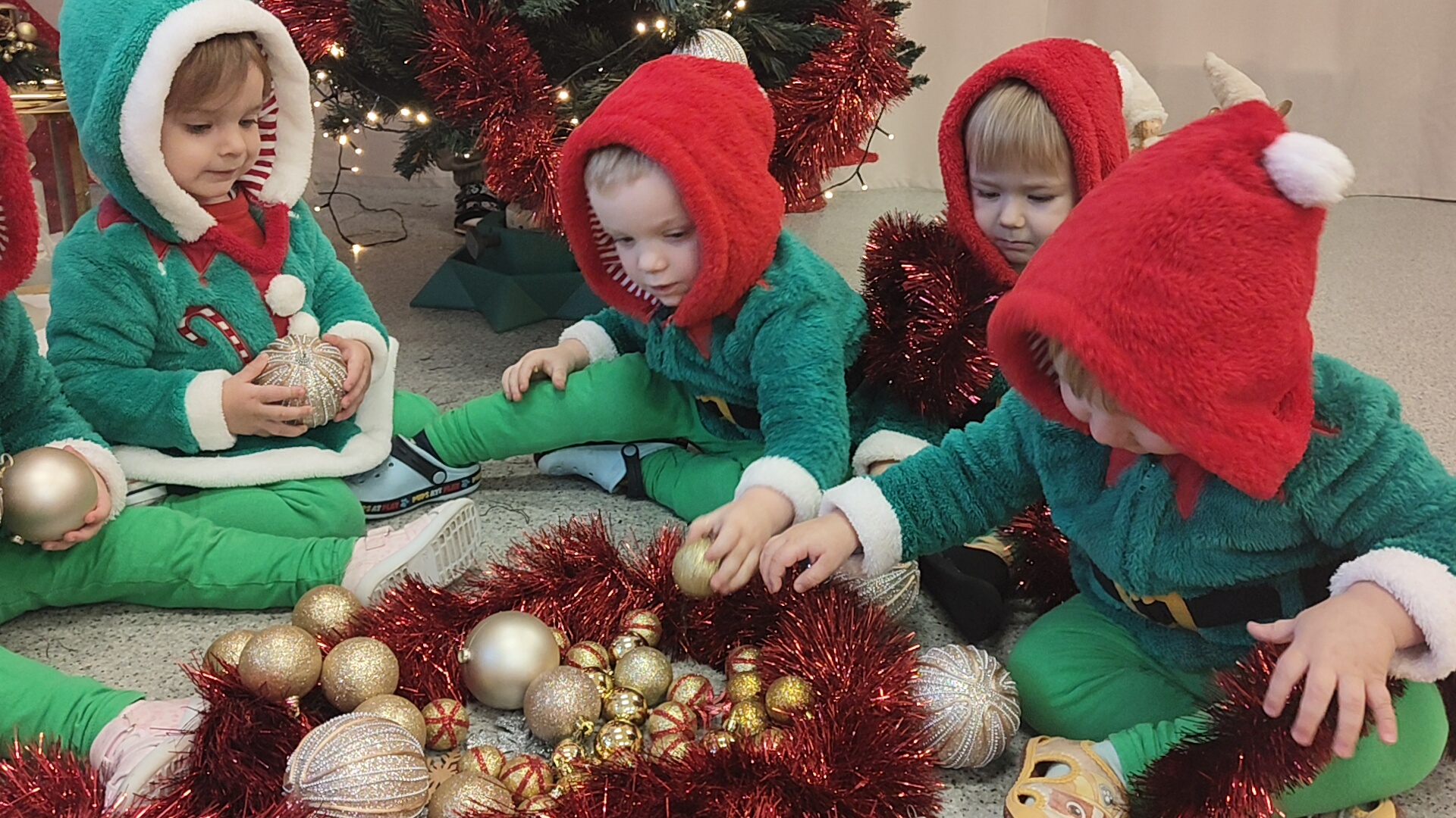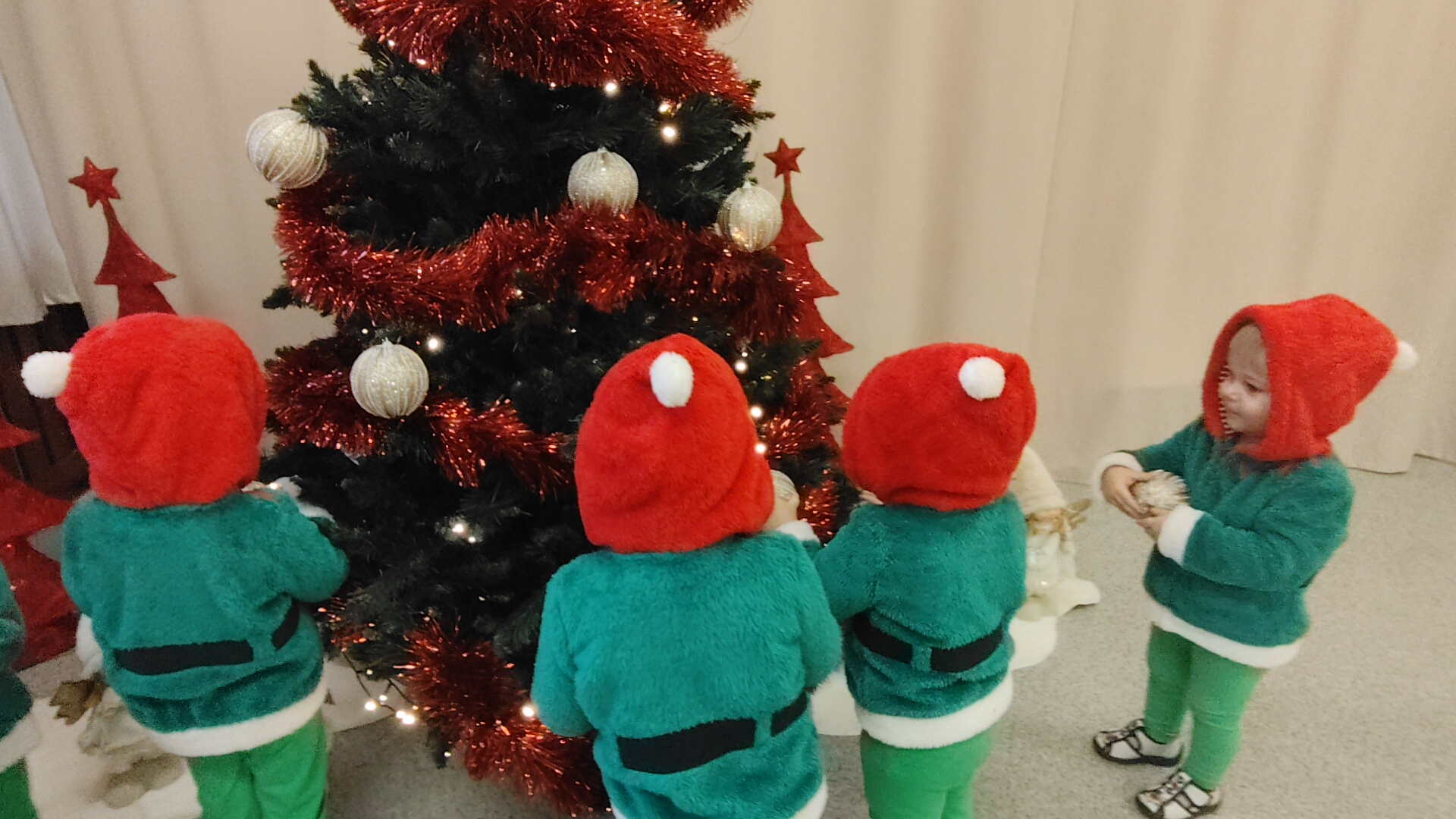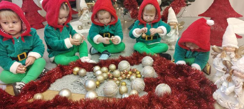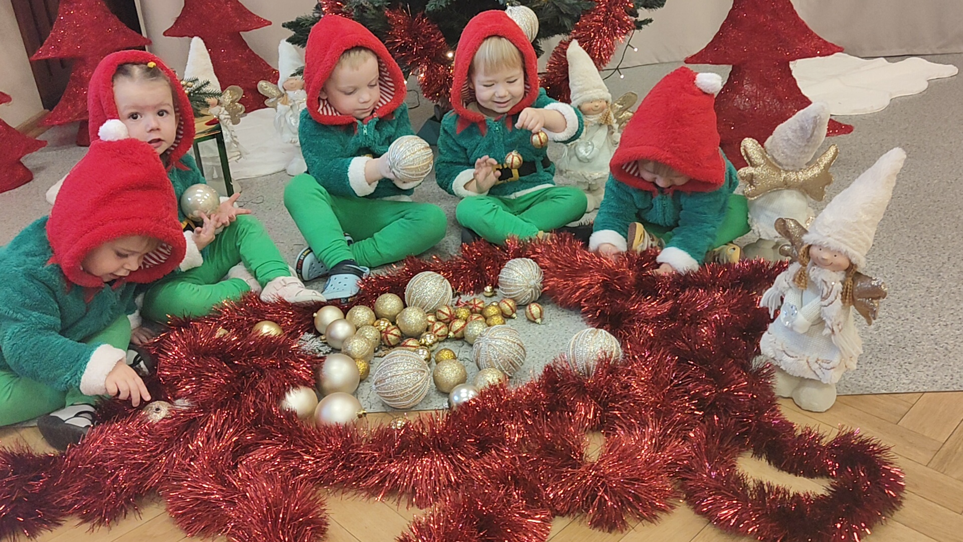Dzieci żłobkowe z radością wspólnie ubierały choinkę ,tworząc prawdziwie świąteczną atmosferę pełną uśmiechów i kolorowych ozdób.
