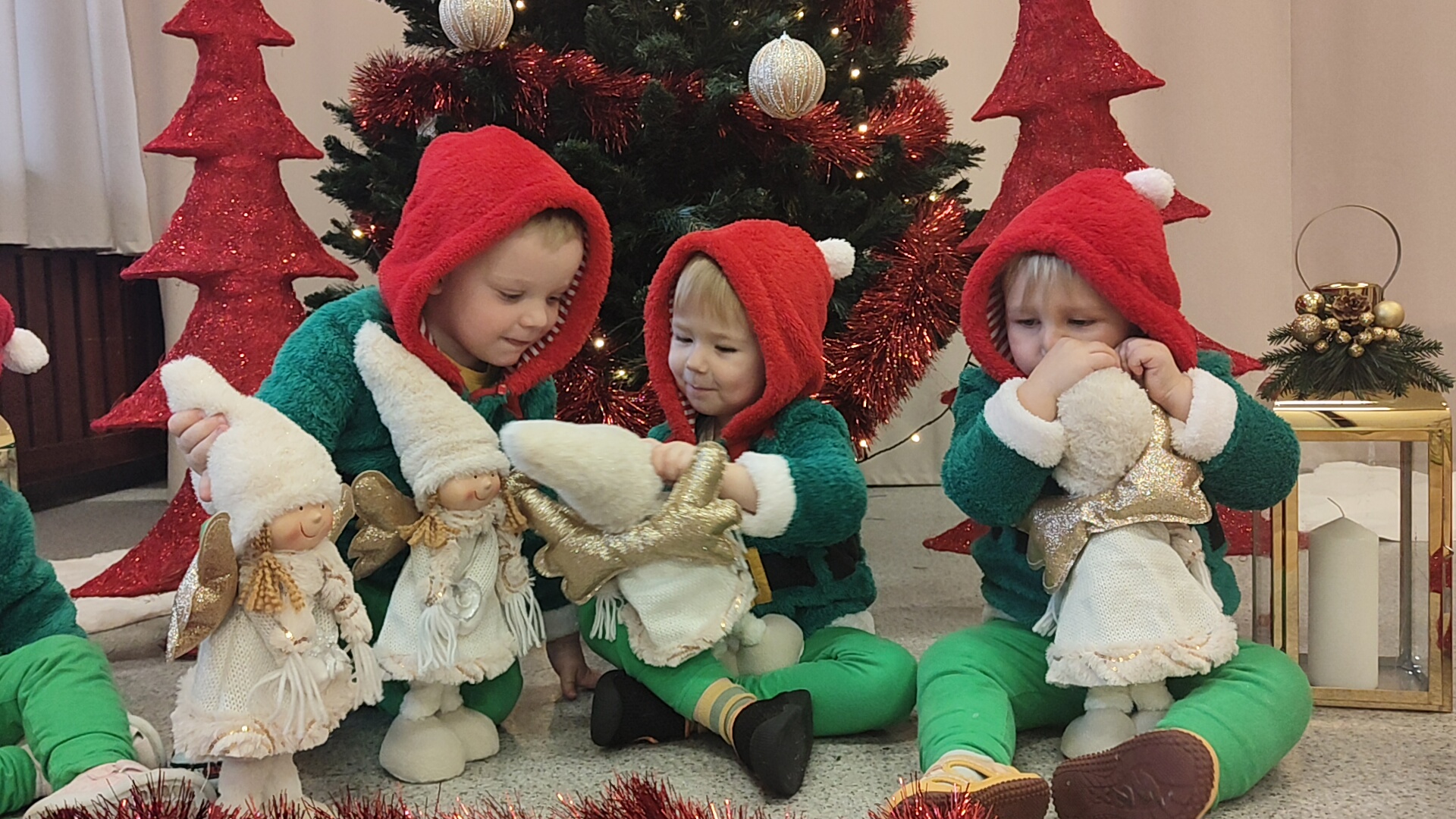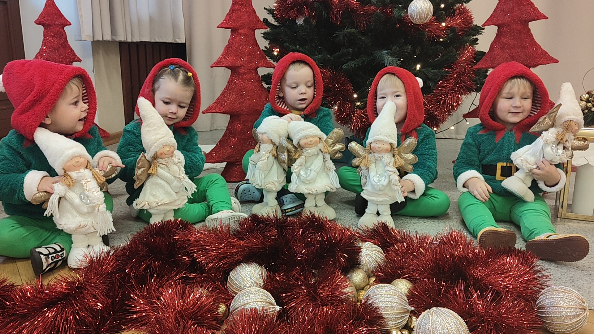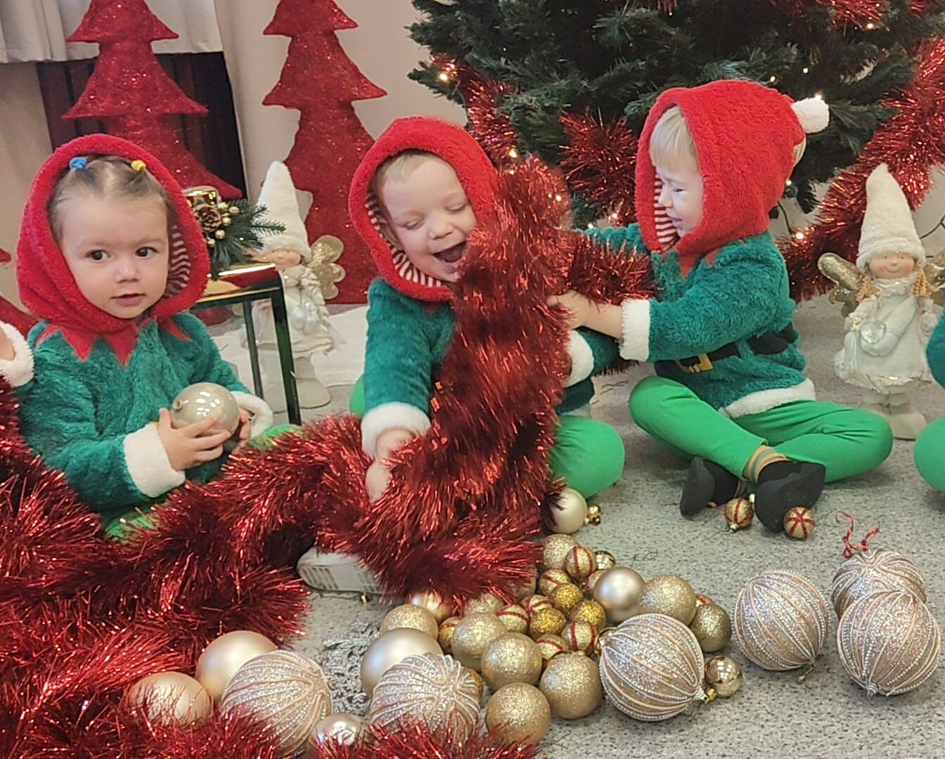 Dzieci żłobkowe z radością wspólnie ubierały choinkę ,tworząc prawdziwie świąteczną atmosferę pełną uśmiechów i kolorowych ozdób.