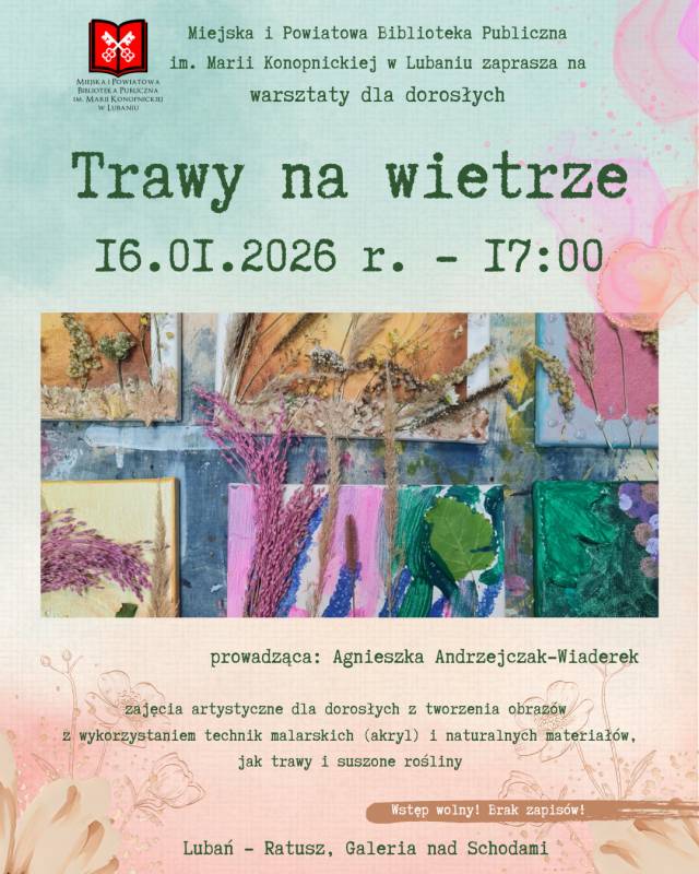 Przyjdź do Galerii nad Schodami 16 stycznia 2026 r. o godz. 17:00 i daj się ponieść naturze. Stwórz obraz, który będzie stworzony pod czujnym okiem profesjonalistki – Pani Agnieszki Andrzejczak-Wiaderek.