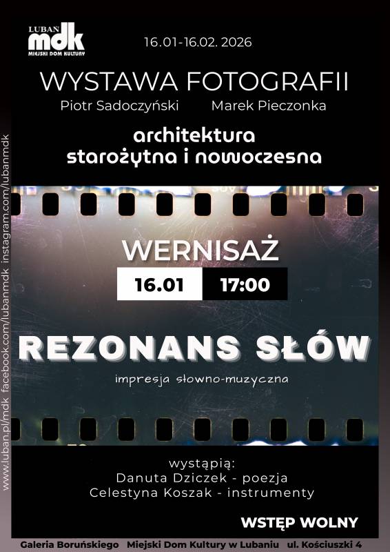 Miejski Dom Kultury w Lubaniu zaprasza na wystawę fotografii Piotra Sadoczyńskiego oraz Marka Pieczonki pt. „Architektura starożytna i nowoczesna”. Ekspozycja będzie dostępna dla zwiedzających w dniach 16 stycznia – 16 lutego 2026 roku w Galerii Boruńskiego.