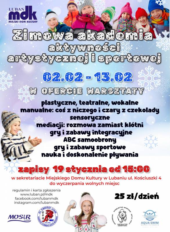 Miejski Dom Kultury w Lubaniu zaprasza dzieci do udziału w Zimowej Akademii Aktywności Artystycznej i Sportowej, która odbędzie się w czasie ferii zimowych – od 2 do 13 lutego.