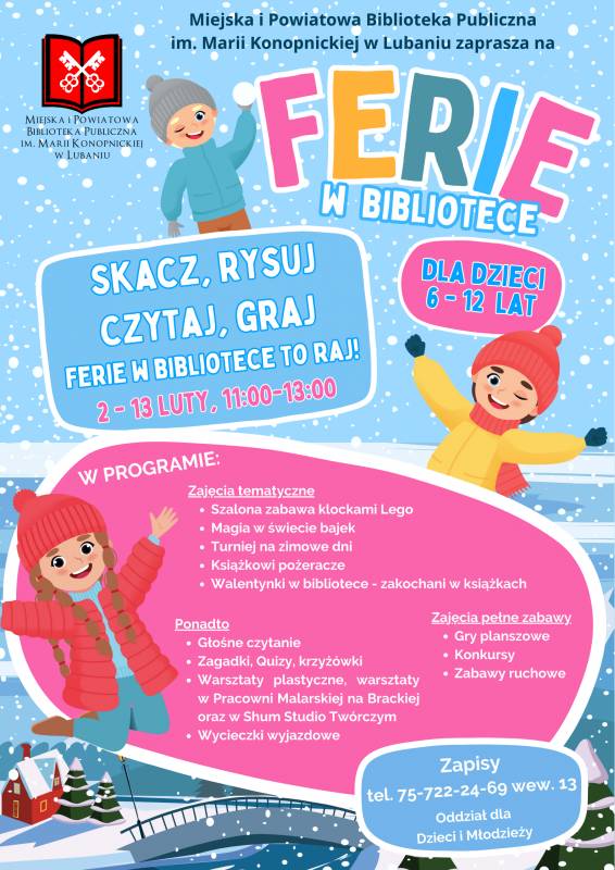 Miejska i Powiatowa Biblioteka Publiczna im. Marii Konopnickiej w Lubaniu, Oddział dla Dzieci i Młodzieży, zaprasza rodziców i opiekunów do zapisów na zorganizowane zajęcia feryjne dla dzieci w wieku 6–12 lat.