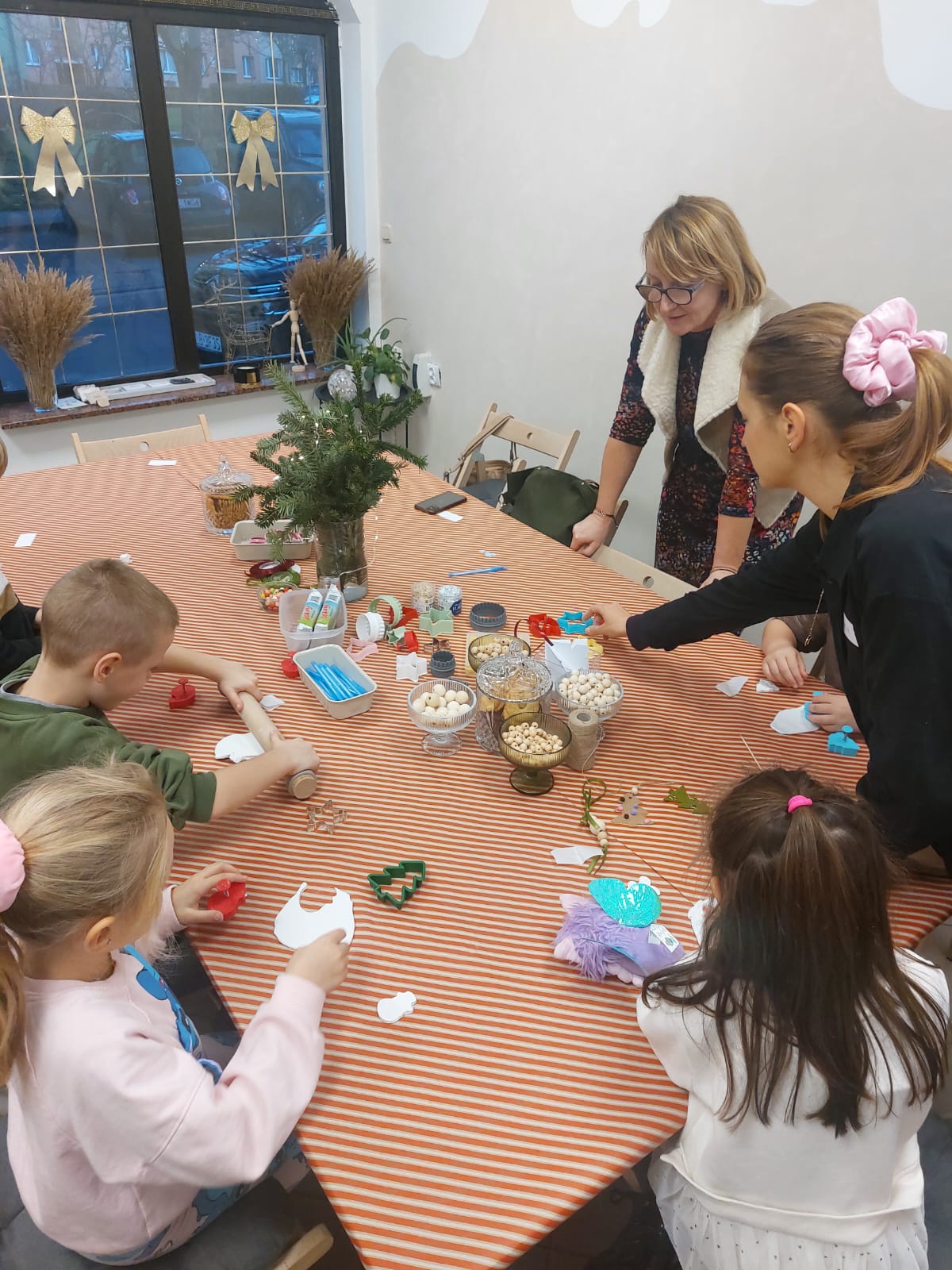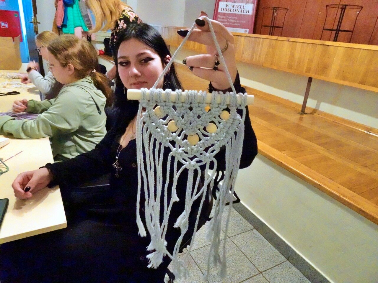 Biblioteka skorzystała z tej oferty uczestnicząc w warsztatach wyplatania makramy i tworzenia ozdób świątecznych, które wymagały dużo cierpliwości. Na początku dzieci pracowały z samoutwardzalną gliną modelarską, z której przy użyciu foremek powstały piękne zawieszki na choinkę. Następnie tworzyły tekturowe choinki, dekorując je kolorowymi pomponikami. Kolejnym etapem było składanie papierowych śnieżynek metodą origami, które wymagały skupienia i precyzji. Na zakończenie dzieci wykonały delikatne ozdoby z makramy.