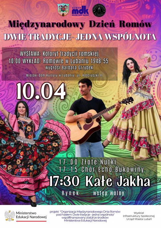 10 kwietnia w Lubaniu odbędą się obchody Międzynarodowego Dnia Romów - święta podkreślającego bogactwo kultury romskiej oraz znaczenie dialogu międzykulturowego. Tegoroczne wydarzenia odbywają się pod hasłem „Dwie tradycje – jedna wspólnota” i łączą część edukacyjną z programem artystycznym skierowanym do mieszkańców miasta i gości. Organizatorzy zapraszają zarówno do udziału w wydarzeniach odbywających się w Miejskim Domu Kultury w Lubaniu, jak i na wieczorne koncerty plenerowe na lubańskim Rynku.