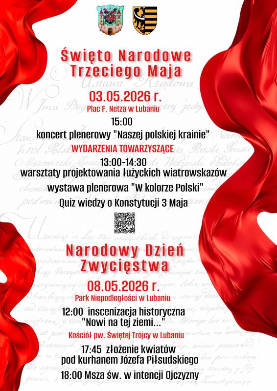 Zapraszamy także do udziału w obchodach Narodowego Dnia Zwycięstwa, które odbędą się 8 maja 2026 roku. O godzinie 12:00 w Parku Niepodległości w Lubaniu zaplanowano inscenizację historyczną „Nowi na tej ziemi…”. Następnie o godzinie 17:45 przy Kościele pw. Świętej Trójcy w Lubaniu odbędzie się złożenie kwiatów pod kurhanem Józefa Piłsudskiego, a o godzinie 18:00 msza święta w intencji Ojczyzny.